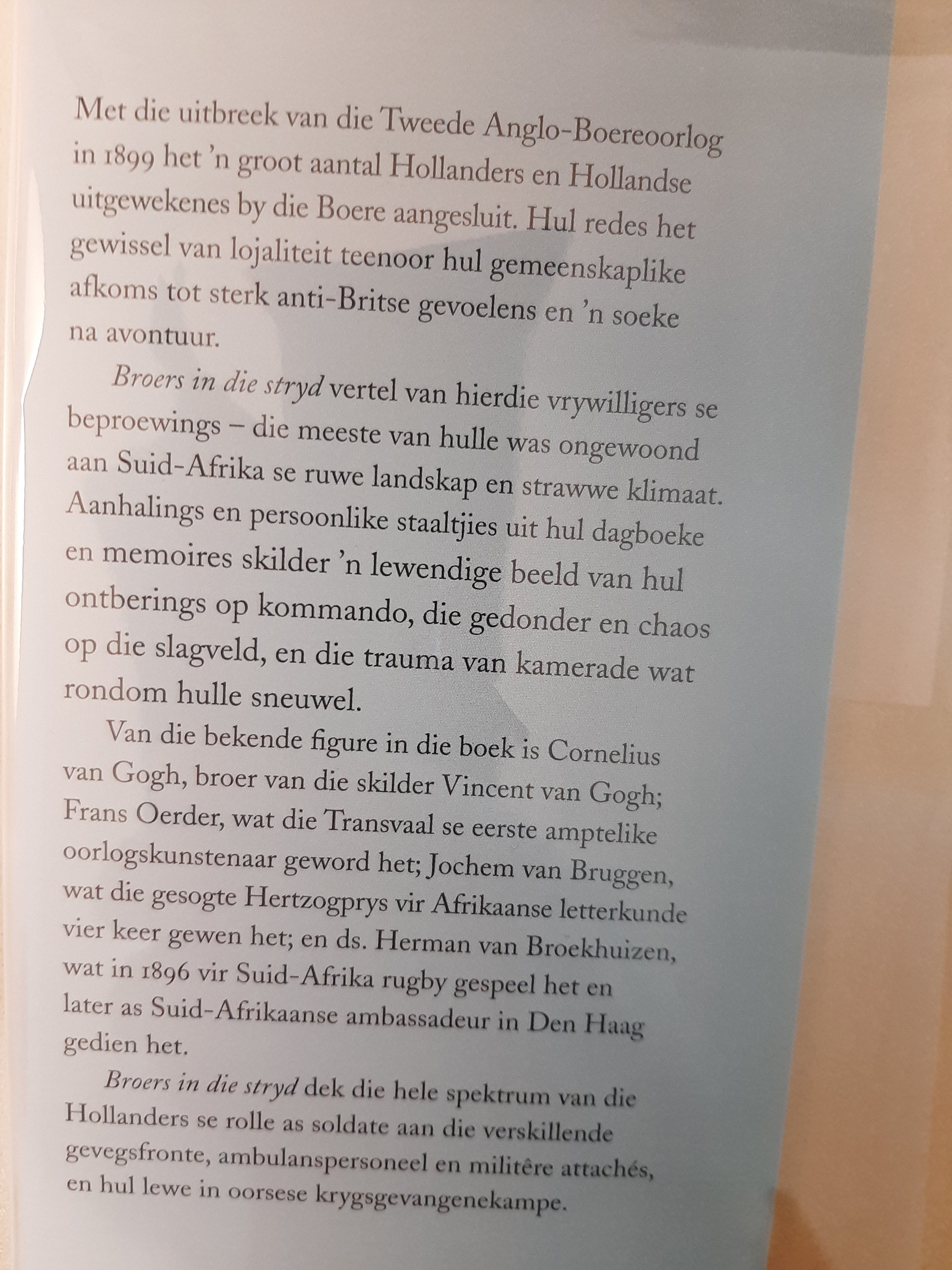 Van die bekende figure in die boek is Cornelius van Gogh, broer van die skilder Vincent van Gogh; Frans Oerder, wat die Transvaal se eerste amptelike oorlogskunstenaar geword het; Jochem van Bruggen, wat die gesogte Hertzogprys vir Afrikaanse letterkunde vier keer gewen het; en ds. Herman van Broekhuizen, wat in 1896 vir Suid-Afrika rugby gespeel het en later as Suid-Afrikaanse ambassadeur in Den Haag gedien het.