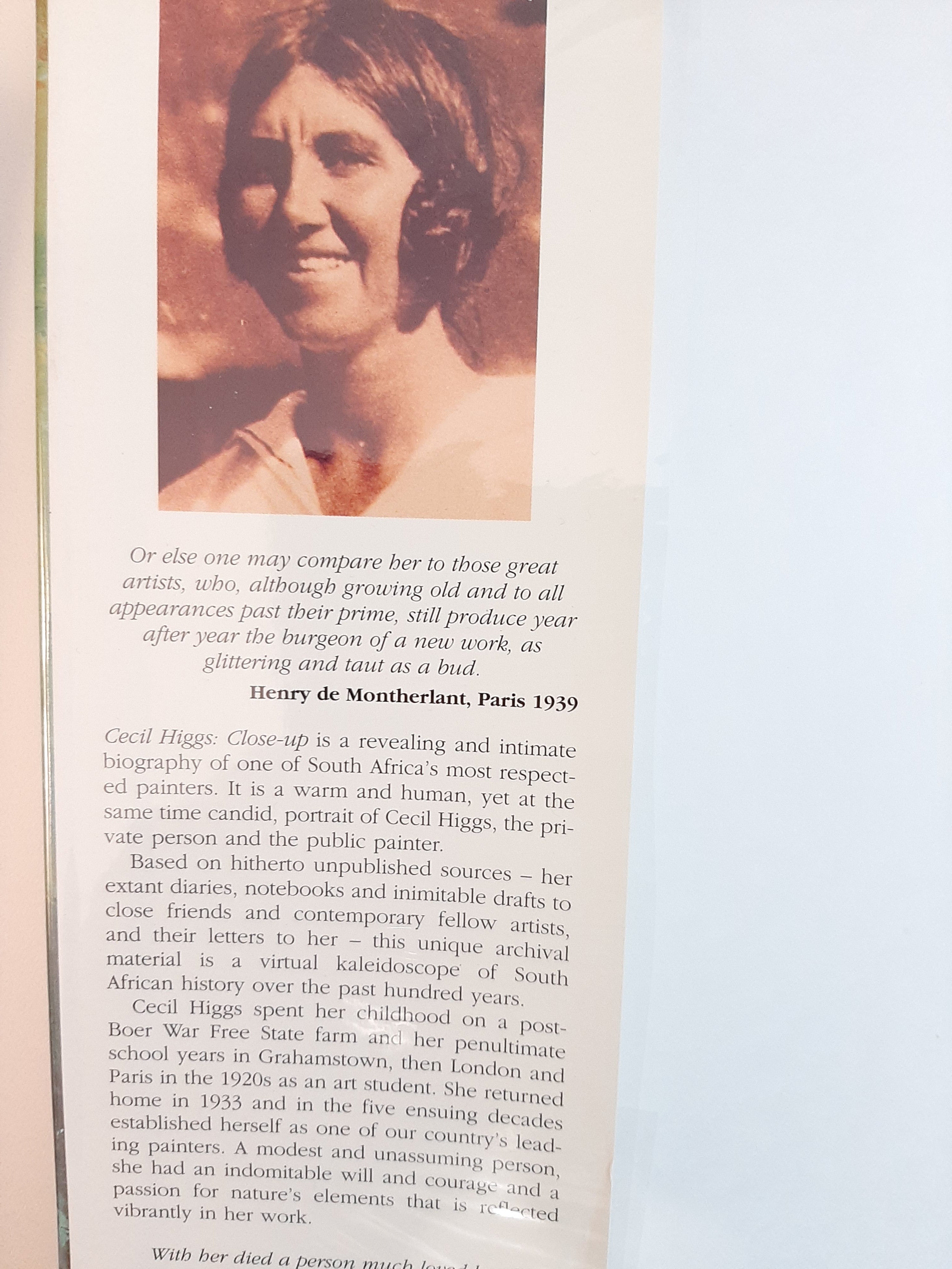 Cecil Higgs spent her childhood on a post-Boer War Free State farm and her penultimate school years in Grahamstown, then London and Paris in the 1920s as an art student. She returned home in 1933 and in the five ensuing decades established herself as one of our countrys leading painters. A modest and unassuming person, she had an indomitable will and courage, and a passion for natures elements that is reflected vibrantly in her work.