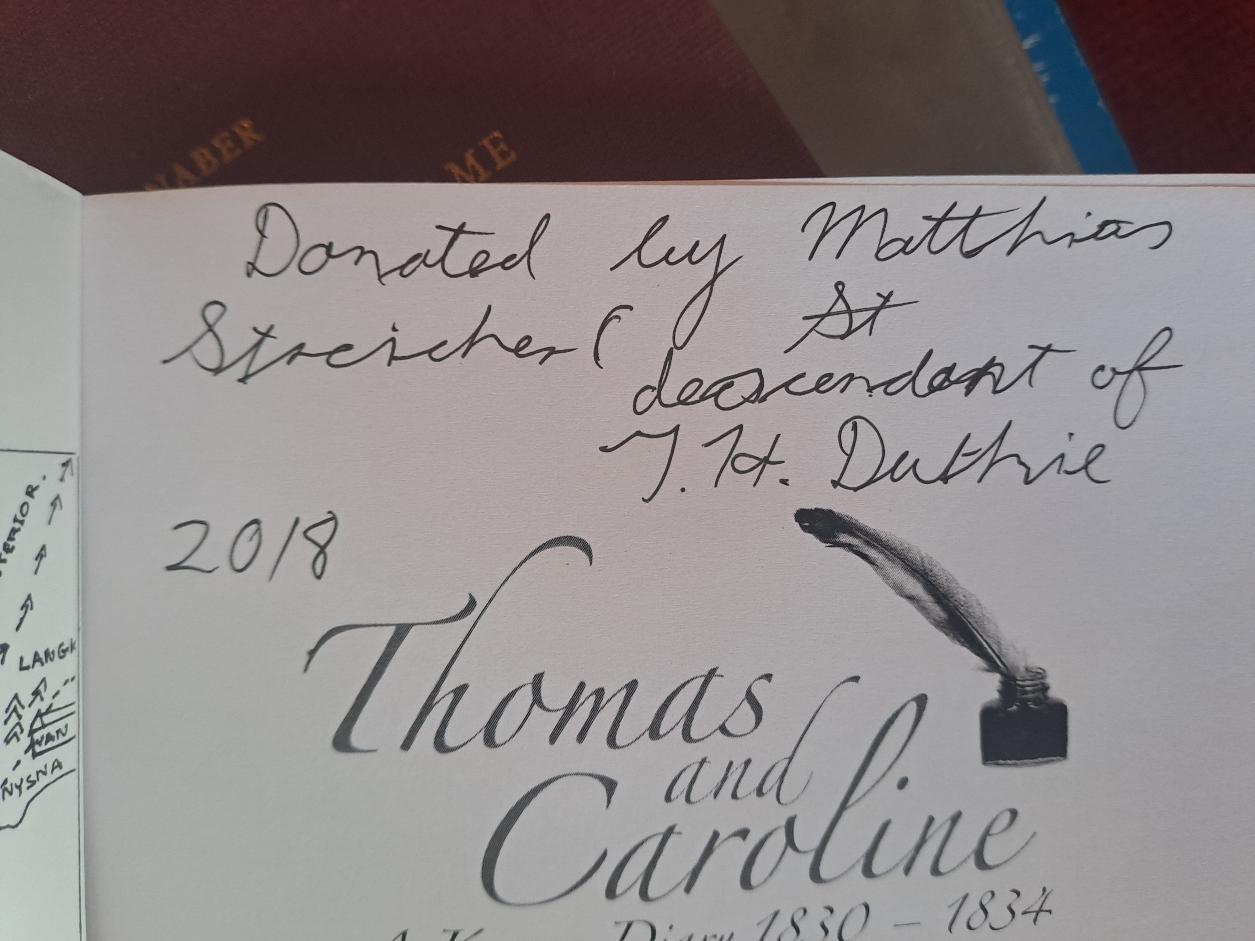 Book inscribed, donated and signed by Matthias Streicher, a descendant of Thomas Henry Duthie