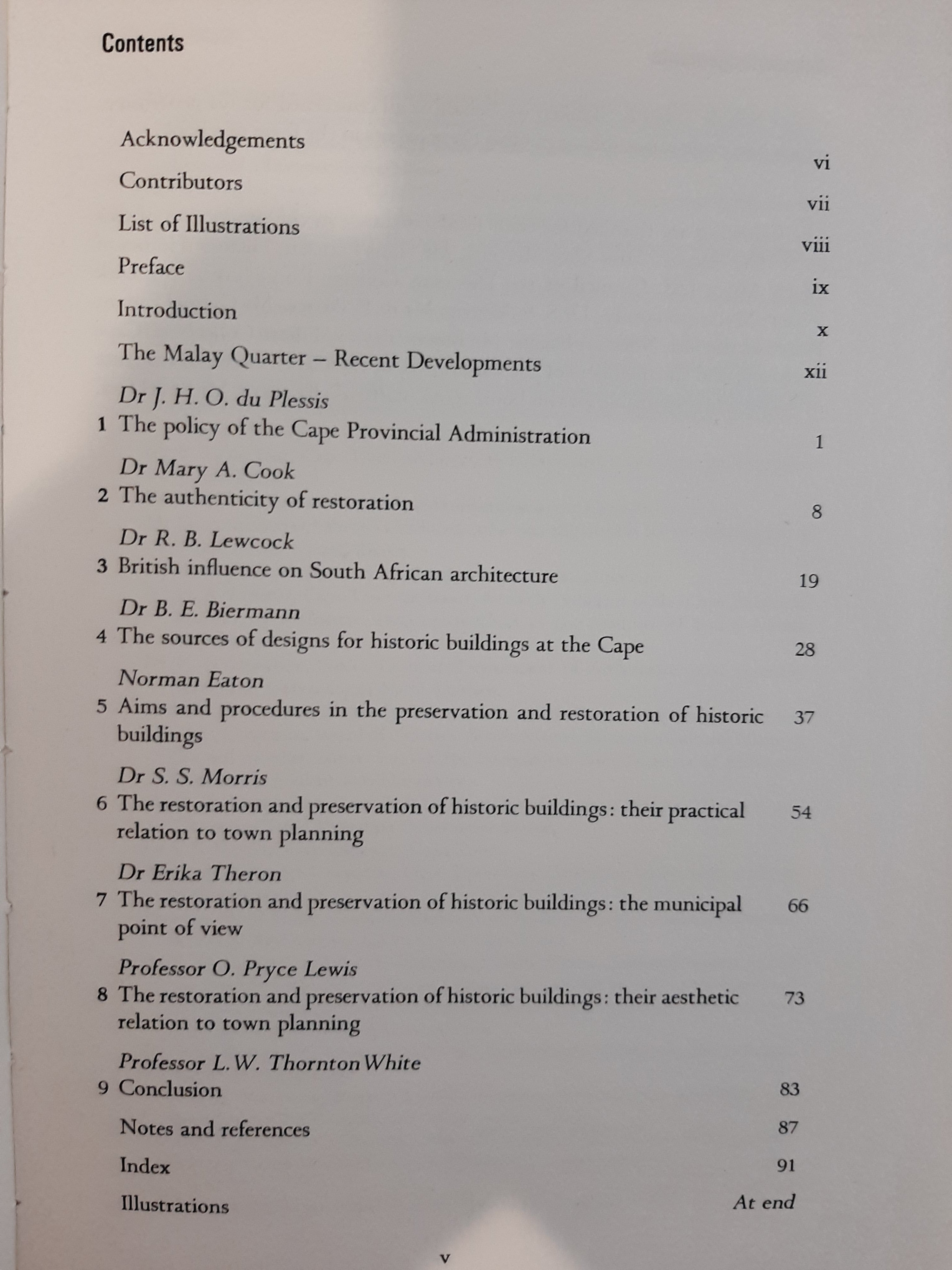Acknowledgements - Count Natale Labia who, through grant, made possible the publication of the papers delivered in 1959 11 16-27 at the Symposium for the Preservation and Restoration of Historic Buildings held in the Old Supreme Court, Cape Town with the collaboration of the above institutions assisted by the South African Museum "to encourage the correct restoration of worthwhile buildings in their context". Proofs, correspondence, etc., of book on preservation and restorations of historic buildings in South Africa