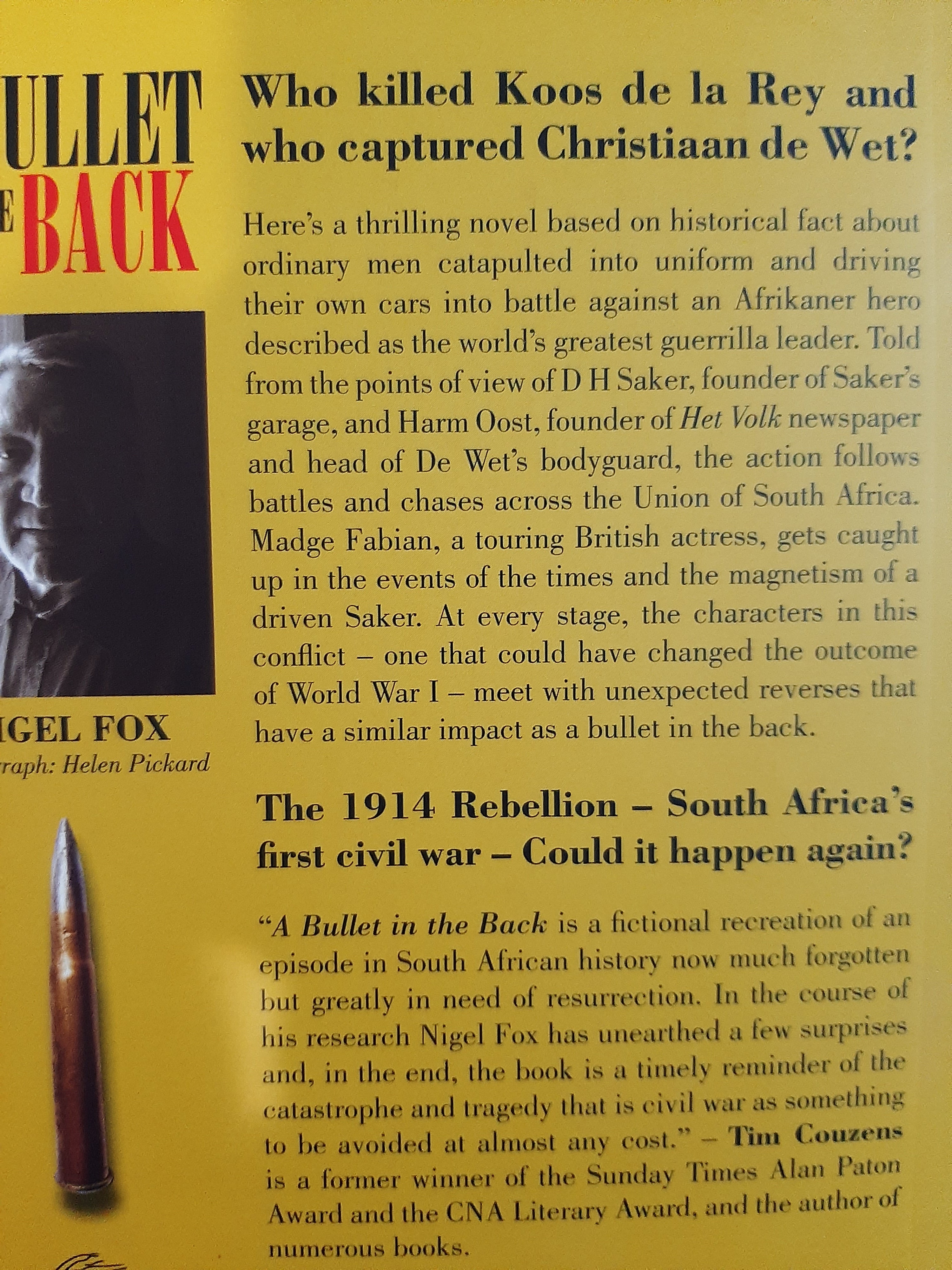 Endorsement: "A Bullet in the Back is a fictional recreation of an episode in South African history now much forgotten but greatly in need of resurrection. In the course of his research Nigel Fox has unearthed a few surprises and, in the end, the book is a timely reminder of the catastrophe and tragedy that is civil war as something to be avoided at almost any cost."