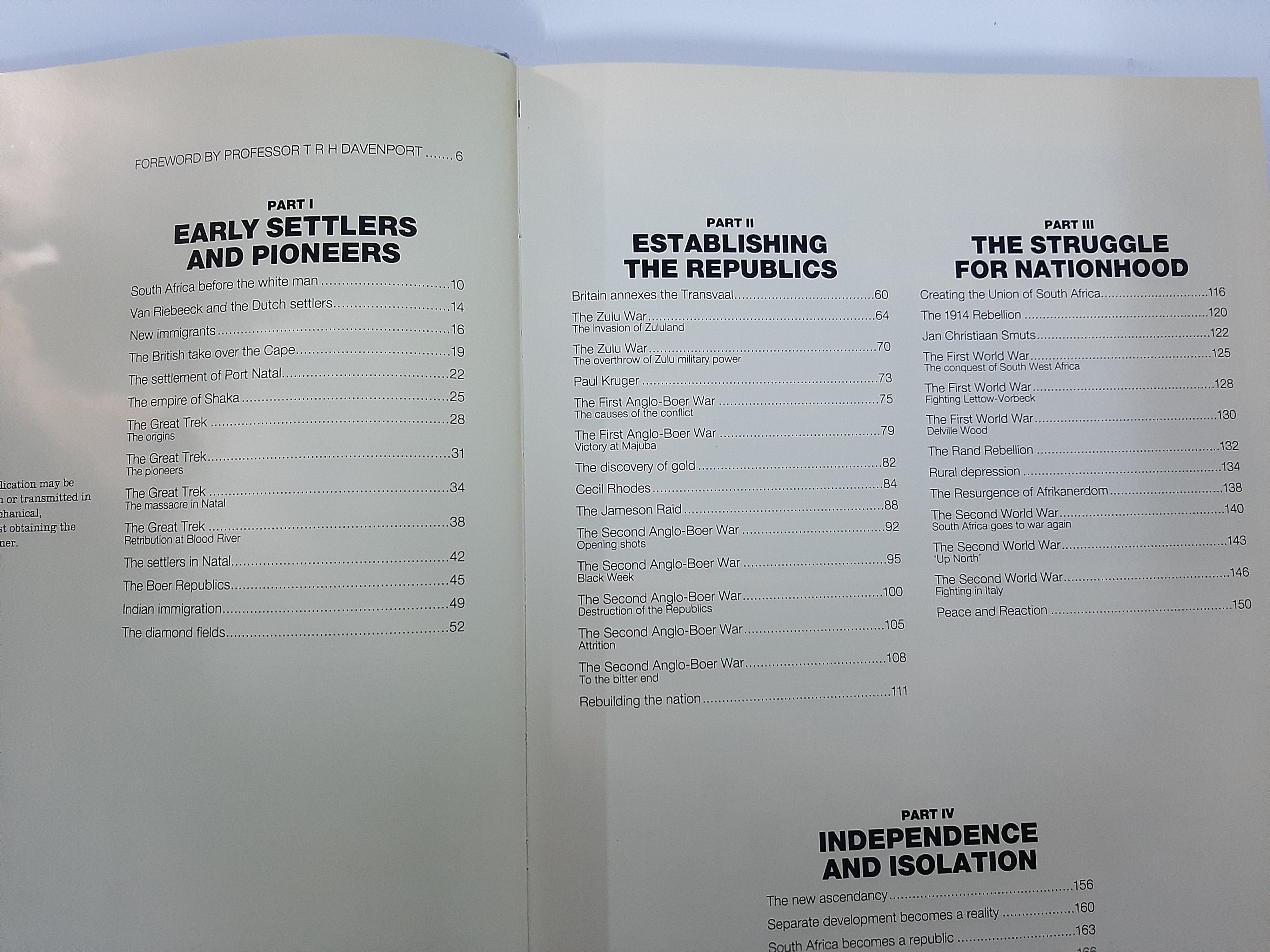 Early settlers and pioneers (The Great Trek) - Establishing the Republics (The Zulu War, Anglo-Boer War) - The struggle for nationhood - Independence and isolation.; Apartheid - Pass laws.