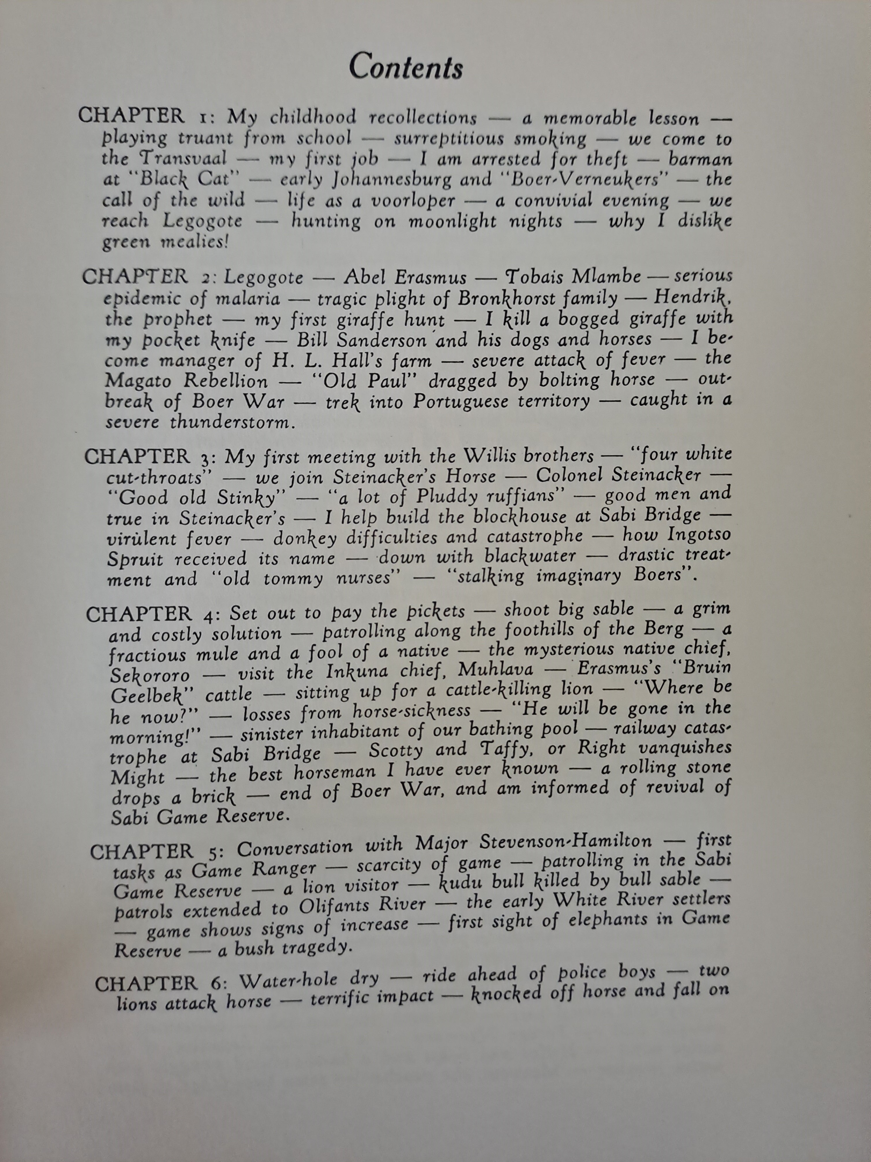 -"The autobiography of one of South Africa's first game rangers. But even before that, he lived a life packed with incident and adventure as a barman, carter, trader, cattle rancher, farm manager, soldier and hunter, before he realised that animals needed protection, and became a game ranger in