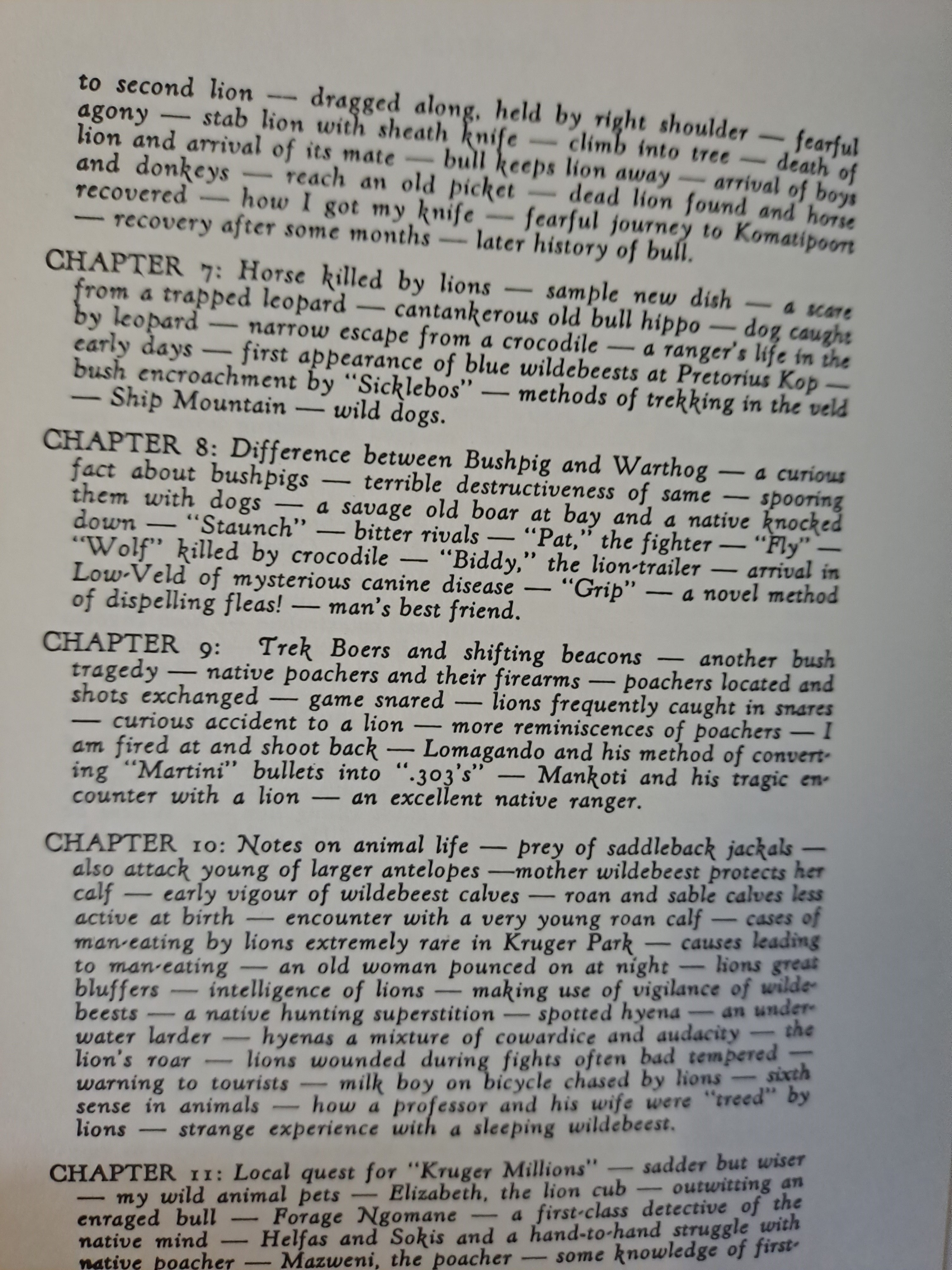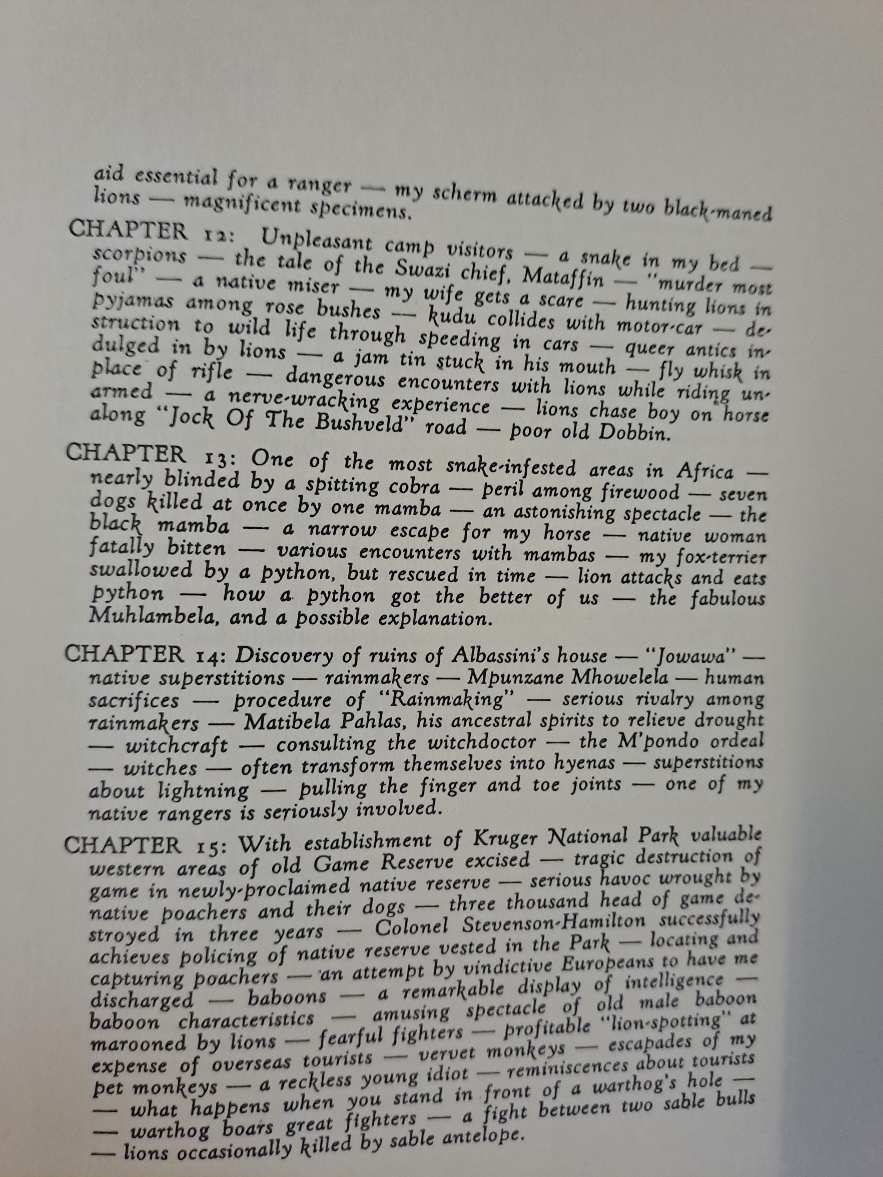 "I suppose there can be few if any men in all Africa possessing a deeper knowledge and wider experience of bush lore in all its phases and in his prime he held all the qualities requisite to give effect to that knowledge and experience; a powerful frame, an iron constitution; cool courage and quiet determination. In addition, his complete mastery of the local Bantu language, and acquaintance with their customs, earned him exceptional liking and respect among the tribal natives. His unique exploit in killing, single-handed, and armed only with a knife, a full grown male lion which had seized, and was carrying him off, was in itself a feat rendering superfluous any further tributes to his rare courage and coolness; but it is worth remarking that in many hazards - happily all safely surmounted - which he has since incurred in the course of his duties, his nerve has shown itself to be just as calm and steady as it was when he underwent that terrible experience." - From the Foreword by J. Stevenson-Hamilton.