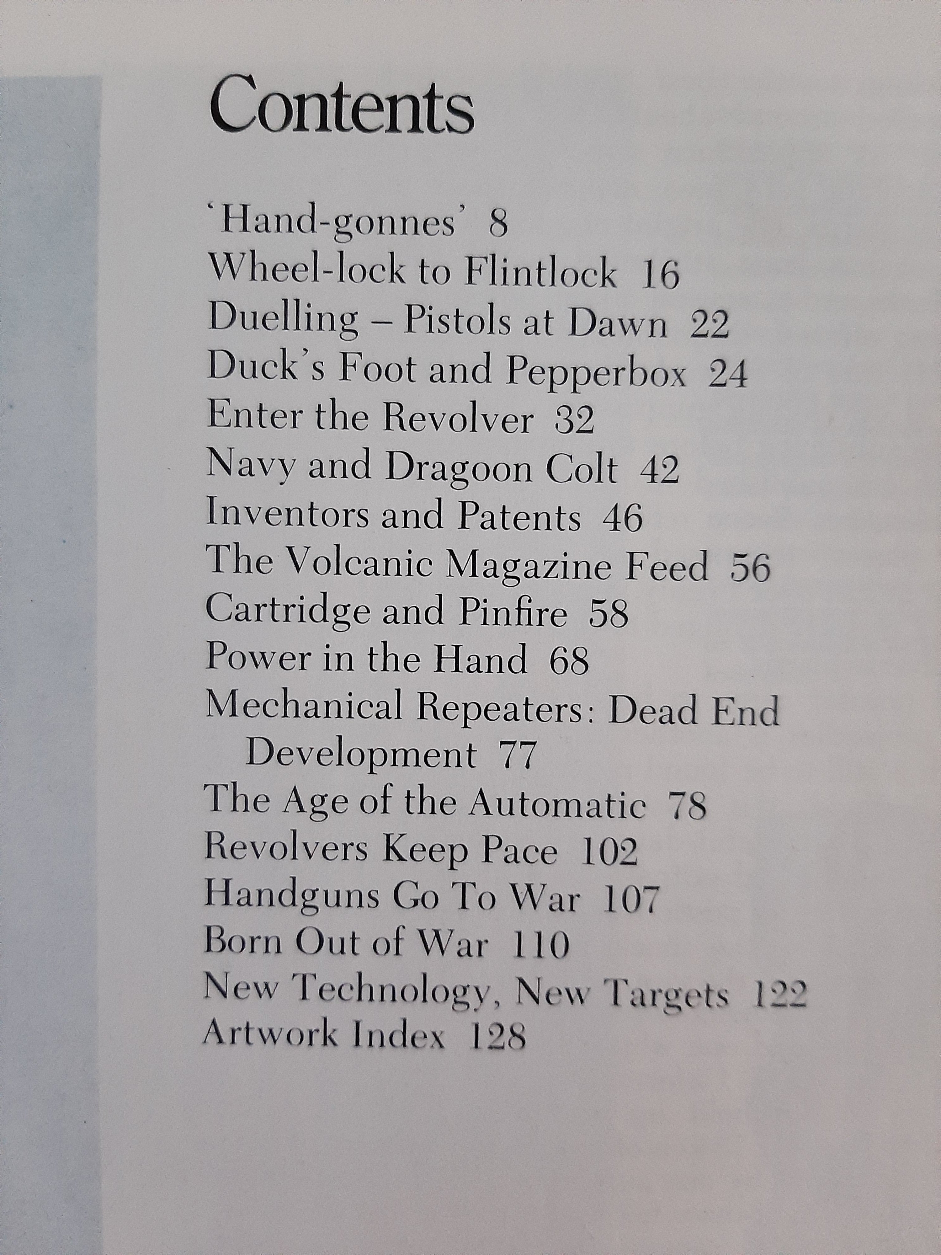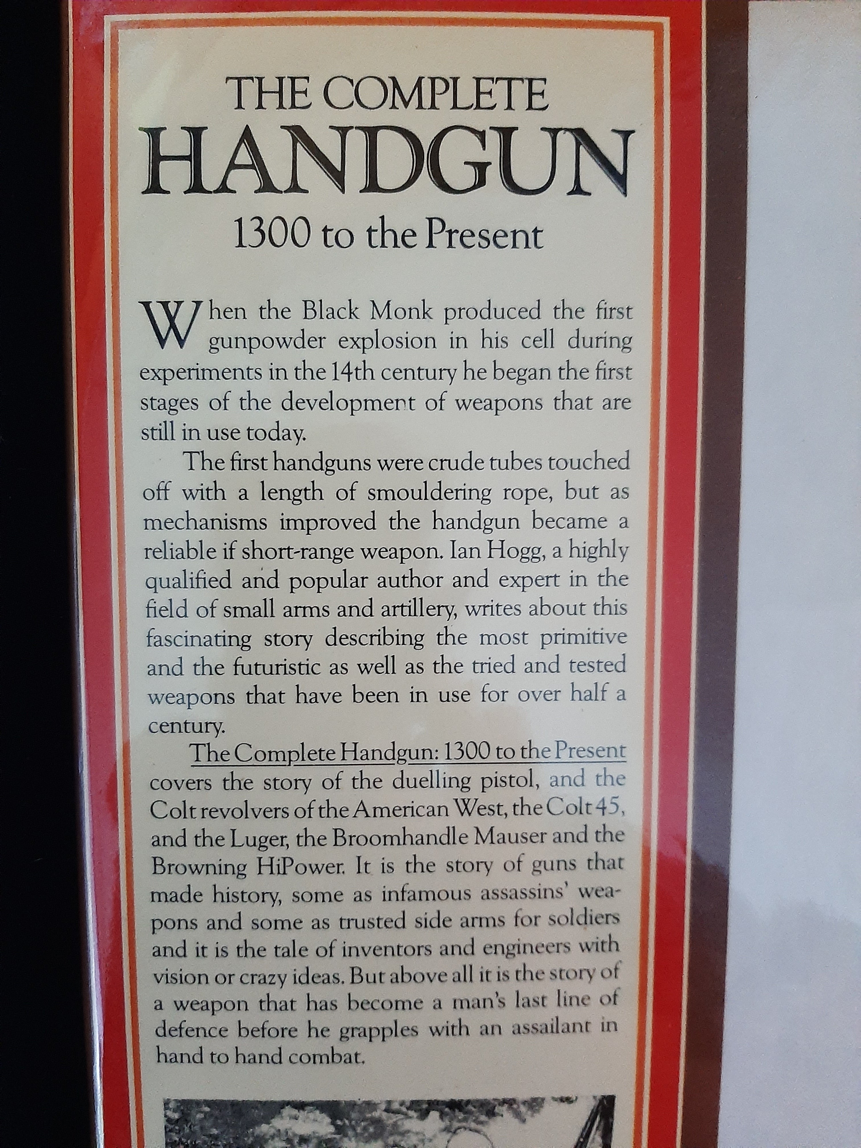The Complete Handgun: 1300 to the Present by Ian V. Hogg. Illustrated by John Batchelor. 'This large book covers the story of the duelling pistol, the Colt revolvers of the American West, the Colt 45, and the Luger, the Broomhandle Mauser and the Browning HiPower. It is the story of guns that made history, some as infamous assassins, weapons and some as trusted side arms for soldiers, and it is also the tale of inventors and engineers with vision or crazy ideas. Above all, it is the story of a weapon that has become a man's last line of defence before he grapples with an assailant in hand to hand combat.'