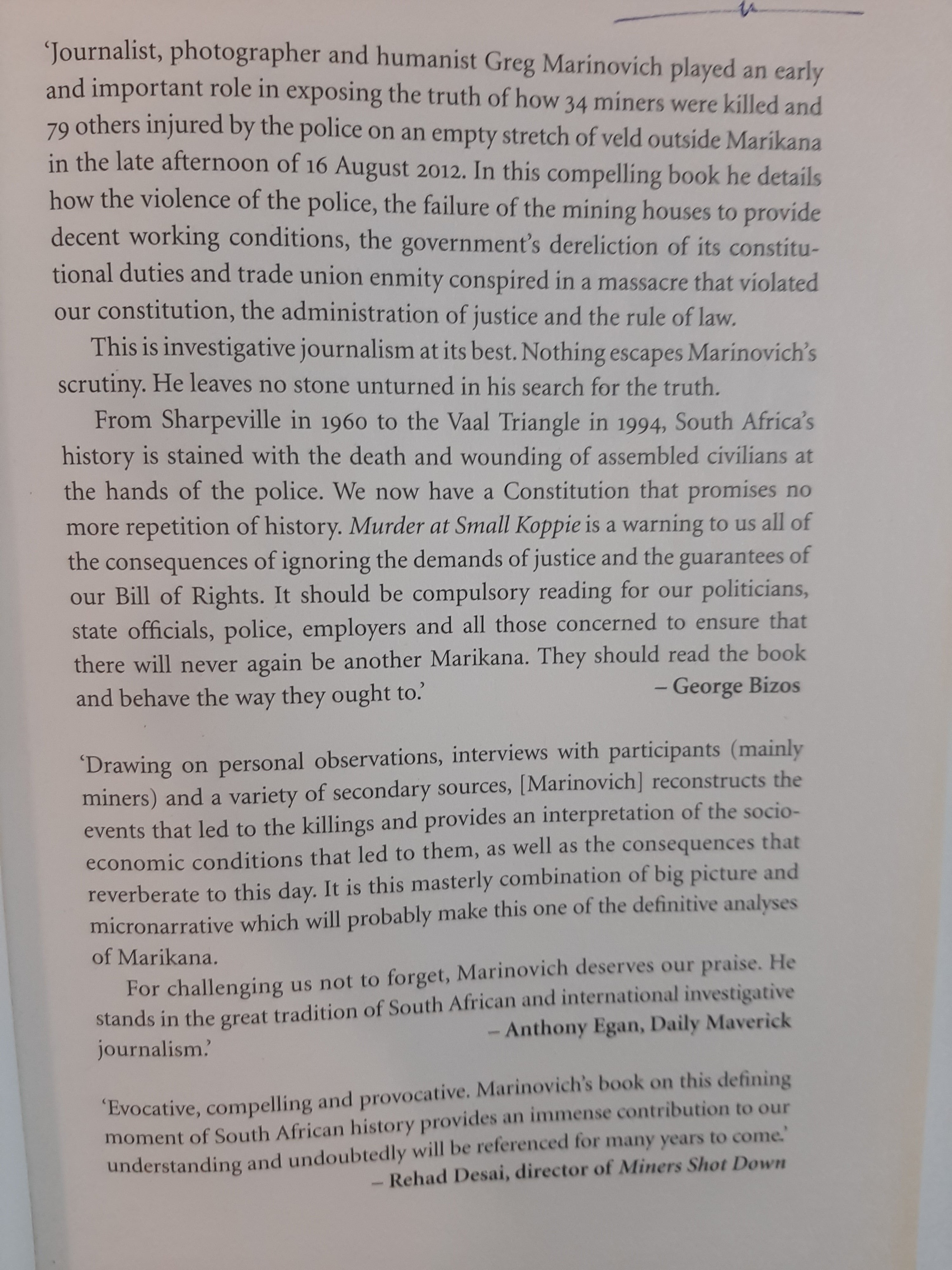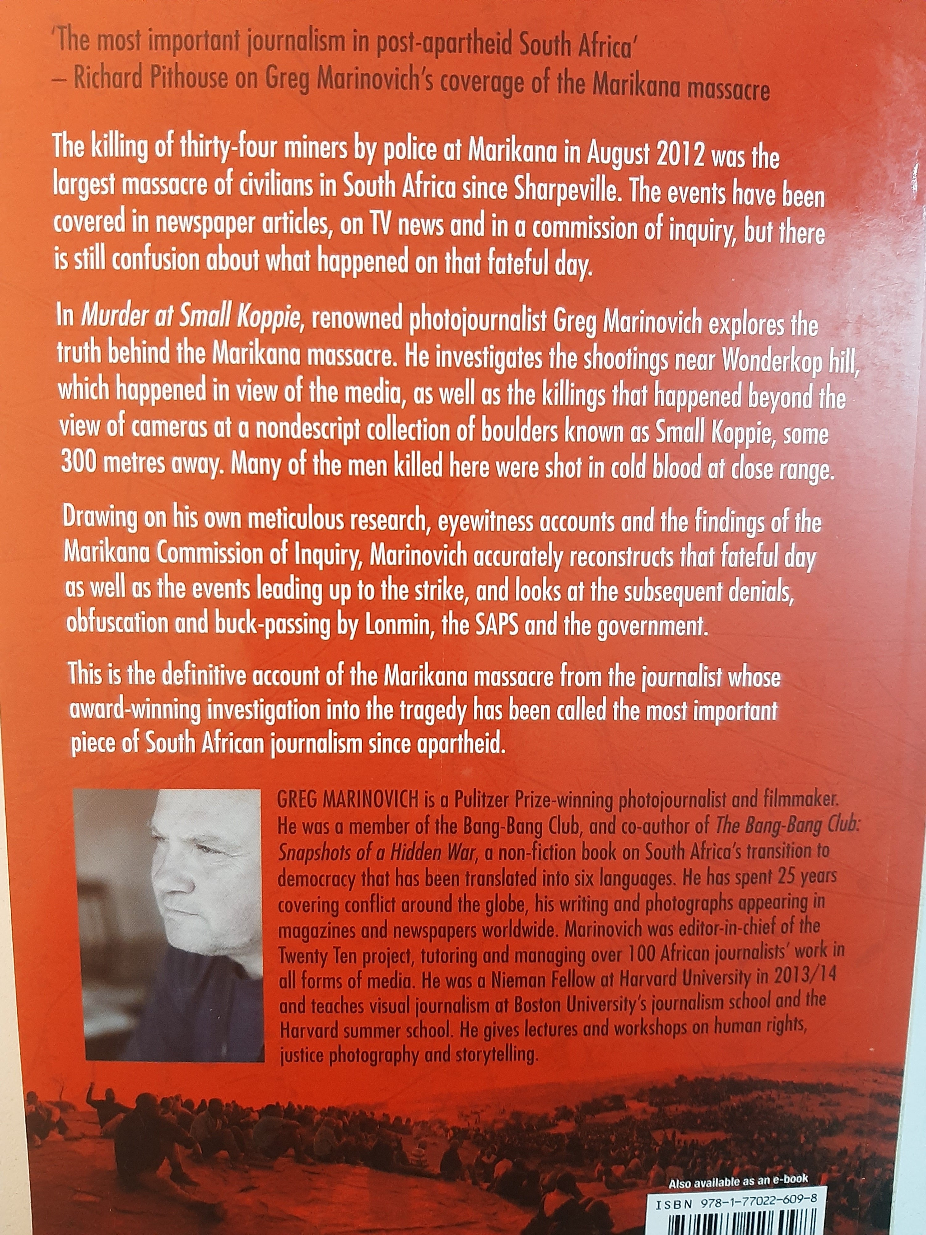 In Murder At Small Koppie, renowned photojournalist Greg Marinovich explores the truth behind the Marikana massacre. He investigates the shootings near Wonderkop hill, which happened in view of the media, as well as the killings that happened beyond the view of cameras at a nondescript collection of boulders known as Small Koppie, some 300 metres away. Many of the men killed here were shot in cold blood at close range. Drawing on his own meticulous research, eyewitness accounts and the findings of the Marikana Commission of Inquiry, Marinovich accurately reconstructs that fateful day as well as the events leading up to the strike, and looks at the subsequent denials, obfuscation and buck-passing by Lonmin, the SAPS and the government.