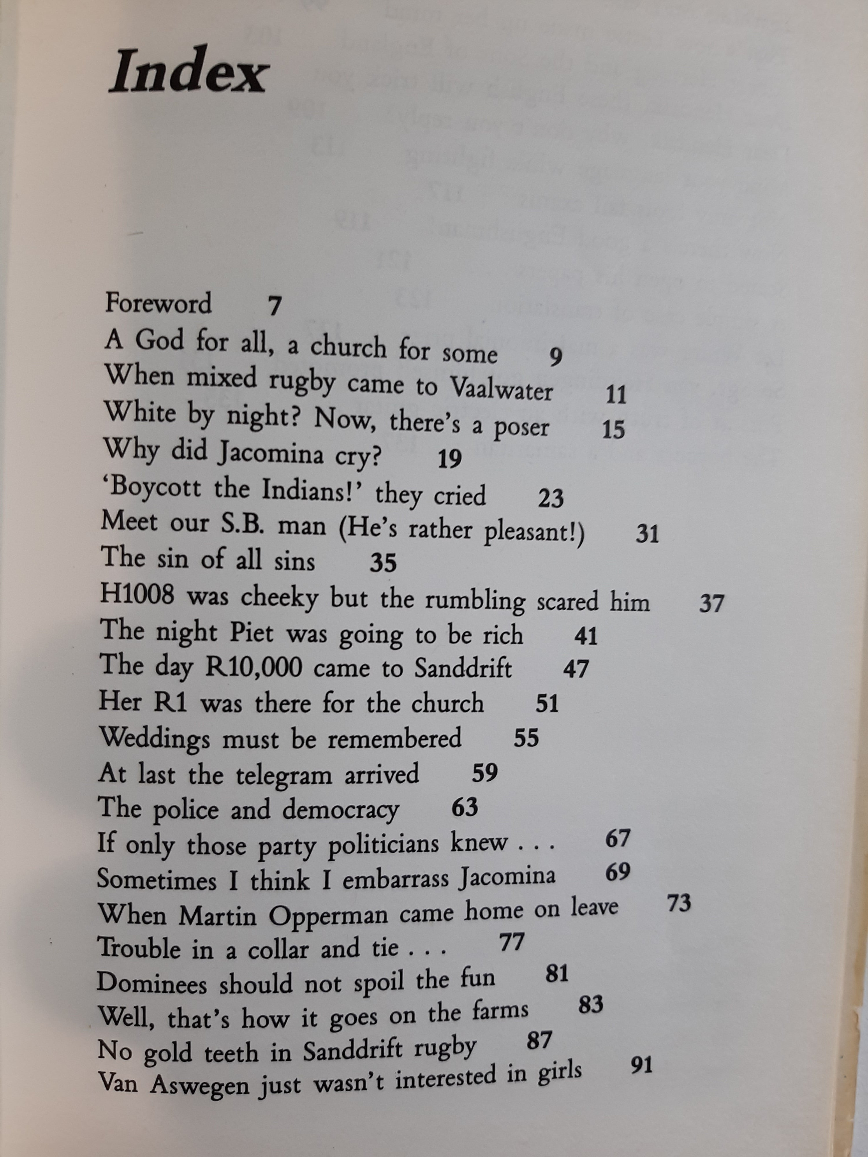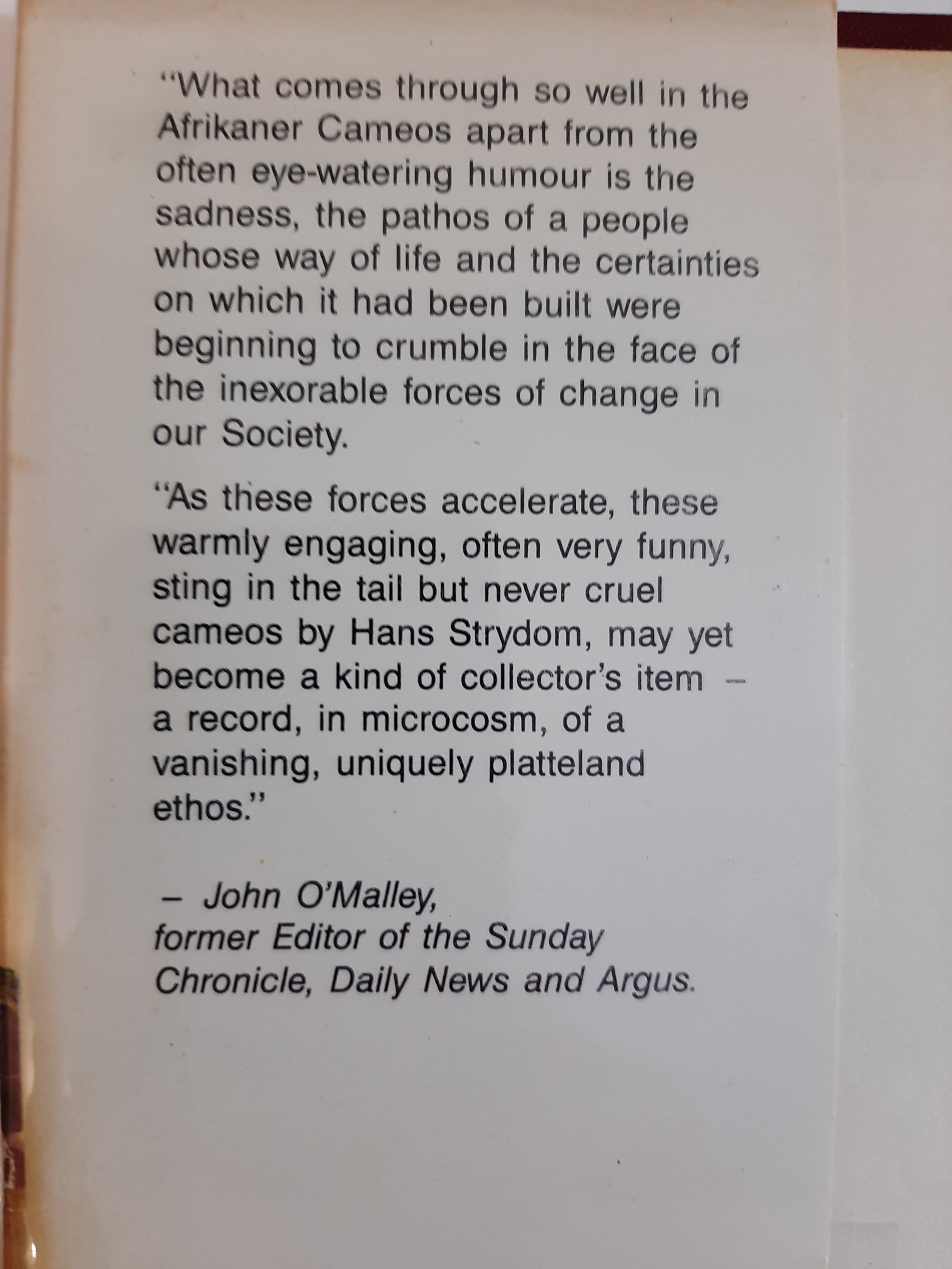 What comes through so well in the Afrikaner Cameos apart from the often eye-watering humour is the sadness, the pathos of a people whose way of life and the certainties on which it had been built were beginning to crumble in the face of the inexorable forces of change in our Society. As these forces accelerate, these warmly engaging often very funny, sting in the tail but never cruel cameos by Hans Strydom, may yet become a kind of collector's item, a record, in microcosm of a vanishing, uniquely platteland ethos.