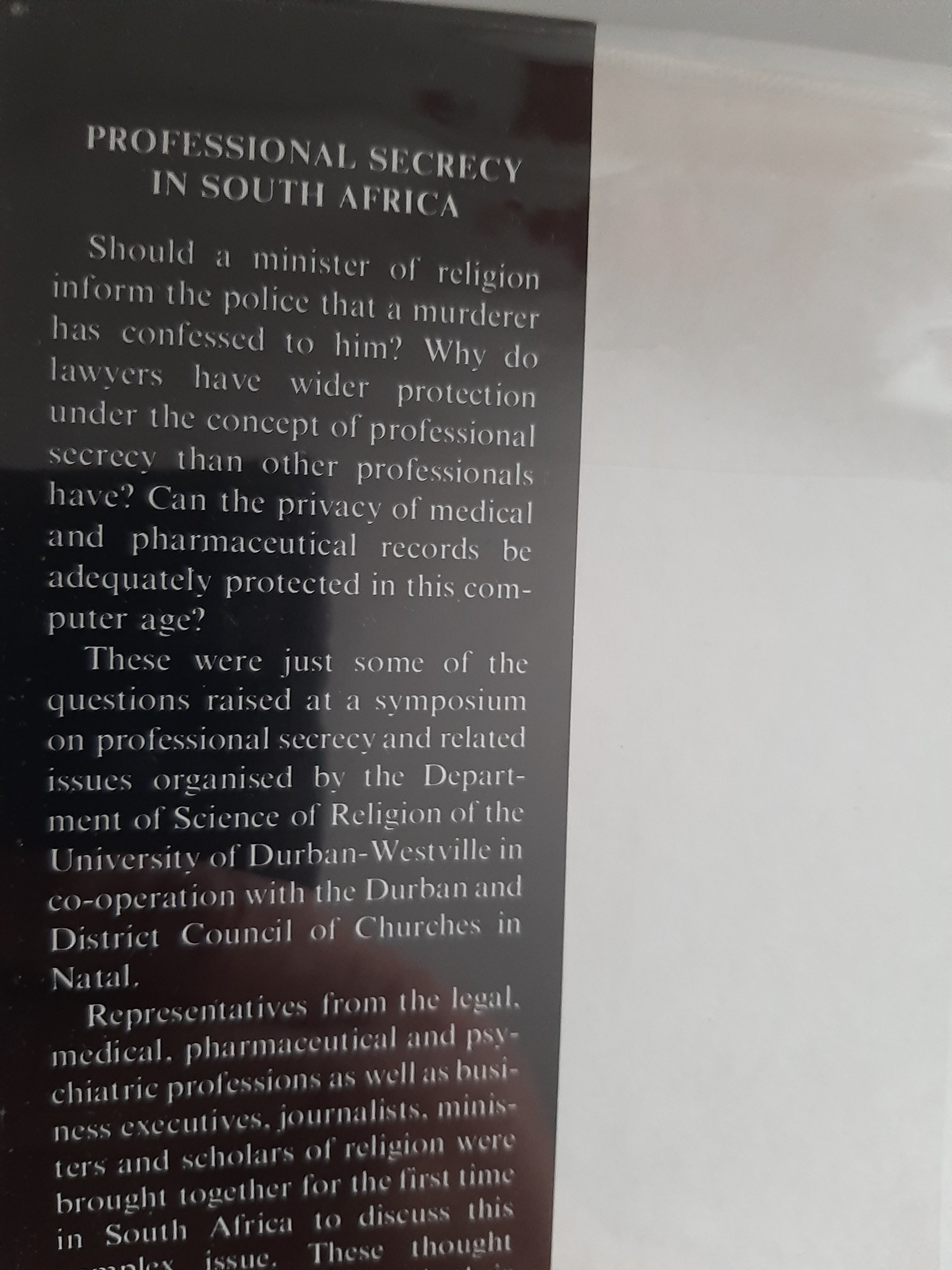 Should a minister of religion inform the police that a murderer has confessed to him? Why do lawyers have wider protection under the concept of professional secrecy than other professionals have? Can the privacy of medical and pharmaceutical records be adequately protected in this computer age? These were just some of the questions raised at a symposium on professional secrecy and related issues organised by the Department of Science of Religion of the University of Durban-Westville in co-operation with the Durban and District Council of Churches in Natal.