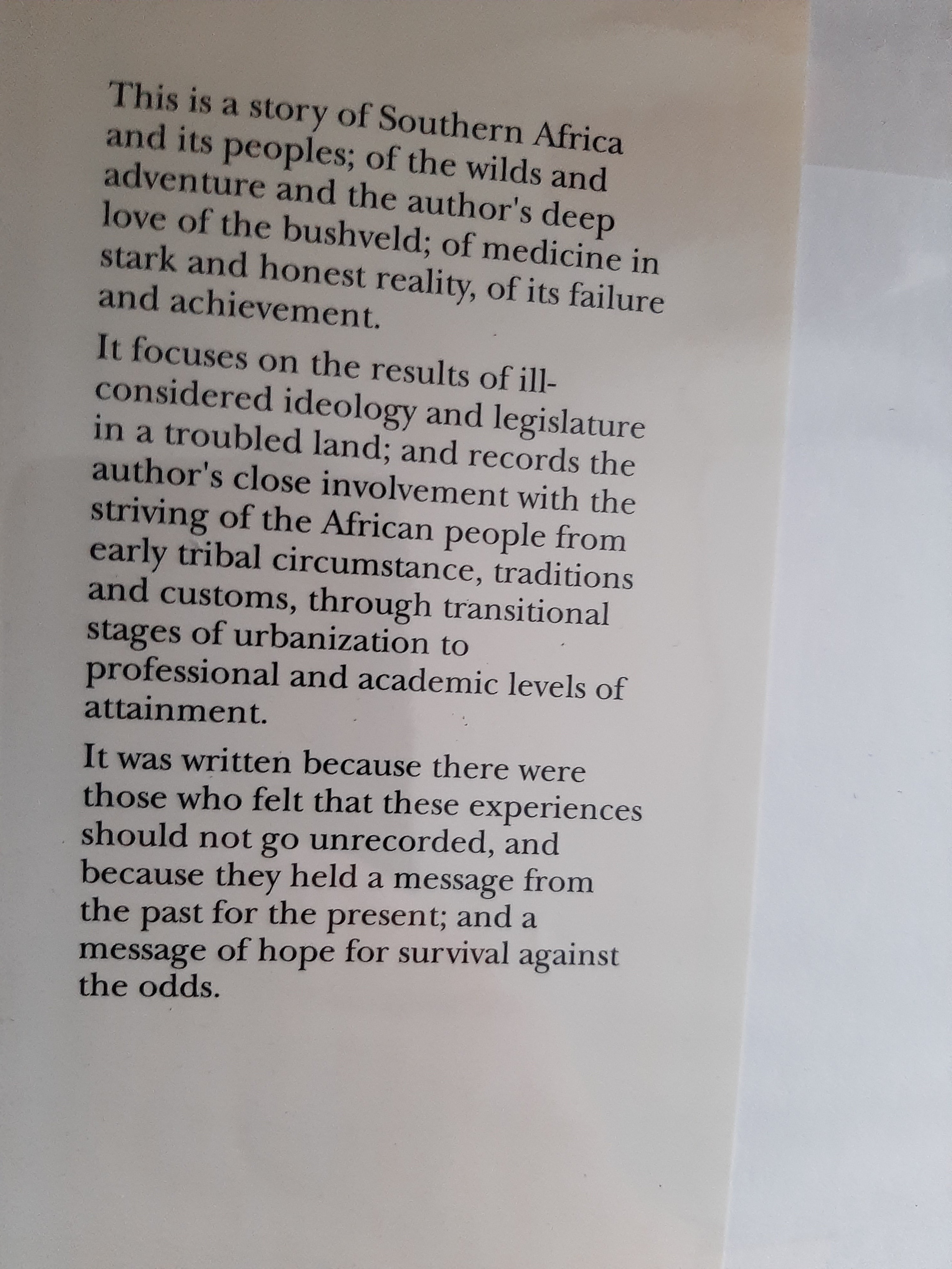 This is a story of Southern Africa and its peoples; of the wilds and adventure and the author's deep love of the bushveld; of medicine in stark and honest reality, of its failure and achievement. It focuses on the results of ill-considered ideology and legislature in a troubled land, and records the author's close involvement with the striving of the African people from early tribal circumstance, traditions and customs through transitional stages of urbanization to professional and academic levels of attainment.