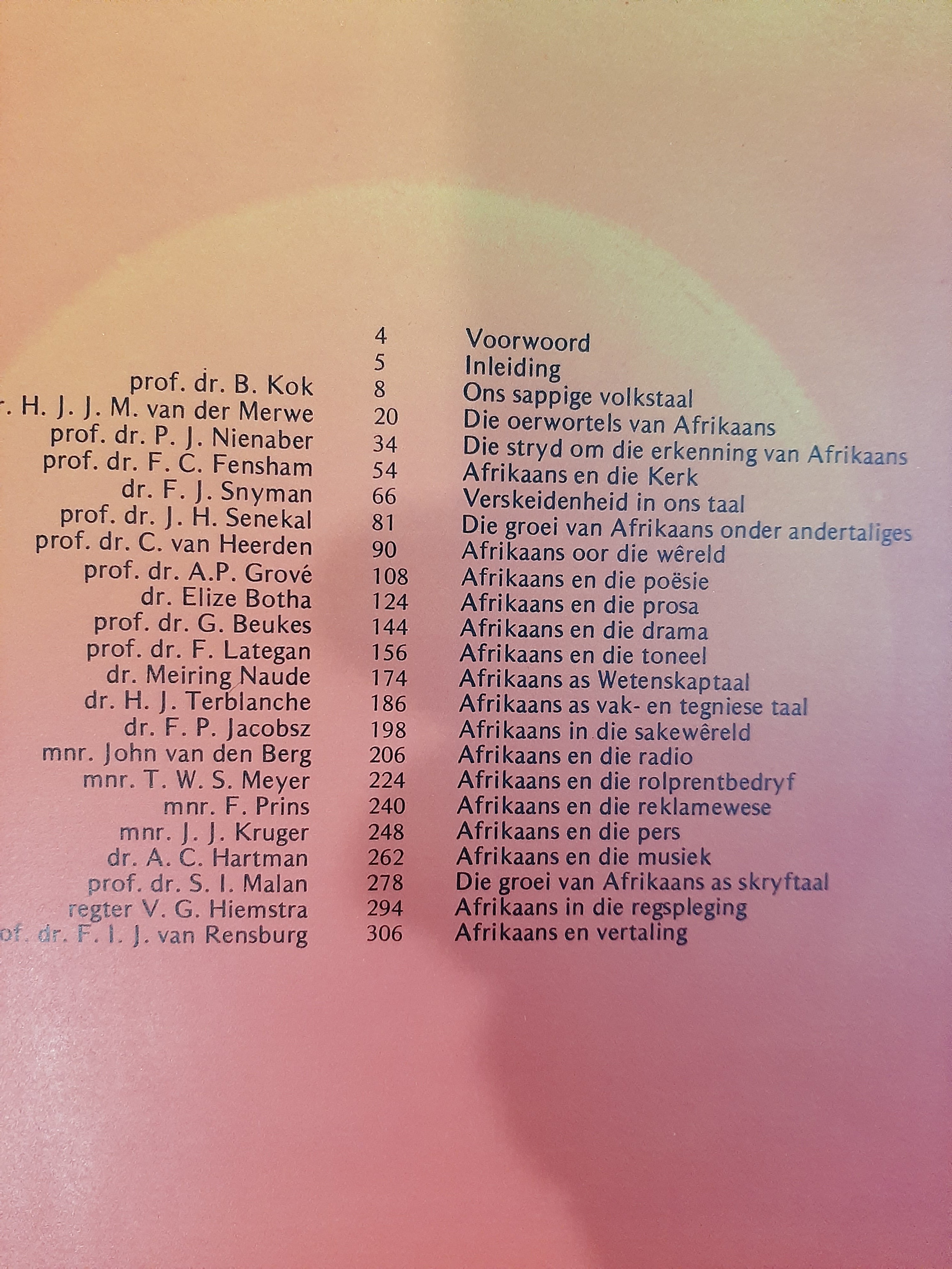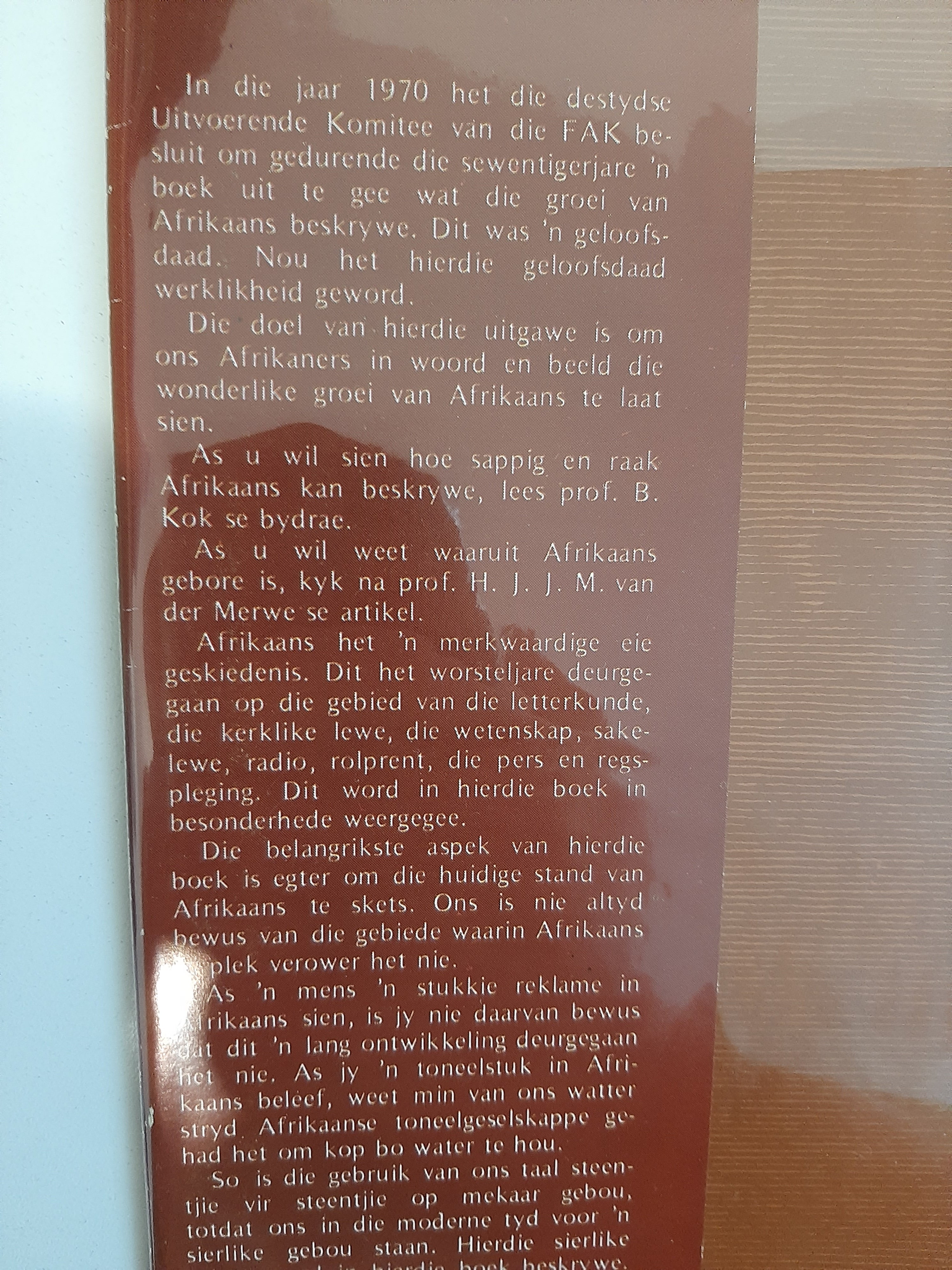 In 1970 het die Hoofbestuur van die FAK besluit om in die jare sewentig ‘n boek uit te gee waarin die groei van Afrikaans beskryf word, en op hierdie dag is Afrikaans on pêrel van groot waarde aan die publiek bekend gestel nadat geskenkeksemplare kort tevore aan die Staatspresident, mnr. B.J. Vorster, oorhandig is. Afrikaans het ‘n merkwaardige eie geskiedenis. Dit het worsteljare deurgegaan op die gebied van die letterkunde, die kerklike lewe, die wetenskap en tegnologie, die sakelewe, die uitsaai-, rolprent en perswese, die regspleging, en in die boek word die wonderlike groei van Afrikaans in woord en beeld weergegee. Honderd genommerde uitgawes in leer omslae en sewe duisend gewone hardeband eksemplare is gedruk, wat binne ‘n jaar uitverkoop was.