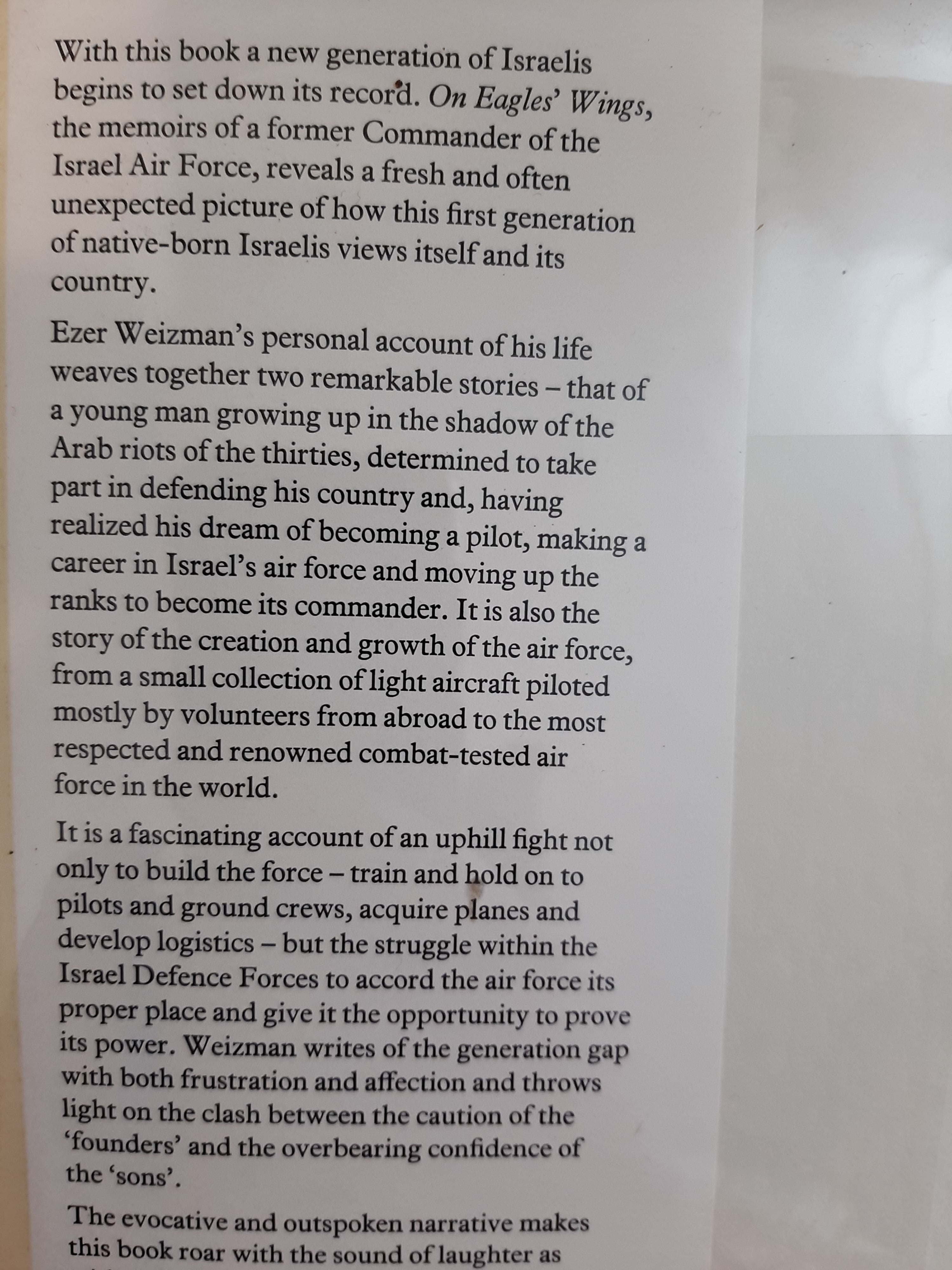 His career continued to higher offices subsequent to the book, which helps put a retrospective spin on some of his experiences. For example, his poor impression of British military planning might be interesting in view of his subsequent role as Head of State. His experiences of varied combat aircraft both ancient and modern is priceless, such as his brief opinion of the Avia S-199 'The Messerschmidt (sic) was unfriendly, 'poker-faced', ungracious and hateful.... The Messerschmidt (sic) had an evil nature.' Don't mince words, Mr Weizman! This quote does also have a lot to do with the 'seat of the pants' style flying of 1948 and its transition over many years to the professionalism of the Israeli Air Force in the 1960s. Amazing.