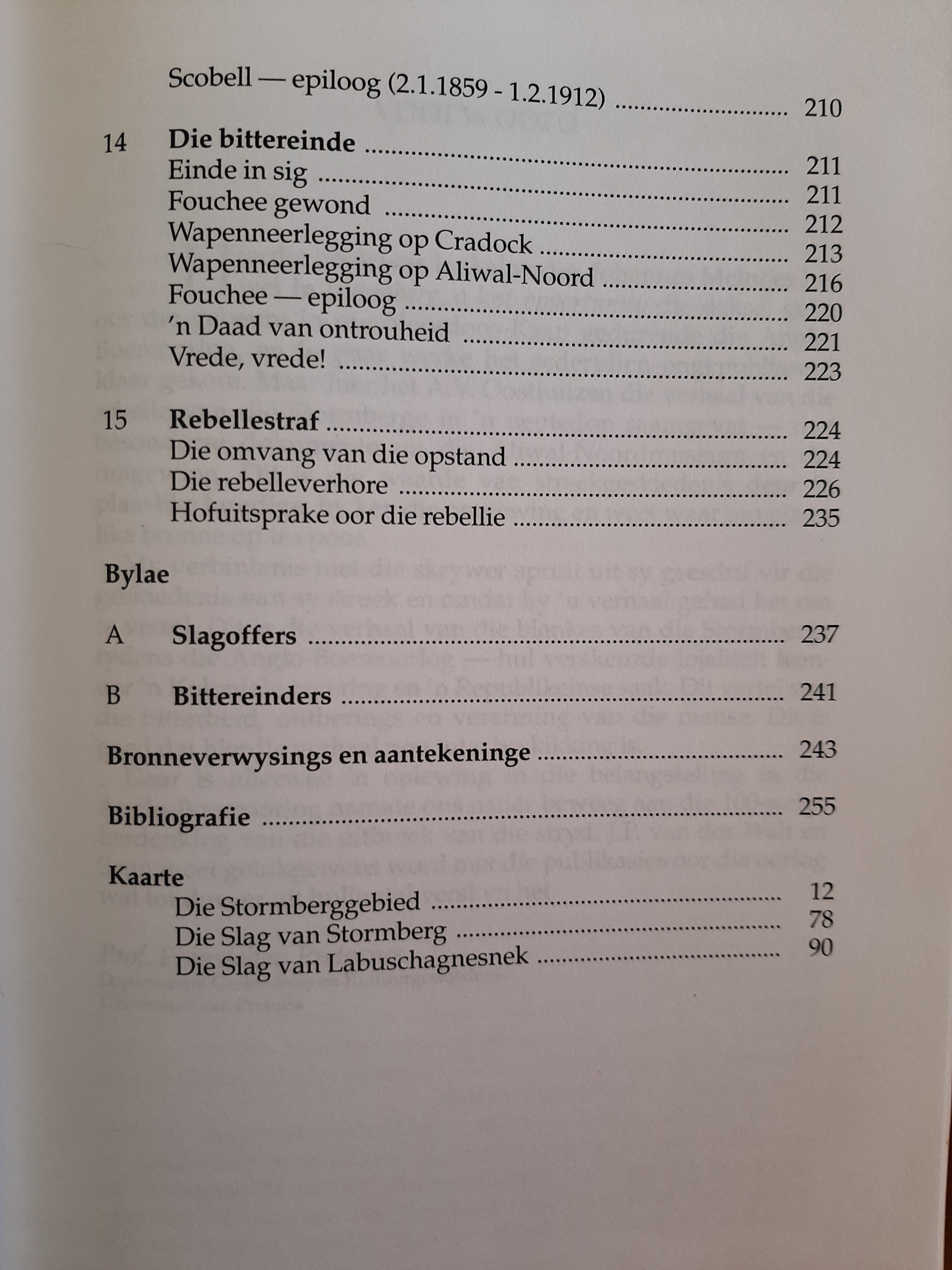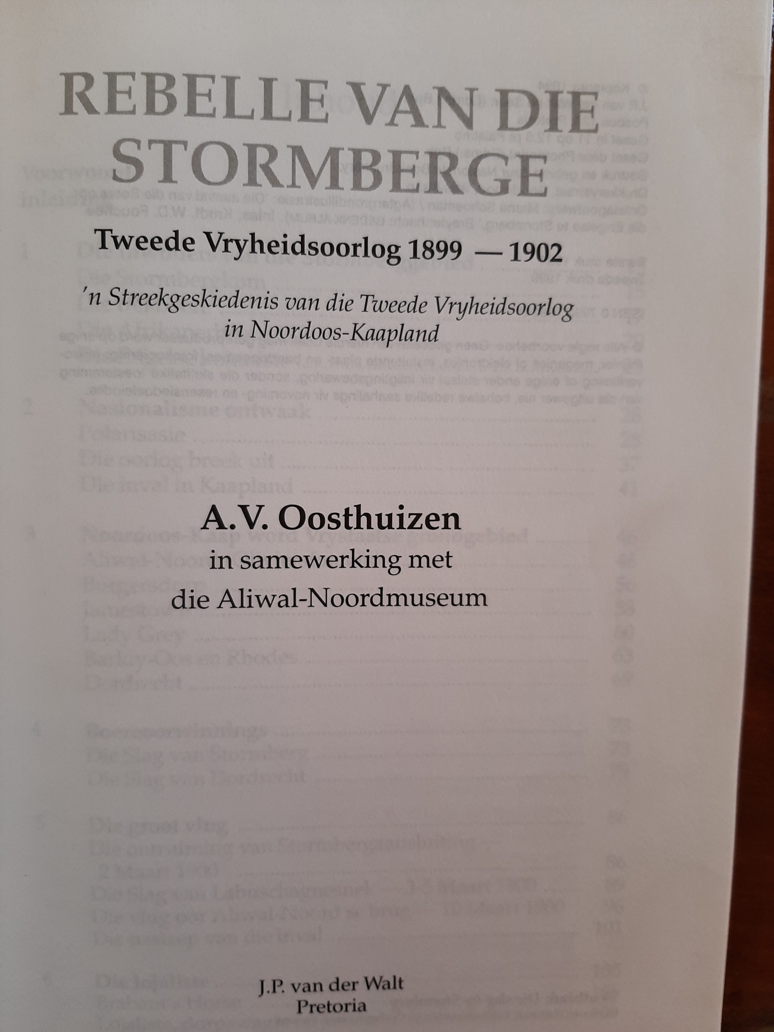 Pretoria: J.P. van der Walt, 1994 Voorwoord deur Prof. Fransjohan Pretorius, Departement Geskiedenis en Kultuurgeskiedenis, Universiteit van Pretoria. "Hierdie boek was lankal nodig. Johannes Meintjes het wel in "Stormberg, a lost opportunity" die deksel gelig oor die gebeure in die Noordoos-Kaap gedurende die Anglo Boereoorlog, en 'n paar werke het sedertdien ongepubliseerd klaar gekom. Maar hier het A.V. Oosthuizen die verhaal van die rebelle van die Stormberge in 'n neutedop saamgevat - met besonderse dokumente uit die Aliwal-Noordmuseum en die omgewing. Dit is die waarde van streekgeskiedenis deur 'n plaaslike kundige: hy ken die omgewing en weet waar om plaas like bronne op te spoor. "My verbintenis met die skrywer spruit uit sy geesdrif vir die geskiedenis van sy streek en omdat hy 'n verhaal gehad het om te vertel. Dit is die verhaal van die blankes van die Stormberge tydens die Anglo-Boereoorlog - hul verskeurde lojaliteit teen oor 'n Koloniale regering en 'n Republikeinse saak. Dit vertel van die bitterheid, ontberings en verarming van die mense. Dit is goed dat hierdie verhaal nou tot u beskikking is. Daar is allerweë 'n oplewing in die belangstelling in die Anglo-Boereoorlog namate ons nader beweeg aan die 100-jarige herdenking van die uitbreek van die stryd. J.P. van der Walt en Seun moet gelukgewens word met die publikasies oor die oorlog wat tot dusver uit hulle stal verskyn het.