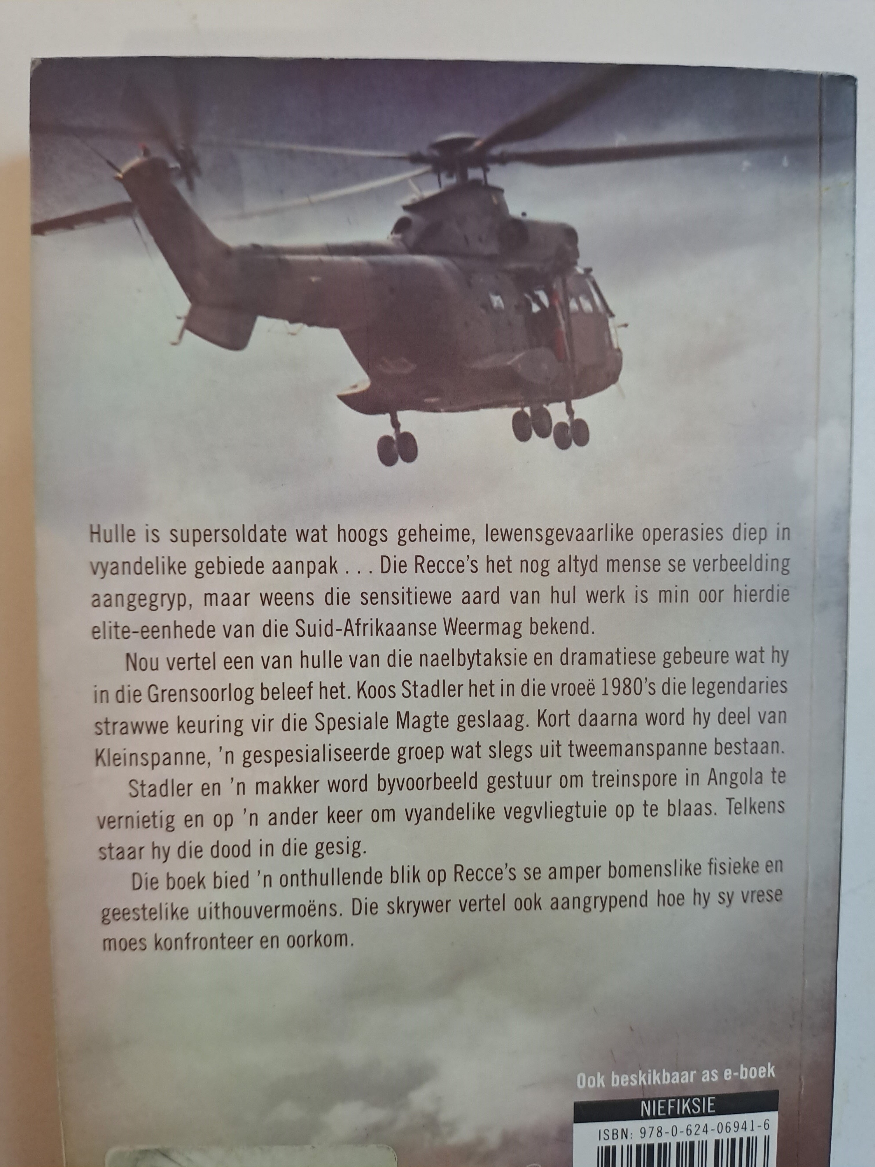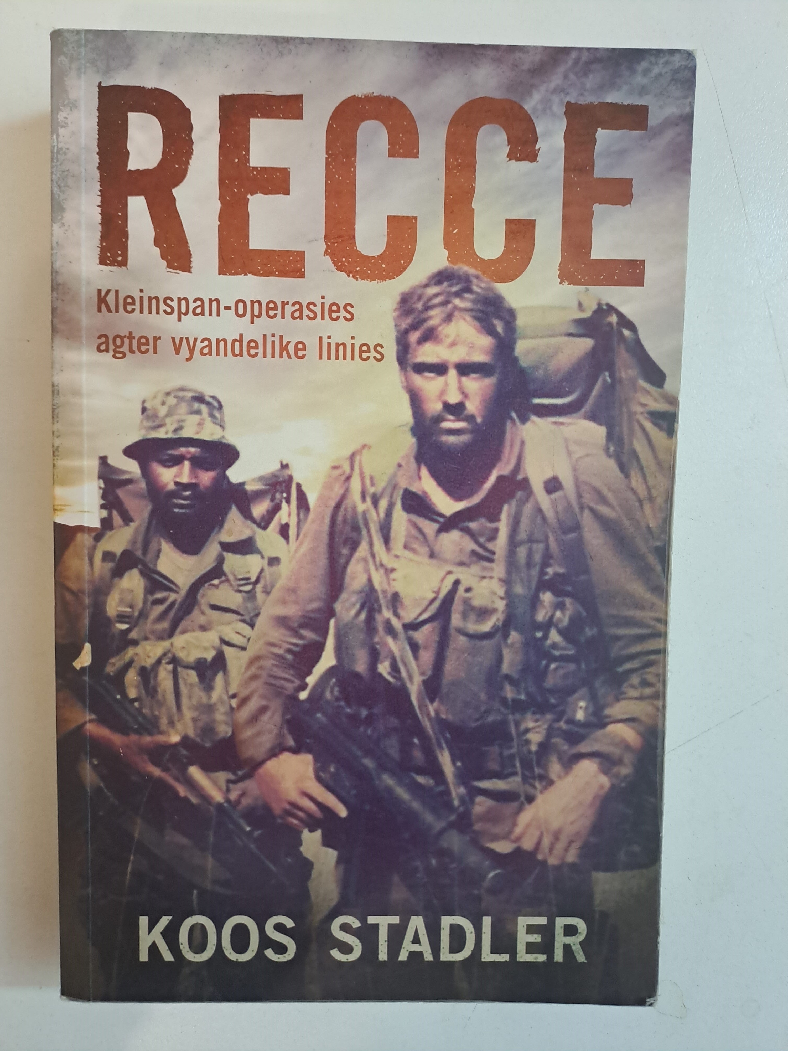 * Uit die aard van hul hoogs geheime werk heers groot geheimsinnigheid oor die Recce’s, maar nou het een van hulle – Koos Stadler – sy ervarings neergepen. Die boek bied ‘n onthullende blik op die lewe van ‘n Recce, op hul amper bomenslike fisieke vermoens en kameraderie. Verwag naelbyt-aksie en dramatiese verhale.