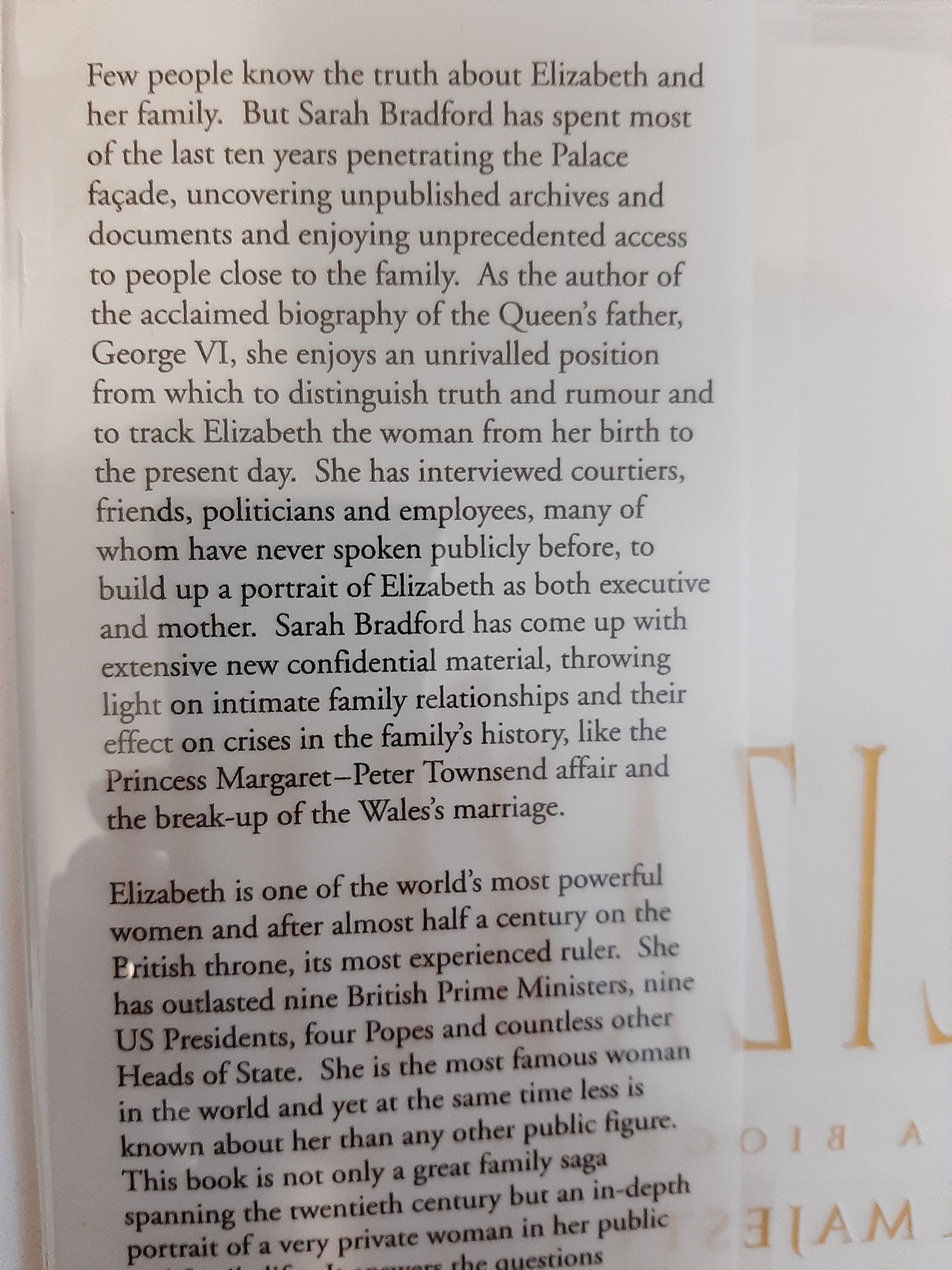 This is the definitive biography of the Queen that reveals the real woman behind the public figure. Sarah Bradford unravels Elizabeth's family secrets - how she was influenced by her father; her troubled relationships with her children; the story of her difficult marriage; and how this remarkable monarch has coped with the pressures of being a mother who is also the most famous woman in the world. 'The only book that could overtake it is the autobiography, which in this case will never be written' - "Spectator."