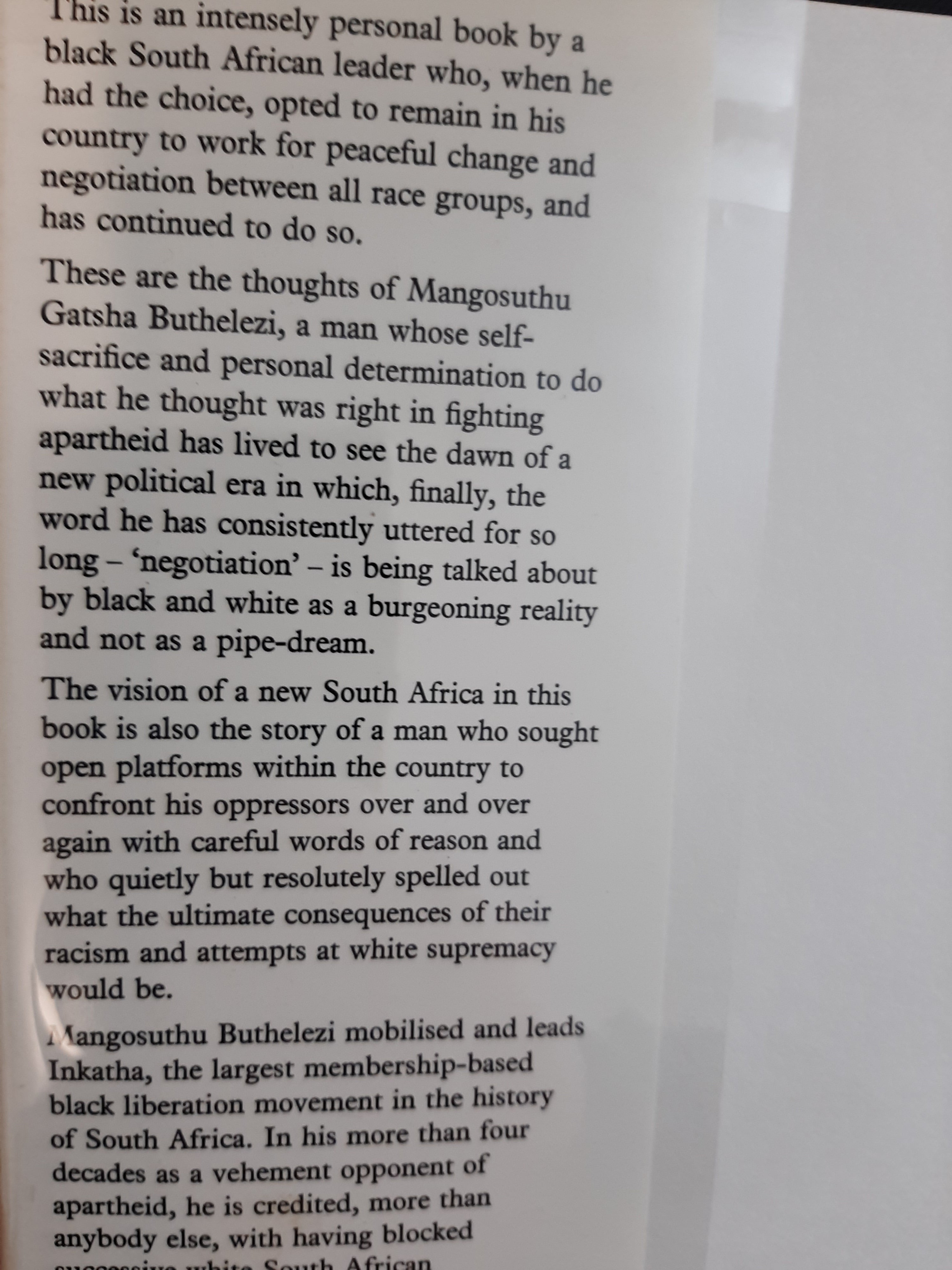 The author, the leader of Inkatha, the largest Black liberation movement in South Africa in 1990, discusses freedom, the national economy, Black disunity, liberation theology, sanctions, and disinvestment
