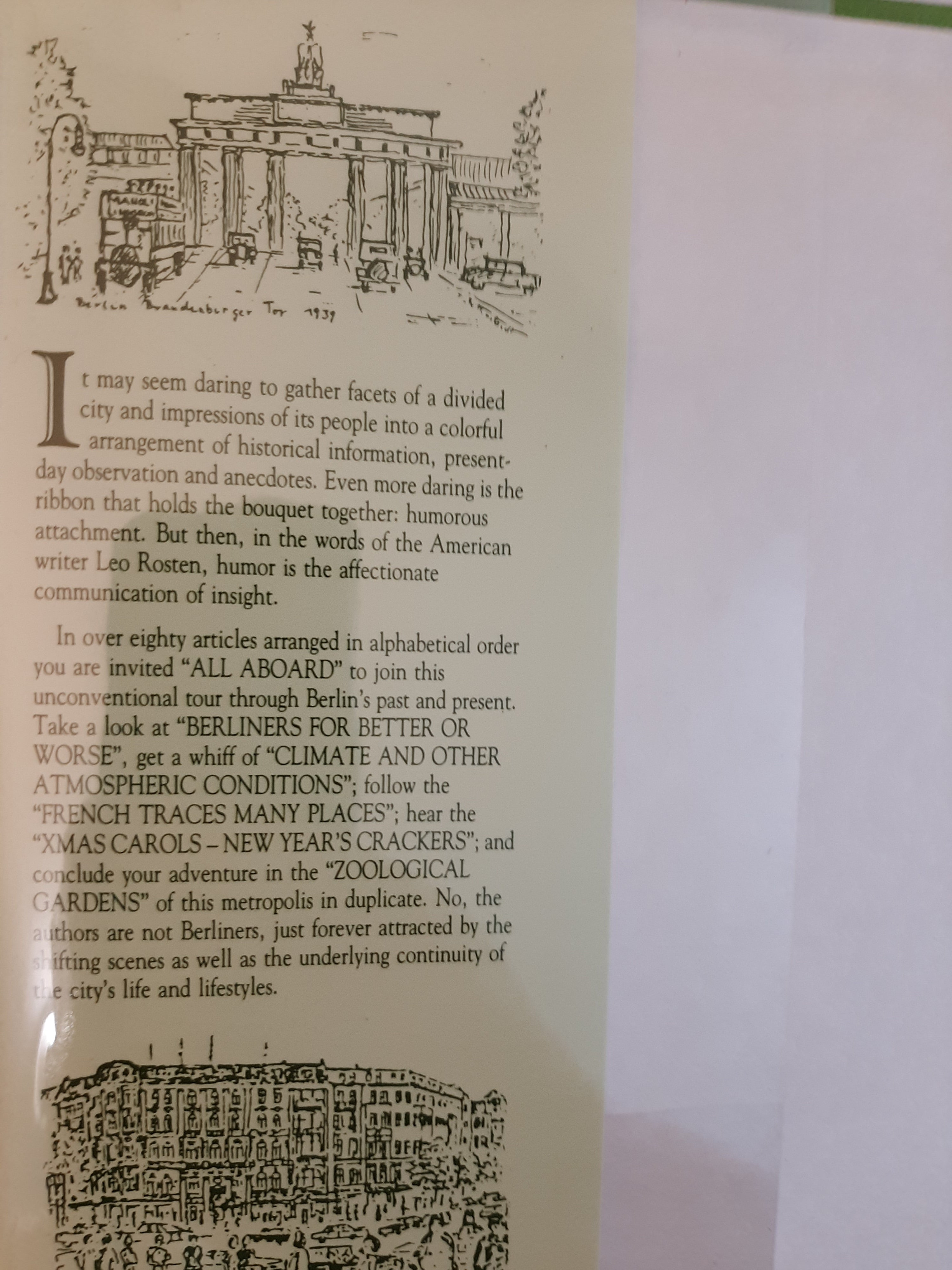 In over eighty articles arranged in alphabetical order you are invited 'All Aboard' to join this unconventional tour through Berlin's past and present. Take a look at Berliners for better or worse, get a whiff of Climate and other atmospheric conditions, follow the French traces many places, hear the Xmas carols- new year's crackers and conclude your adventure in the Zoological gardens of this metropolis in duplicate.