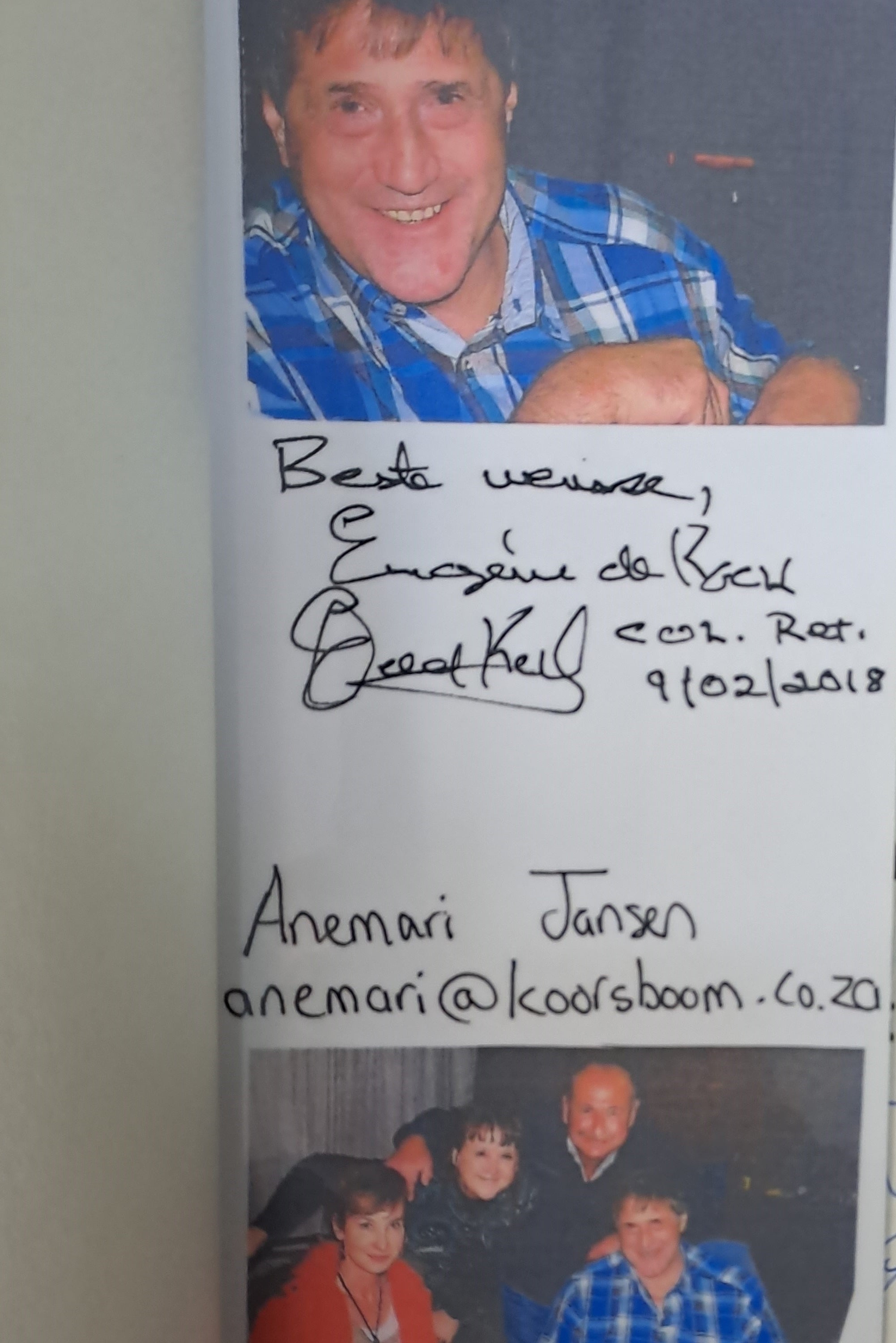 Inserted in the book is a laminated bookmark with a picture of Eugene de Kock, signed and dated by himself and the Author Anemari Jansen as well as a picture of them with friends.(See pics)