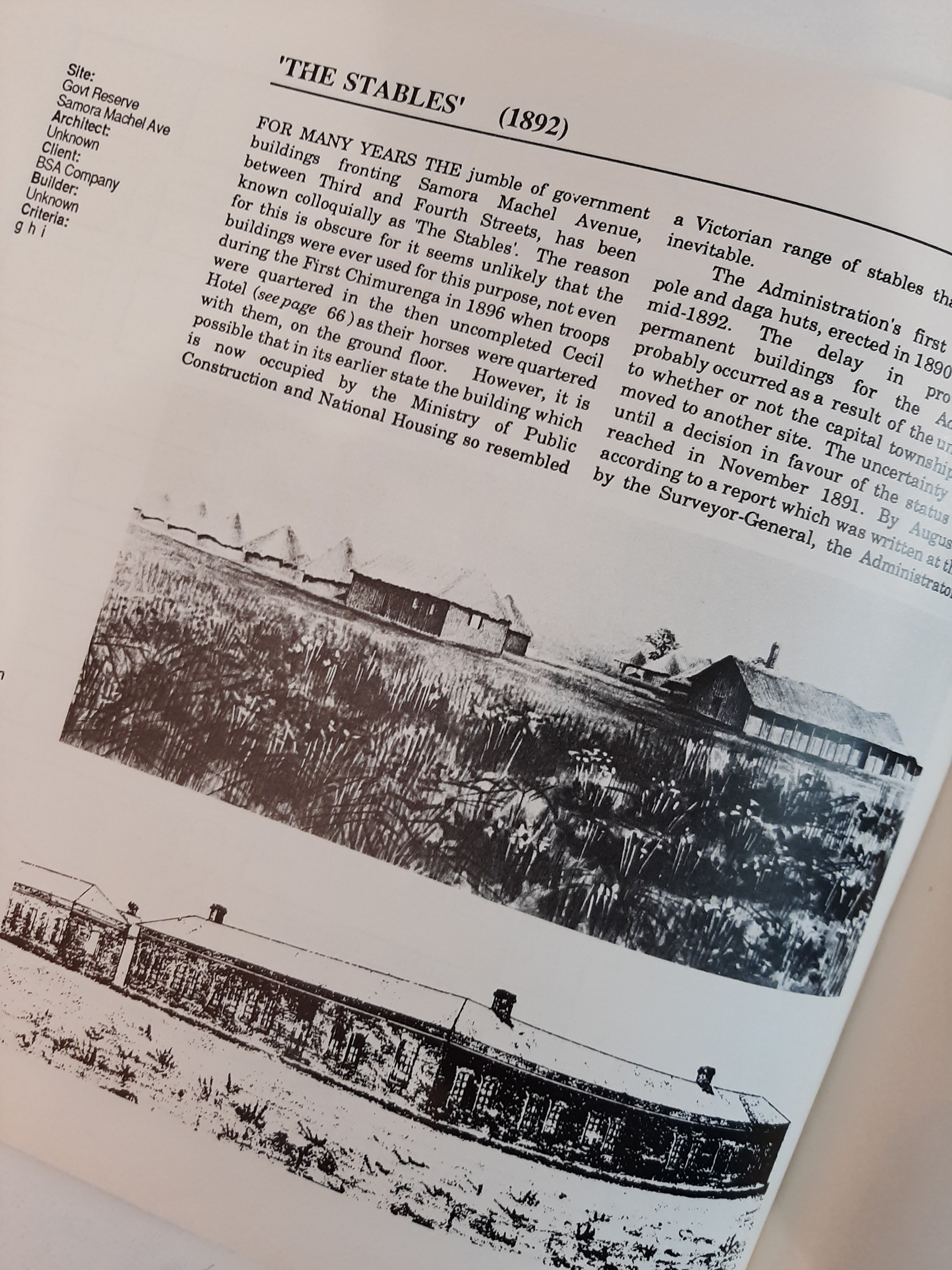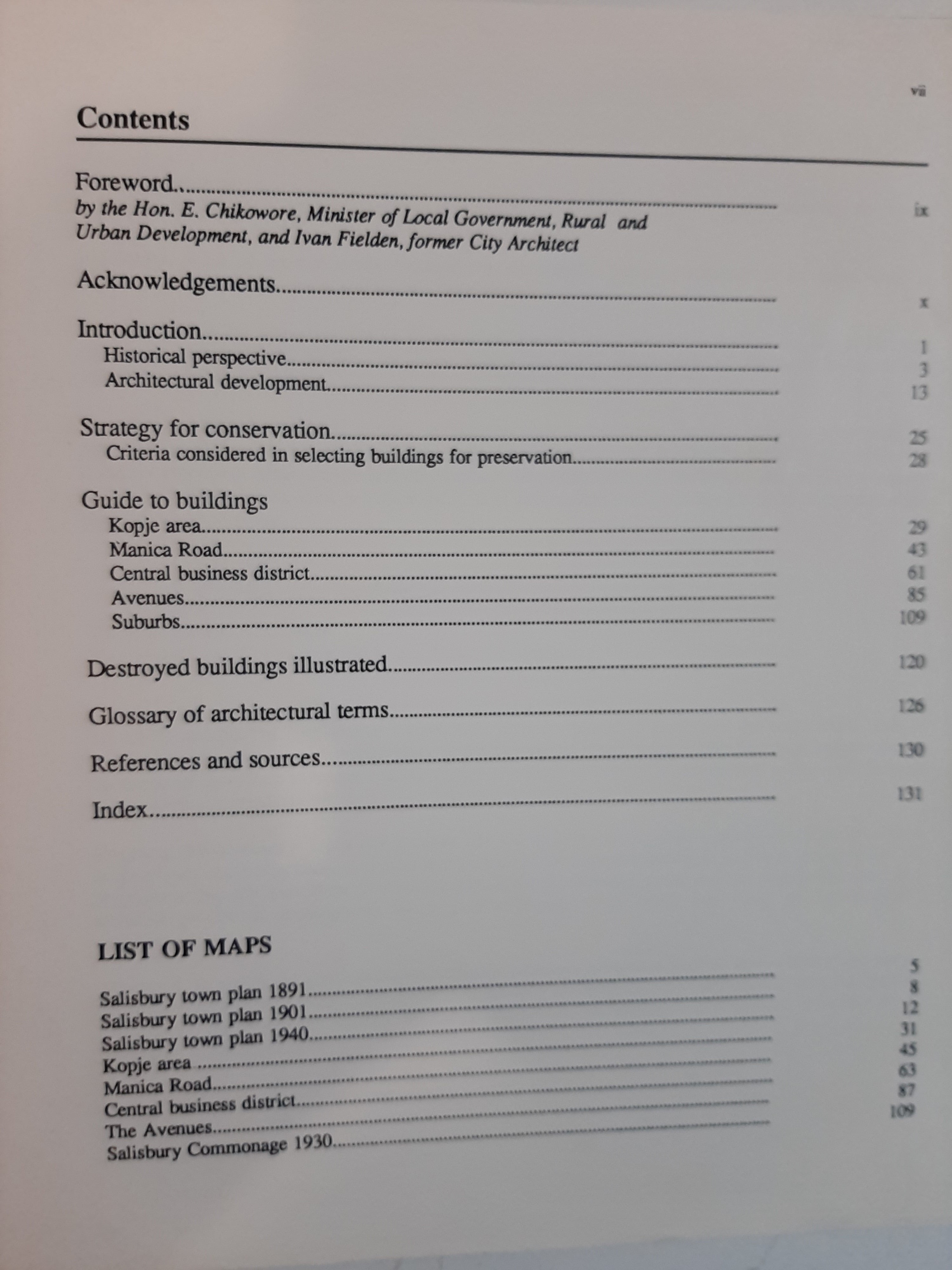 The historic buildings of the capital of Zimbabwe, built during the period it was known as Salisbury, Rhodesia. Black & white photographs, maps, plans, architectural detail drawings.