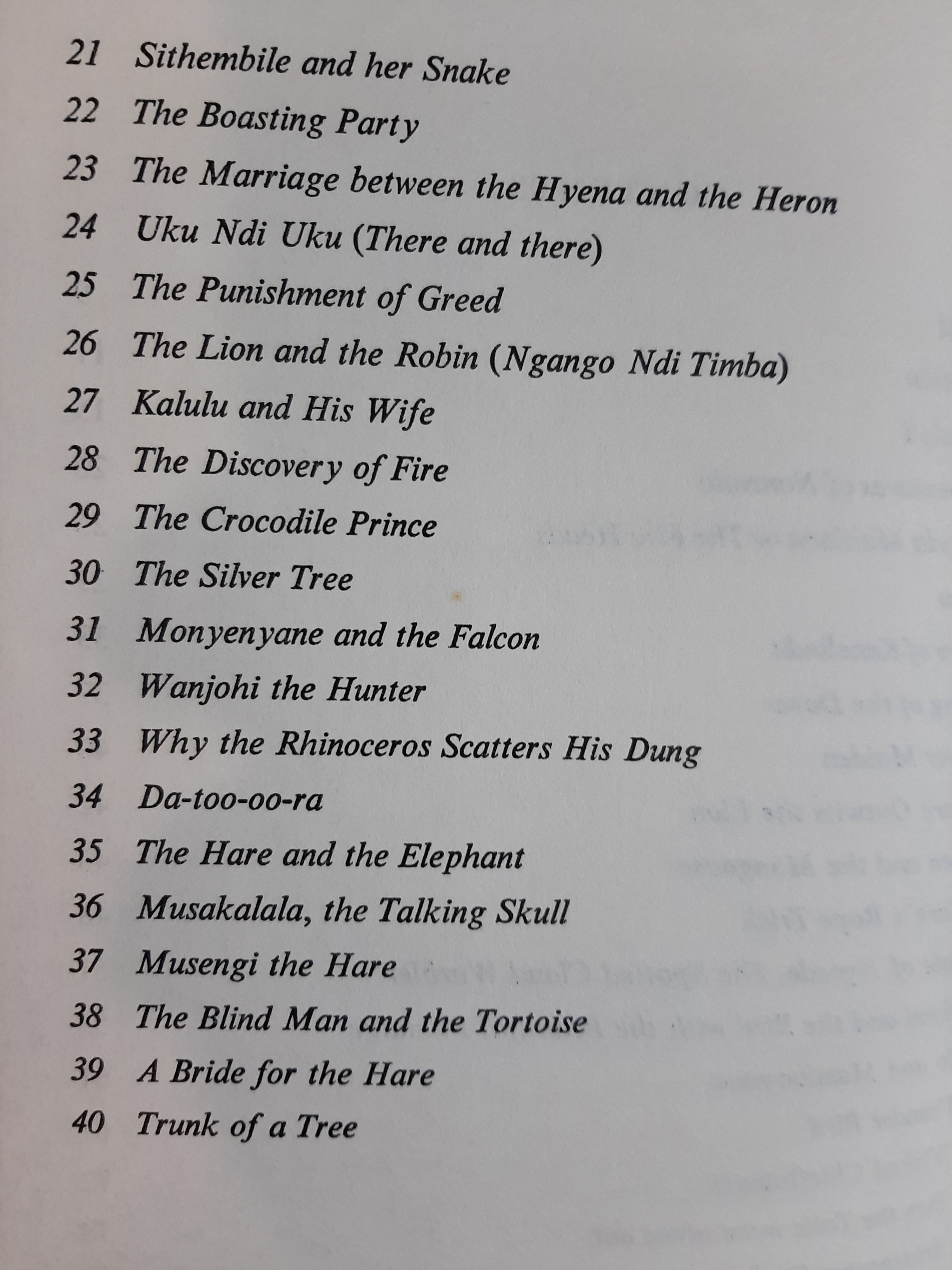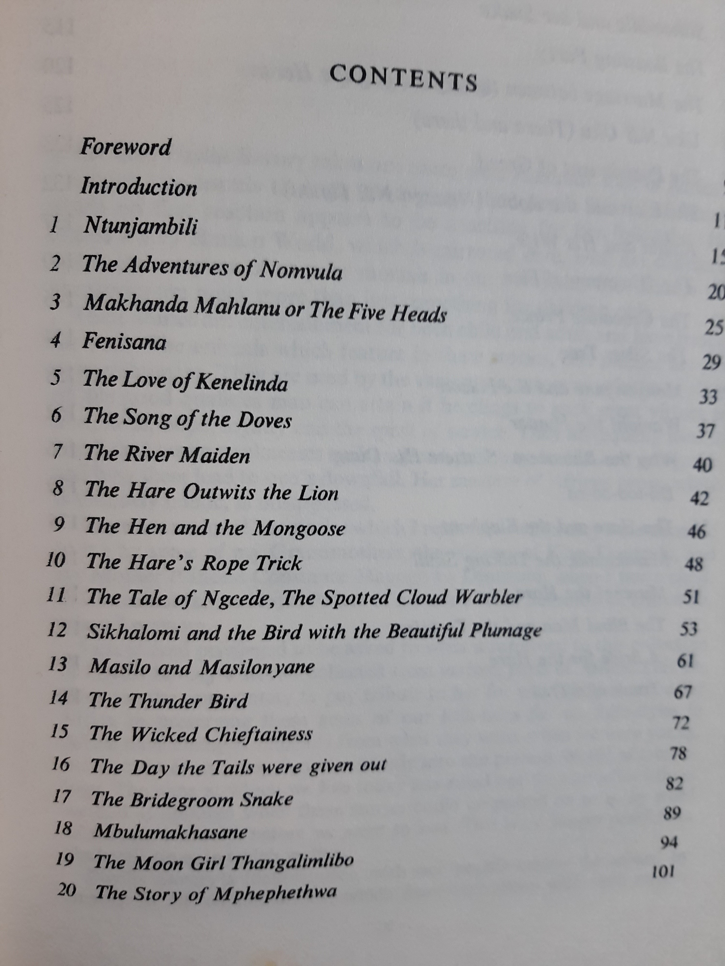 A collection of folk tales, now out of print. There is a representative selection from eight tribes in Southern Africa. The tales are authenticated in a foreword by Chief Gatcha Buthelezi of Kwa Zulu.