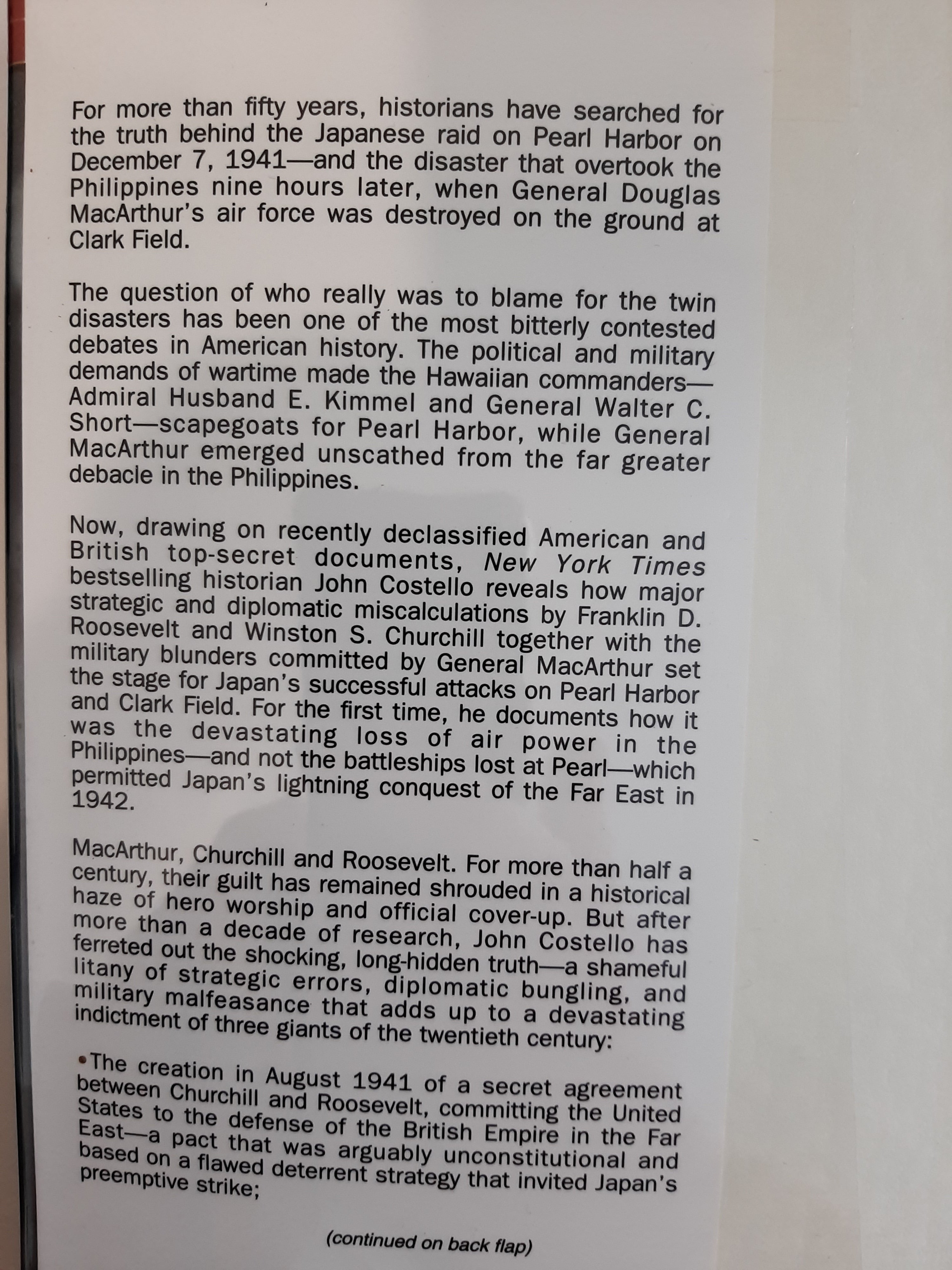 Now, drawing on recently declassified American and British top-secret documents, New York Times bestselling historian John Costello reveals how major strategic and diplomatic miscalculations by Franklin D. Roosevelt and Winston S. Churchill together with the military blunders committed by General MacArthur set the stage for Japan's successful attacks on Pearl Harbor and Clark Field. For the first time, he documents how it was the devastating loss of air power in the Philippines - and not the battleships lost at Pearl - which permitted Japan's lightning conquest of the Far East in 1942.