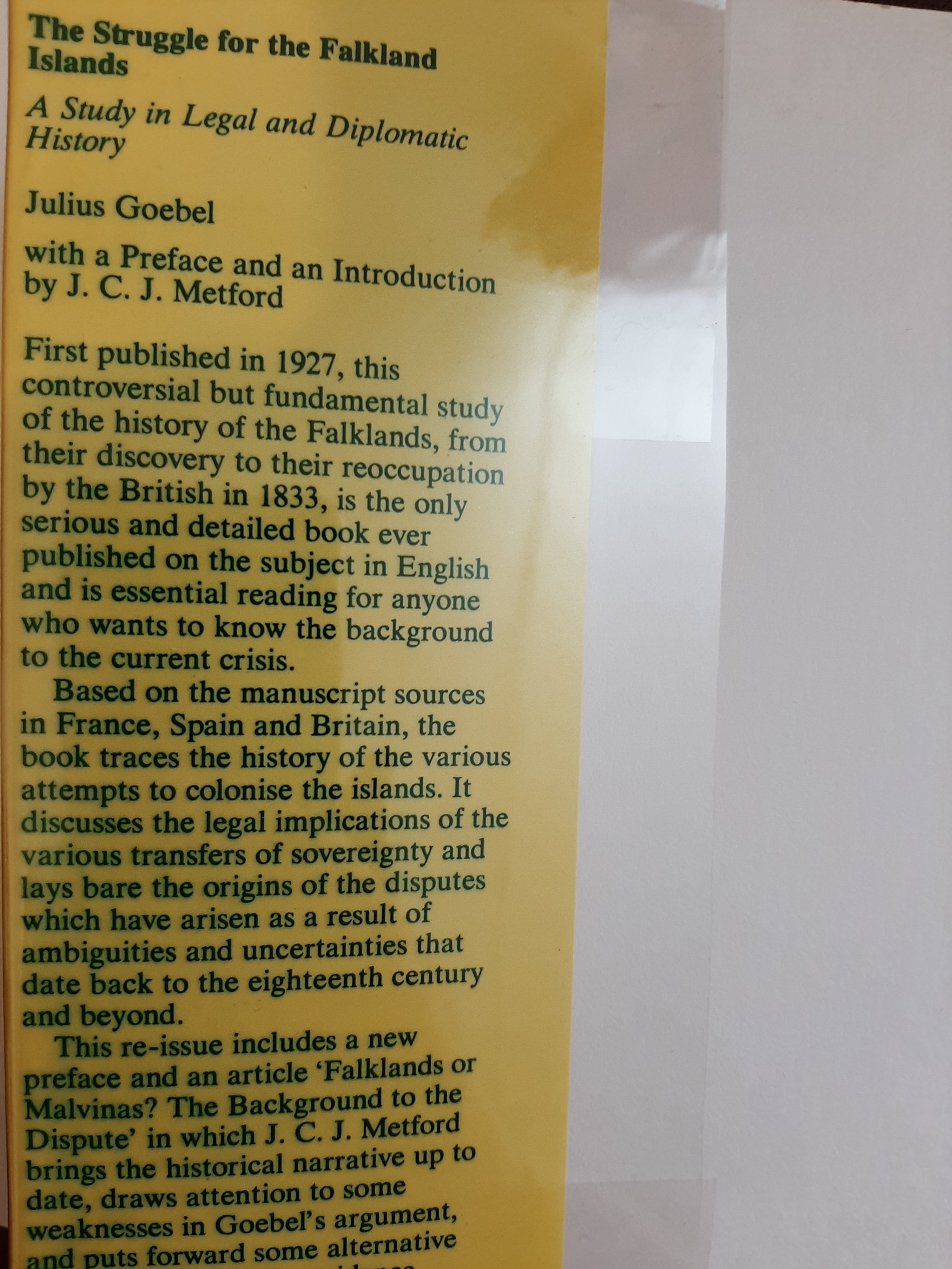First published in 1927, 'Struggle for the Falkland Islands' was reprinted by Yale University Press after Argentina invaded the Falkland Islands in 1982. Three reviews from the time of publication: "One byproduct of this text is a clear detailing of the effects of European conflicts on the rest of the world. In this case, we see how complex diplomatic manipulations between England, France, and Spain dramatically affected the evolution of nations in the Americas. Even if one is not interested in the Falklands, or if you prefer, the Malvinas, this detailed study of diplomatic interplay is well worth the price."Jack Beidler, Best Sellers "Provides an unrivalled collection of evidence relating to the history of the Falklands dispute during the pre-1833 period. . . . A major source."-Peter Beck, The Guardian (London) "For anyone interested in the early background of the crisis, Goebel is essential reading. His treatment is encyclopedic and, at times, brilliant. New issues and new sets of principles, such as the self-determination of peoples, have arisen since he wrote the book. But these in no way detract from a work that remains a classic study of diplomacy and international law."Paul B. Goodwin, Jr., History