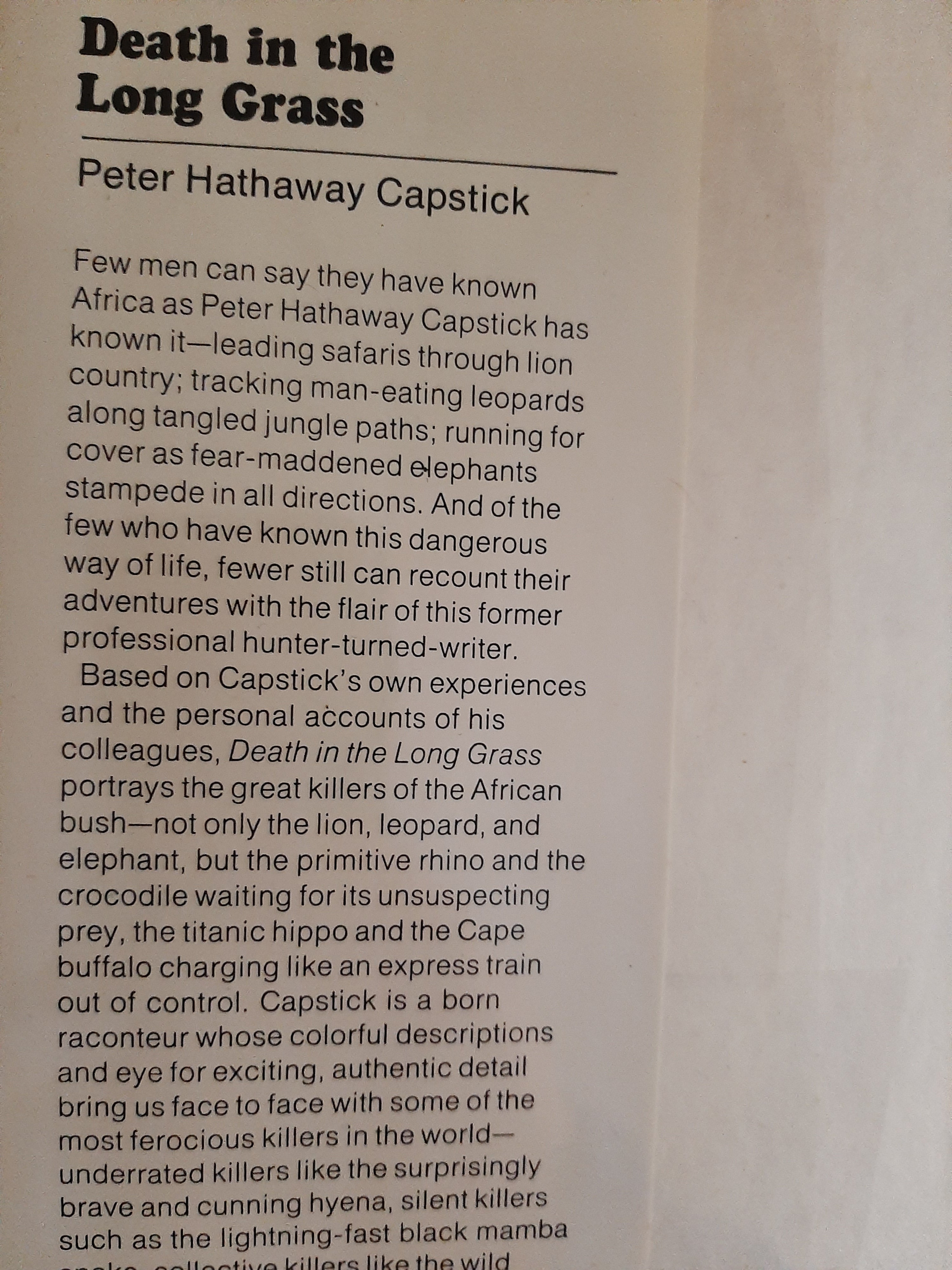 As thrilling as any novel, as taut and exciting as any adventure story, Peter Hathaway Capstick's Death in the Long Grass takes us deep into the heart of darkness to view Africa through the eyes of one of the most renowned professional hunters. Few men can say they have known Africa as Capstick has known it--leading safaris through lion country; tracking man-eating leopards along tangled jungle paths; running for cover as fear-maddened elephants stampede in all directions. And of the few who have known this dangerous way of life, fewer still can recount their adventures with the flair of this former professional hunter-turned-writer. Based on Capstick's own experiences and the personal accounts of his colleagues, Death in the Long Grass portrays the great killers of the African bush--not only the lion, leopard, and elephant, but the primitive rhino and the crocodile waiting for its unsuspecting prey, the titanic hippo and the Cape buffalo charging like an express train out of control. Capstick was a born raconteur whose colorful descriptions and eye for exciting, authentic detail bring us face to face with some of the most ferocious killers in the world--underrated killers like the surprisingly brave and cunning hyena, silent killers such as the lightning-fast black mamba snake, collective killers like the wild dog. Readers can lean back in a chair, sip a tall, iced drink, and revel in the kinds of hunting stories Hemingway and Ruark used to hear in hotel bars from Nairobi to Johannesburg, as veteran hunters would tell of what they heard beyond the campfire and saw through the sights of an express rifle.