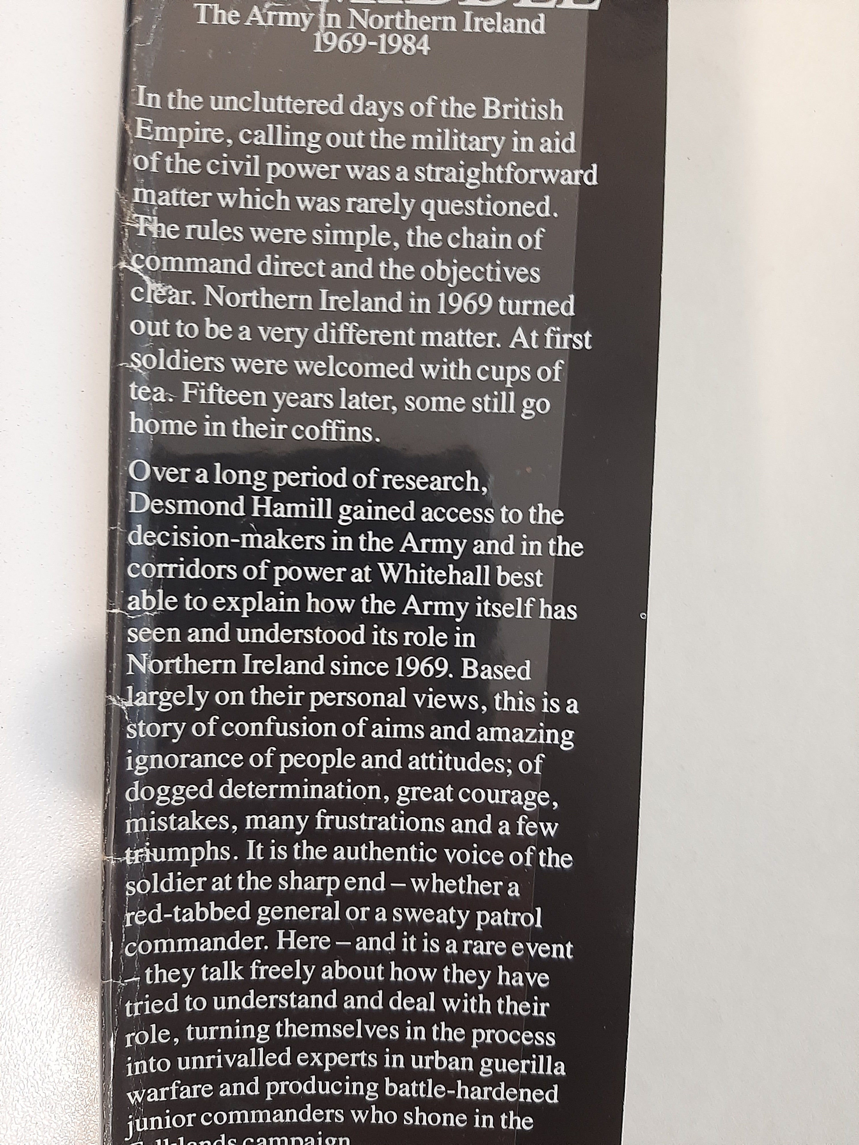 'Over a long period of research, Desmond Hamill gained access to the decision-makers in the Army and in the corridors of power at Whitehall best able to explain how the Army itself has seen and understood its role in Northern Ireland since 1969. Based largely on their personal views, this is a story of confusion of aims and amazing ignorance of people and attitudes; of dogged determination, great courage, mistakes, many frustrations and a few triumphs. It is the authentic voice of the soldier at the sharp end - whether a red-tabbed general or a sweaty patrol commander.'