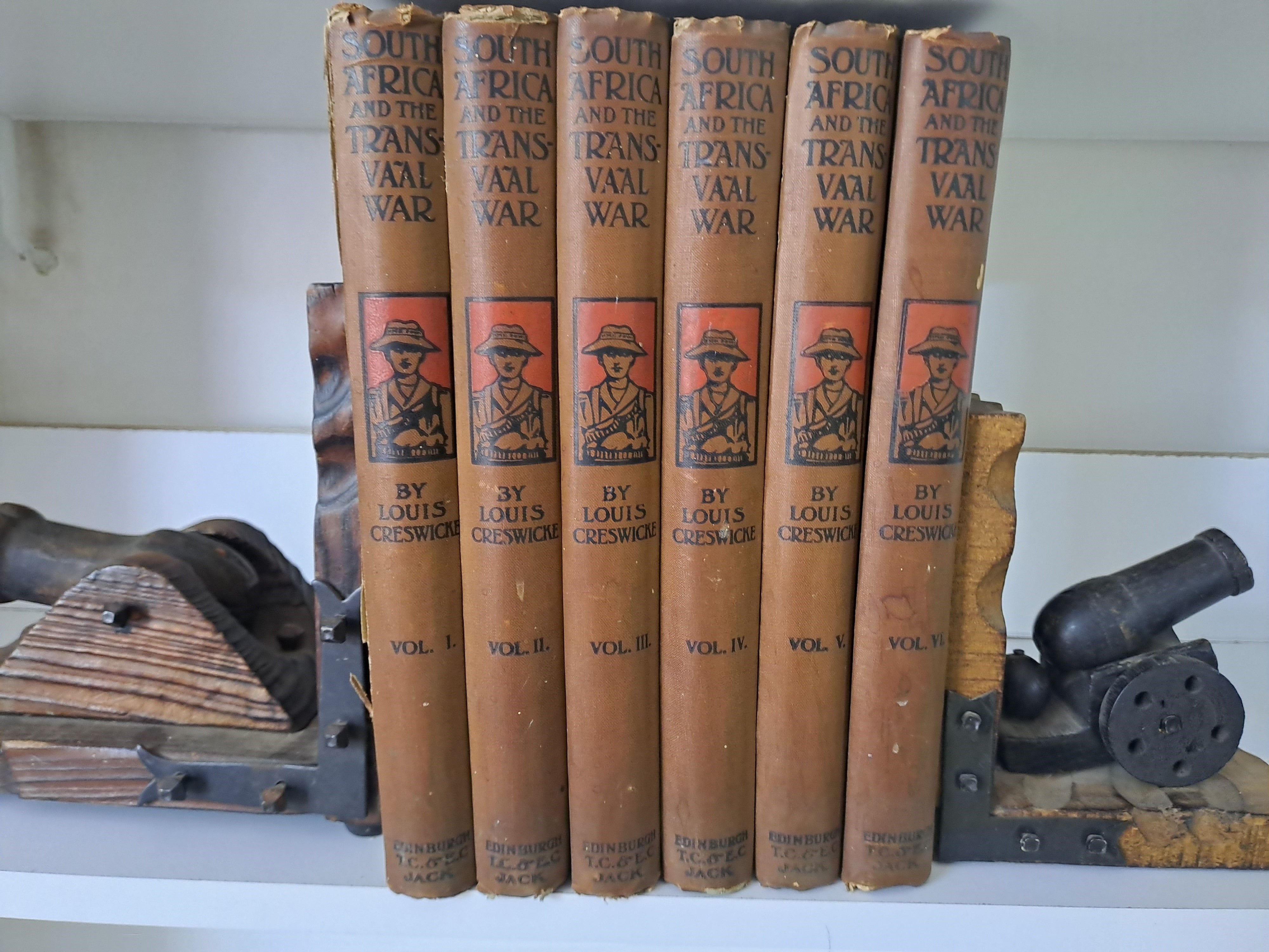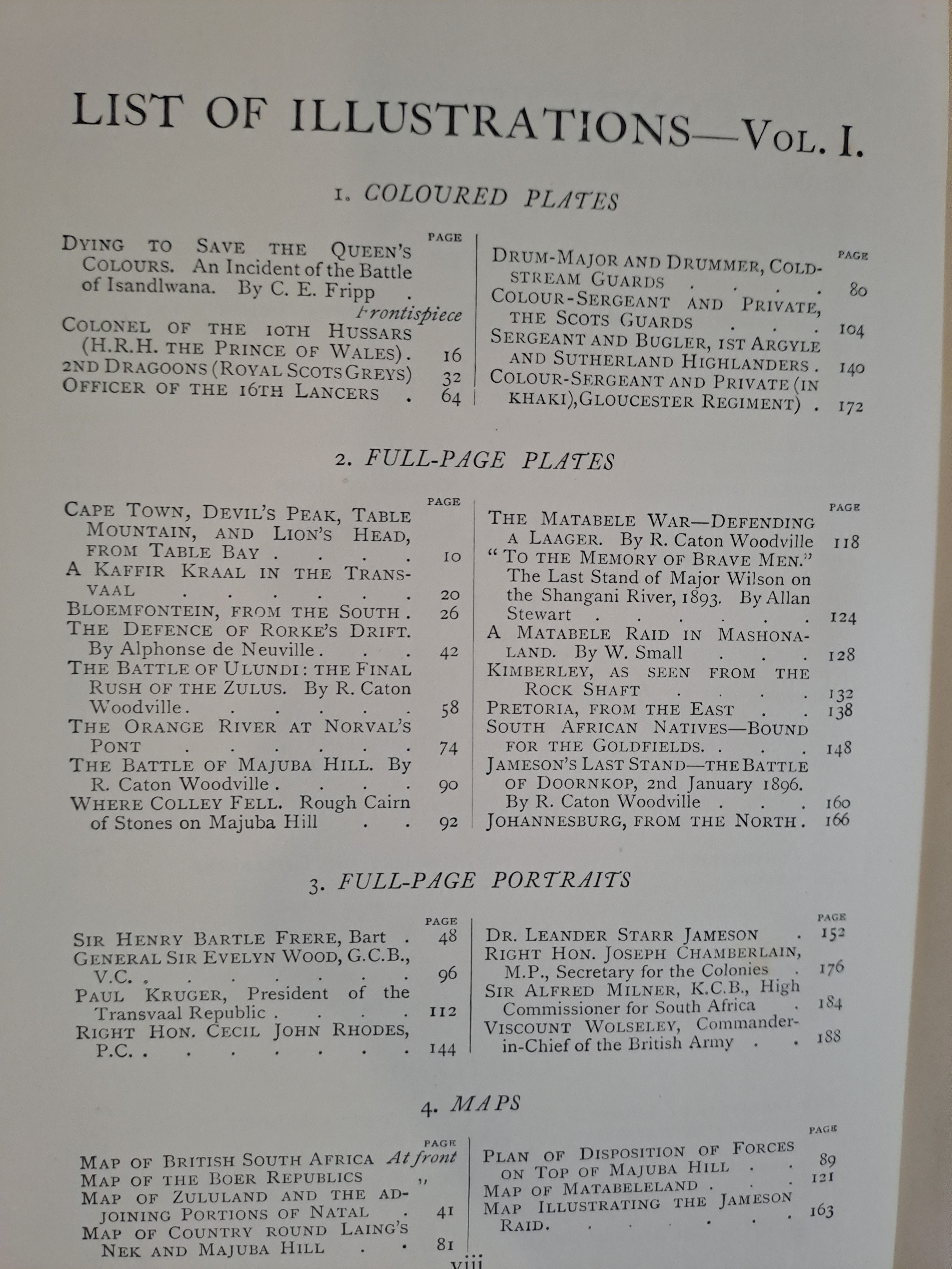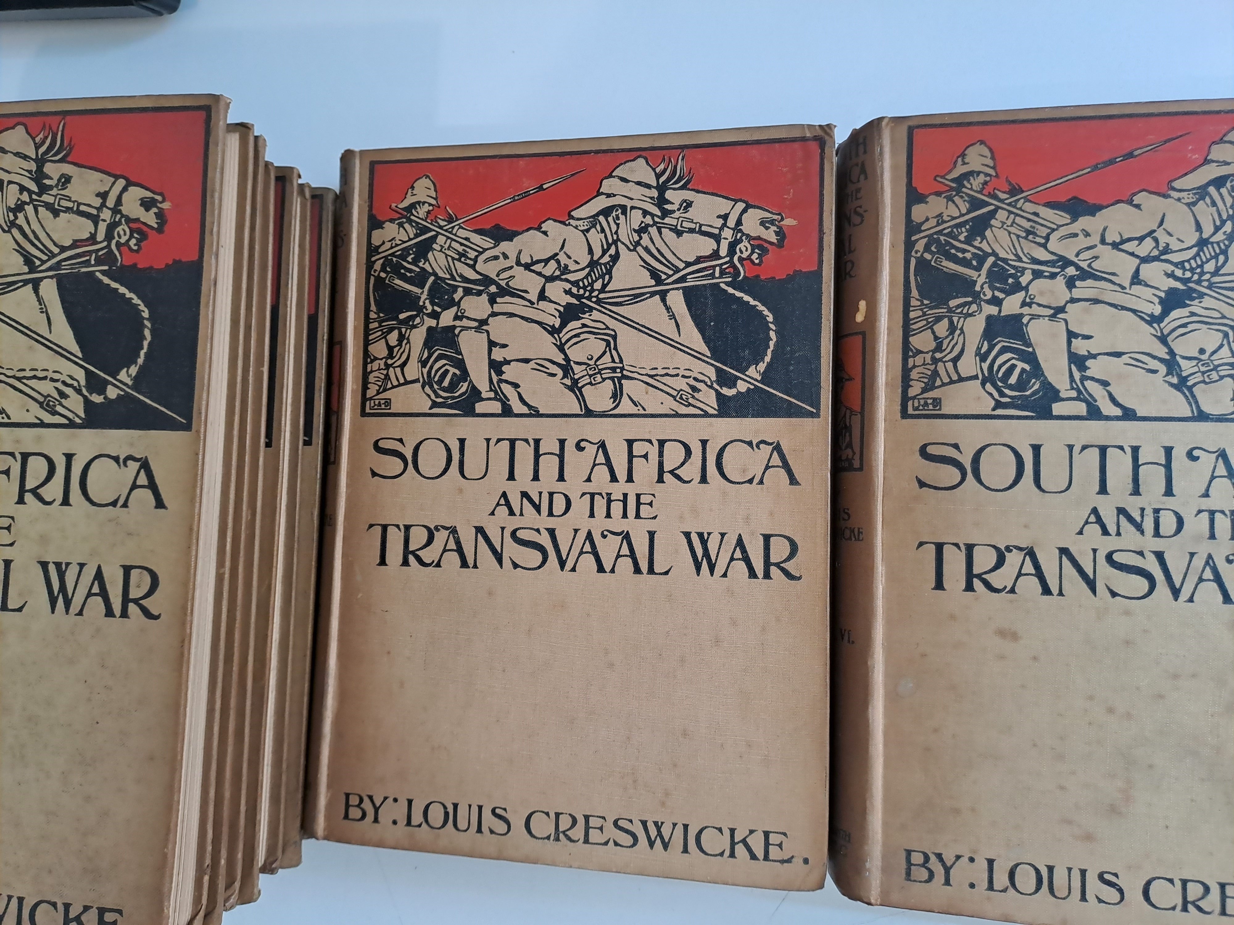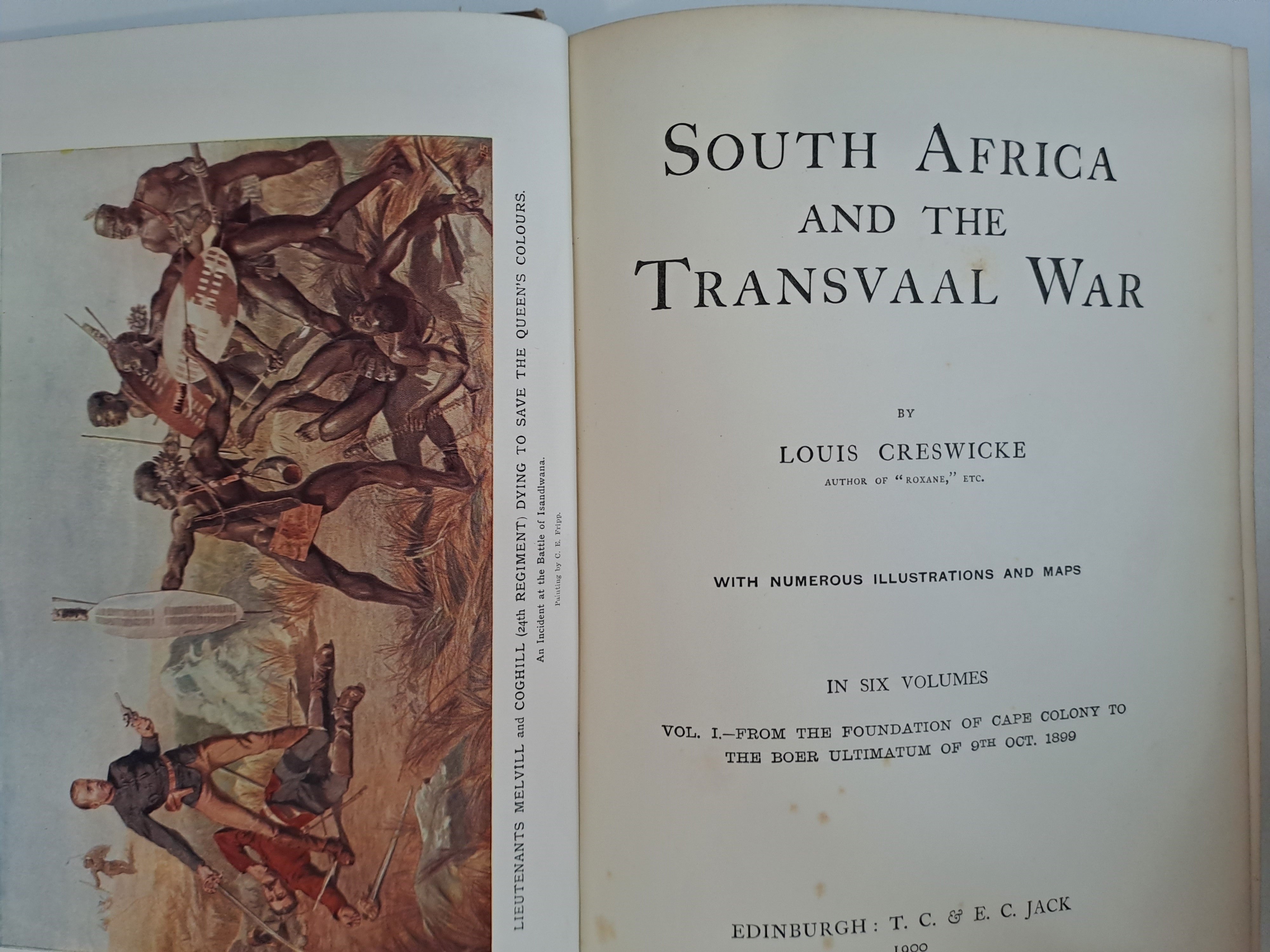 South African and the Transvaal War in 6 volumes (255 x 185 mm), over 1600 pages, colour frontispiece in each volume, 64 colour plates, 61 sepia portraits, numerous black & white illustrations, 77 maps - 5 folding, original pictorial khaki coloured cloth - soiled and with chipping at the top and bottom of some spines, corners worn, some soiling tanning and spotting of pages, especially on the front and last pages of each book, contents generally good.