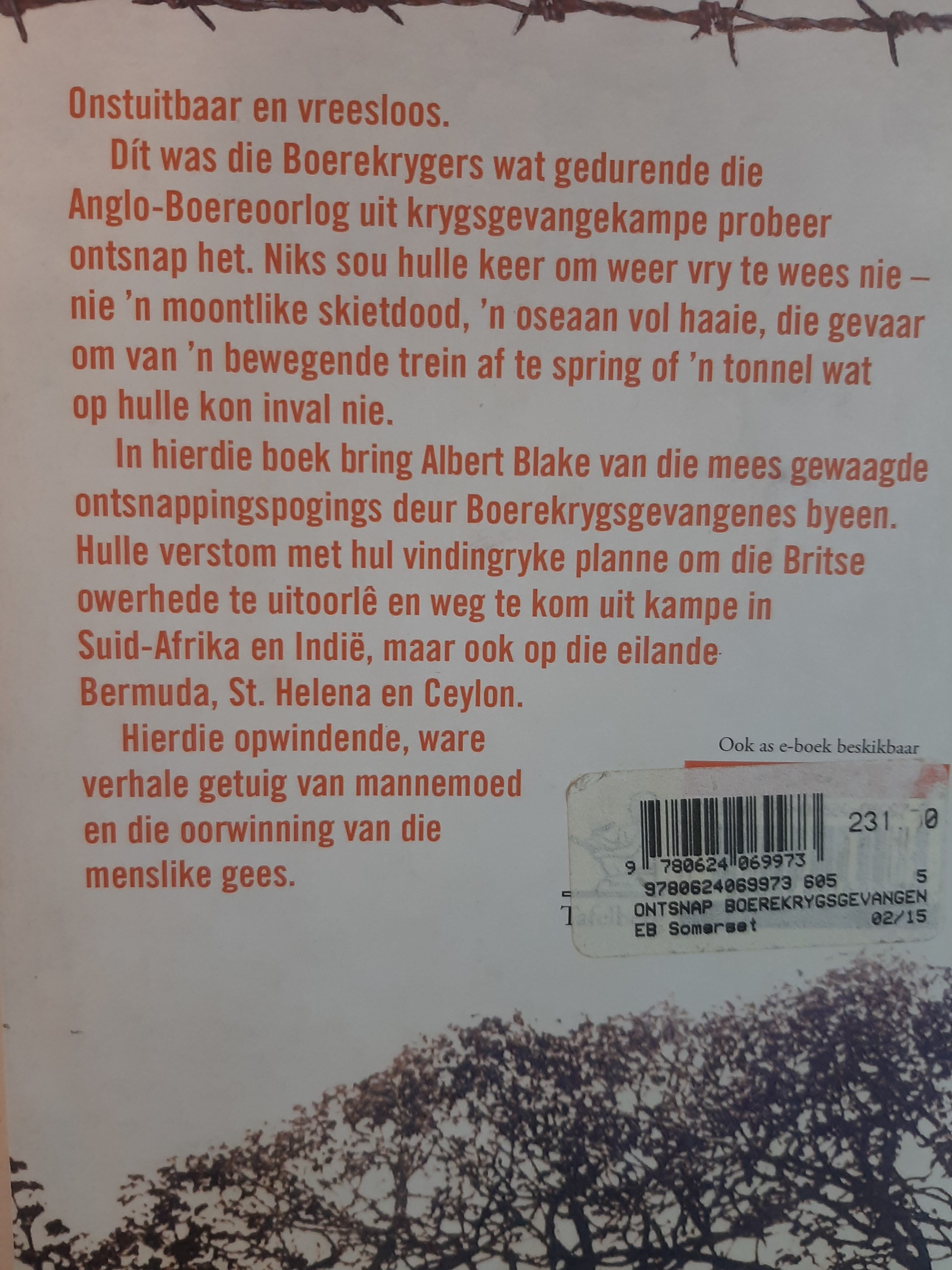 Onstuitbaar en vreesloos. Só was die Boerekrygers wat gedurende die Anglo-Boereoorlog uit krygsgevangekampe probeer ontsnap het. Niks sou hulle keer om weer vry te wees nie: nie 'n moontlike skietdood, 'n oseaan vol haaie, die gevaar om van 'n bewegende trein af te spring of 'n tonnel wat op hulle kon inval nie. In hierdie boek bring Albert Blake van die mees gewaagde ontsnappingspogings deur Boerekrygsgevangenes byeen. Hulle verstom met hul vindingryke planne om die Britse owerhede te uitoorlê en weg te kom uit kampe in Suid-Afrika en Indië, maar ook op die eilande van Bermuda, St. Helena en Ceylon. Hierdie opwindende, ware verhale getuig van mannemoed en die oorwinning van die menslike gees.