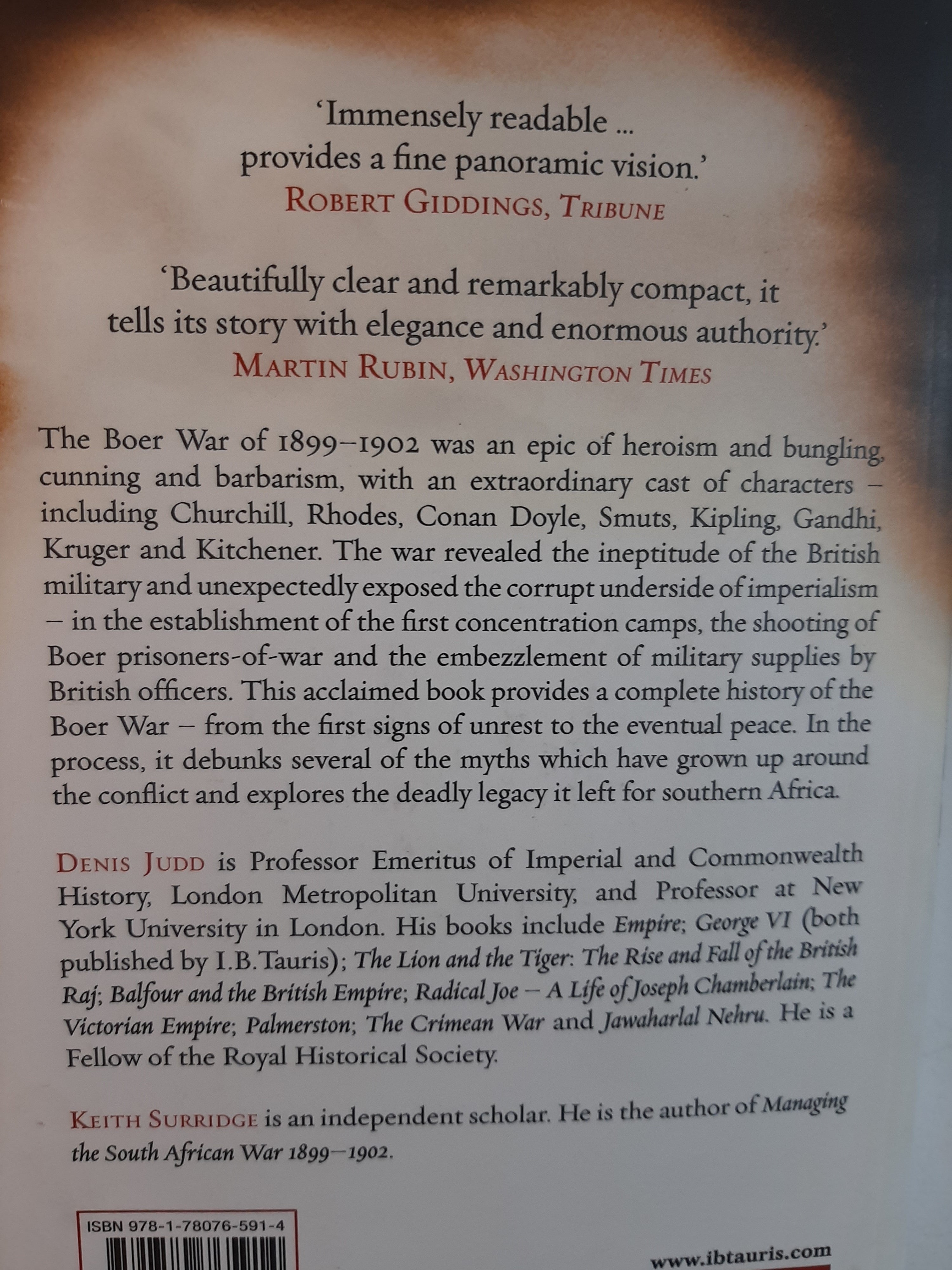 - "The Boer War was an epic both of heroism and of barbarism. Fought by the British against the Dutch inhabitants of South Aftrica, the Boer War had an extraordinary cast of characters including Commanders-in chief buller, Roberts and Kitchener, Winston Churchill, Arthur Conan Doyle, Emily Hobhouse, Rudyard Kipling, and Gandhi. The war revealed the ineptitude of the British military, and exposed the corrupt underside of British imperialism . For the first time, Judd and Surridge debunk several myths. There was not, for instance, a straightforward divide between the Boers and British. In fact, the overriding aim of both sides was to maintain European supremacy and to keep Africans and Indians "in their place." Giving us a sense of how the Apartheid era was born, "The Boer War "is a gripping read."