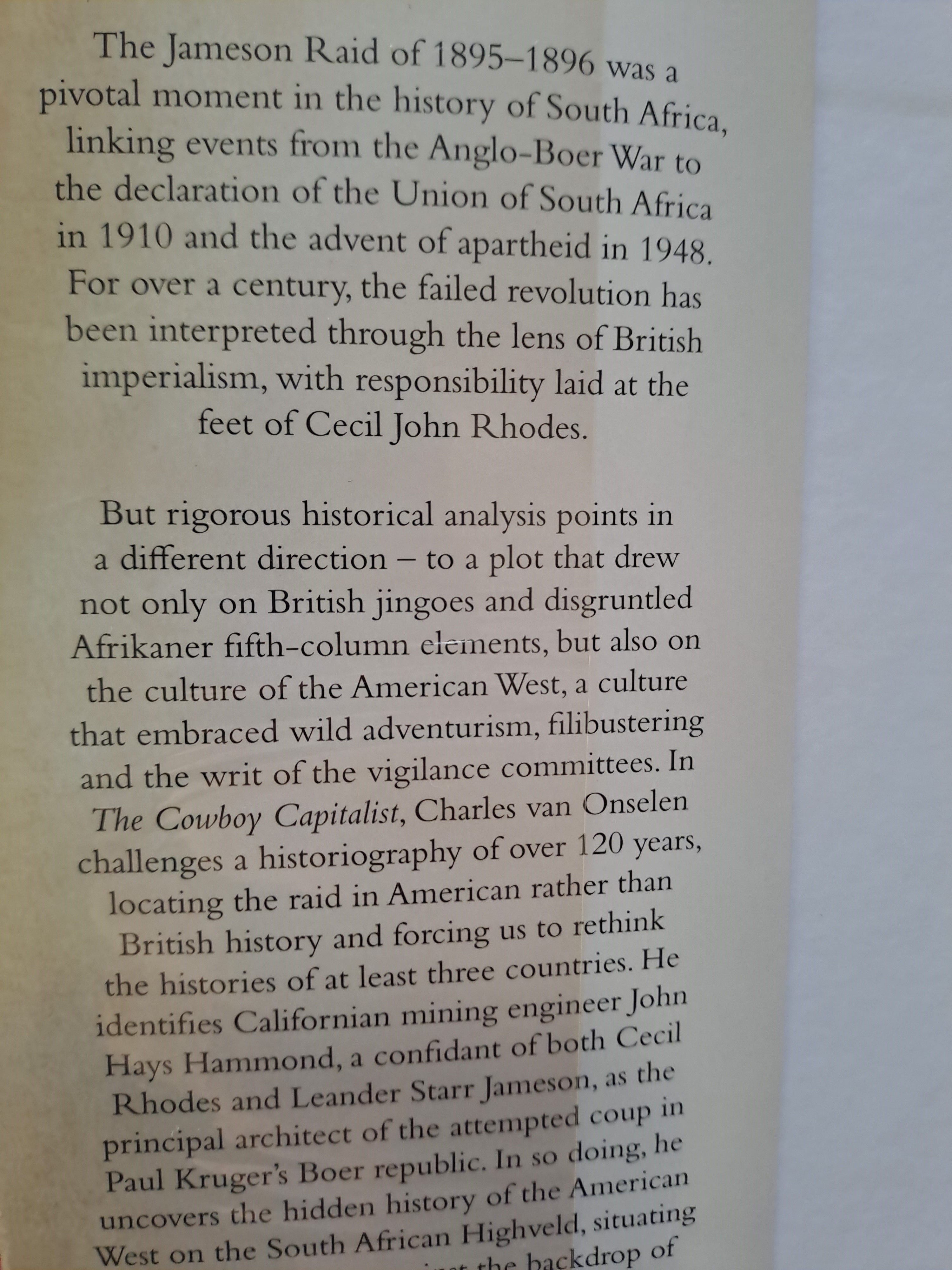 In The Cowboy Capitalist, Charles van Onselen challenges a historiography of over 120 years, locating the raid in American rather than British history and forcing us to rethink the histories of at least three nations. Through a close look at the little-remembered figure of John Hays Hammond, a confidant of both Rhodes and Jameson, he discovers the American Old West on the South African Highveld.