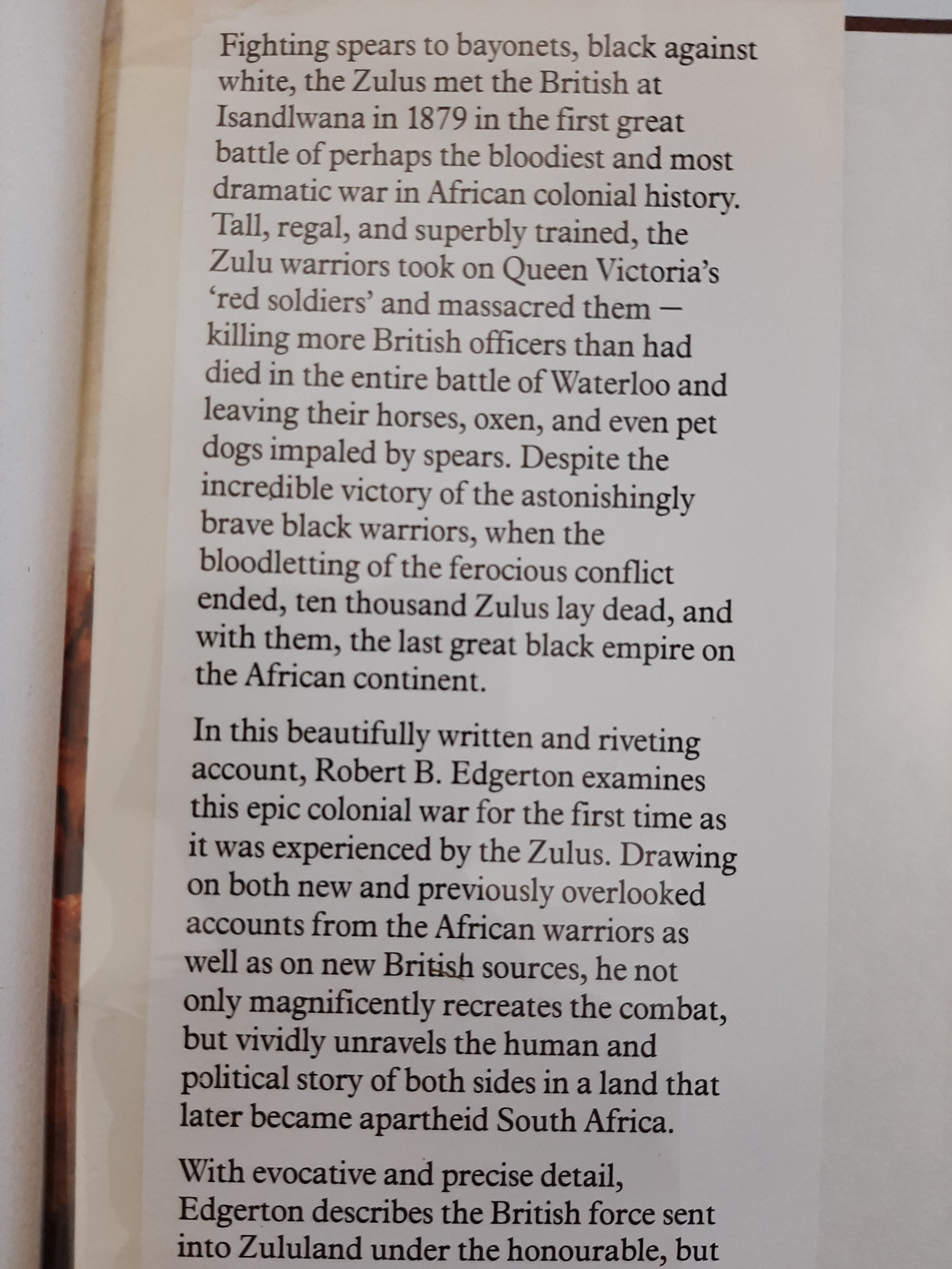 "This was a most interesting book. Robert Edgerton not only provided excellent and powerful descriptions of battles but inciteful commentary into the political times, i.e., the Victorian age and the cultures of both the Zulu Nation and the British Empire. The book concludes with a chapter describing the history of Africa, colonialism, and the genocidal murder of the native populations.