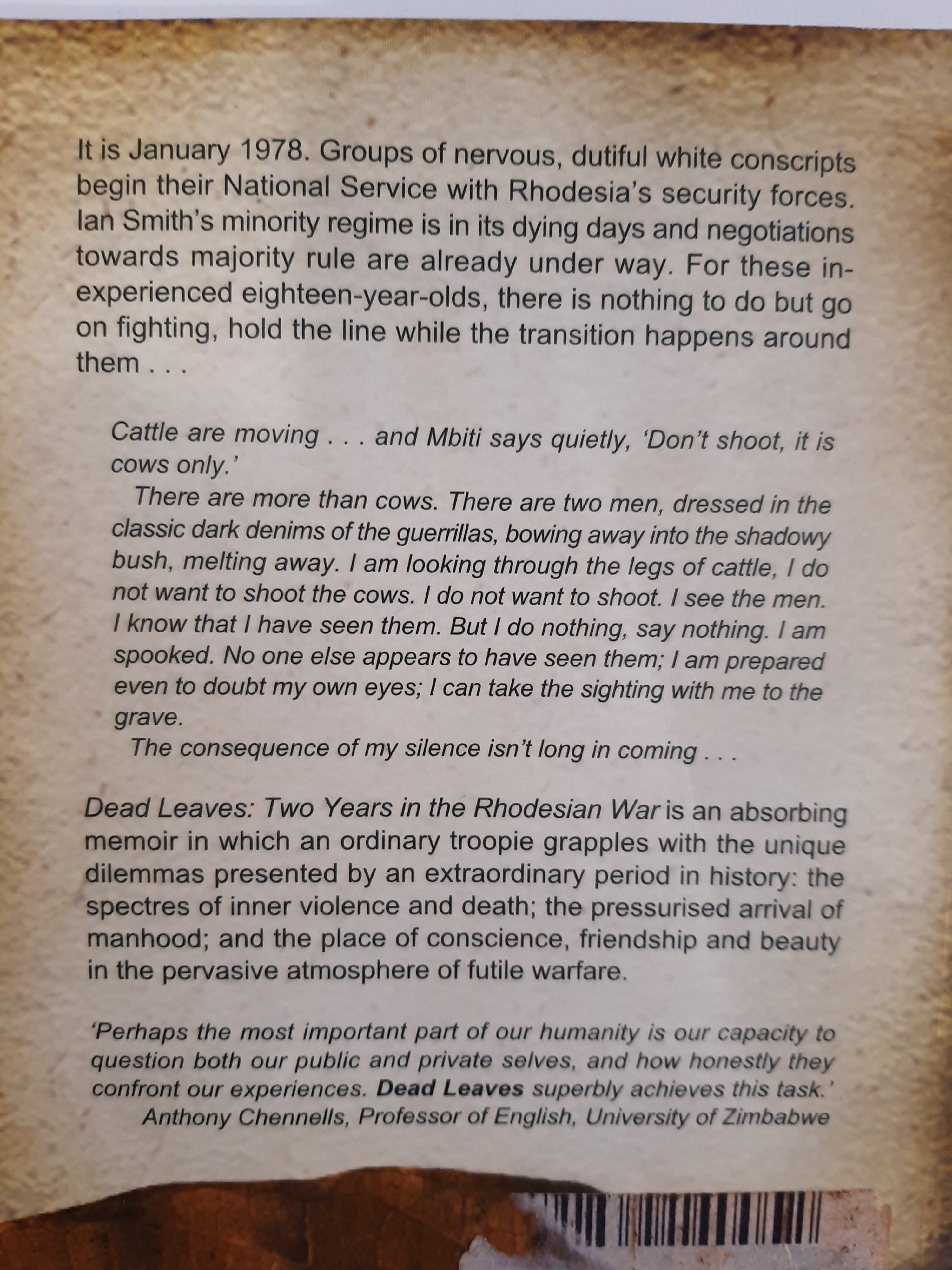 It is January, 1978. Groups of nervous, dutiful white conscripts begin their National Service with Rhodesia's security forces. Ian Smith's minority regime is in its dying days and negotiations towards majority rule are already under way. For these inexperienced eighteen-year-olds, there is nothing to do but go on fighting, and hold the line while the transition happens around them. Dead Leaves is a richly textured memoir in which an ordinary troopie grapples with the unique dilemmas presented by an extraordinary period in history - the specters of inner violence and death; the pressurized arrival of manhood; and the place of conscience, friendship and beauty in the pervasive atmosphere of futile warfare.