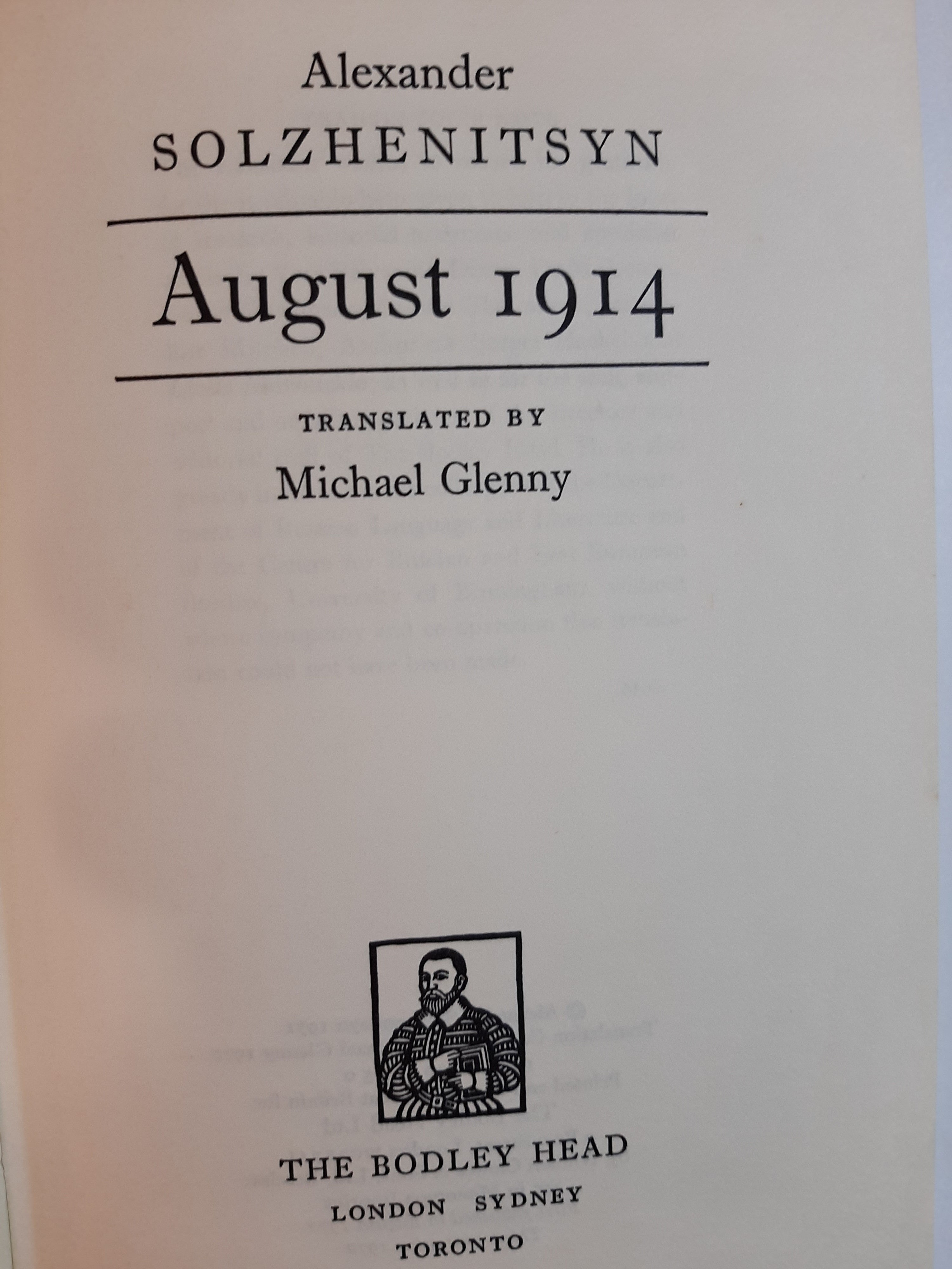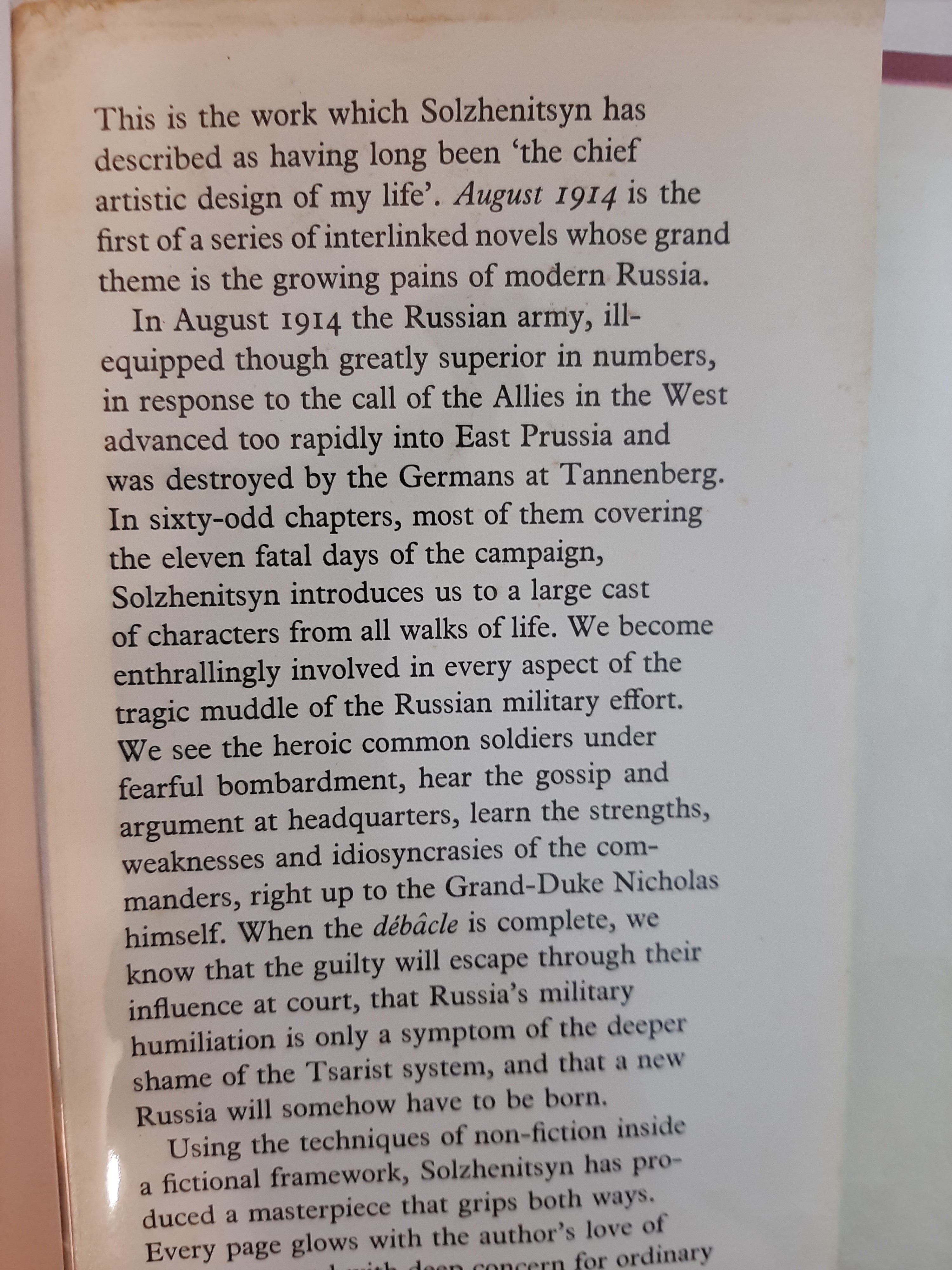 August 1914 is the first volume of Solzhenitsyn's epic, The Red Wheel; the second is November 1916. Each of the subsequent volumes will concentrate on another critical moment or "knot," in the history of the Revolution.