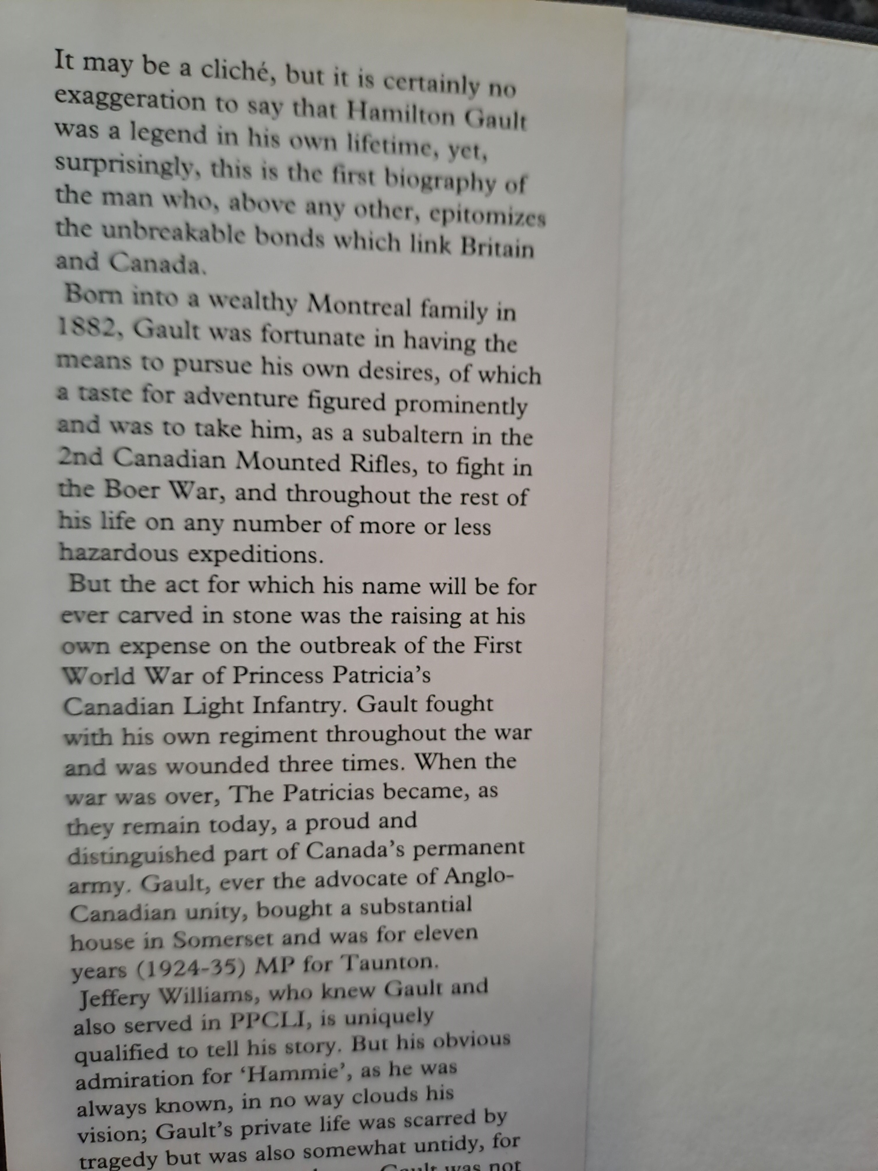 This is the biography of Hamilton Gault, who was the first Canadian into the trenches and the first to b e decorated. He was meticulous in caring for his men and bec ame a legend in his lifetime. '