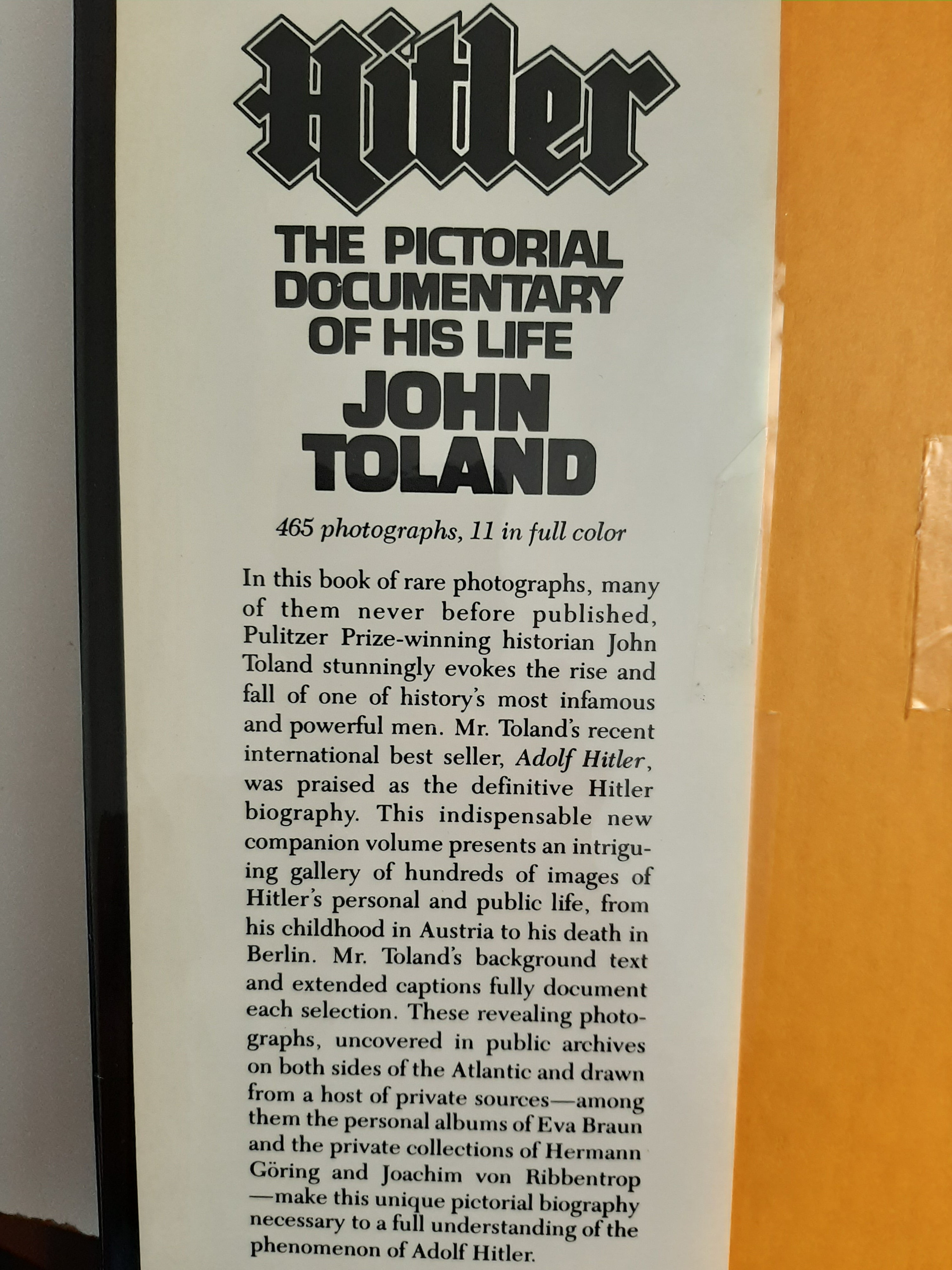 Despite extensive research the question of what created Adolph Hitler and why people followed him still remains unanswered, Toland's massive examination draws on extensive research involving a number of previously unknown or unavailable sources, and includes over 150 taped interviews with people involved in Hitler's private and public life. Toland traces Hitler's rise to power, his astonishing military bravado, and his career from his early successes to his final downfall.