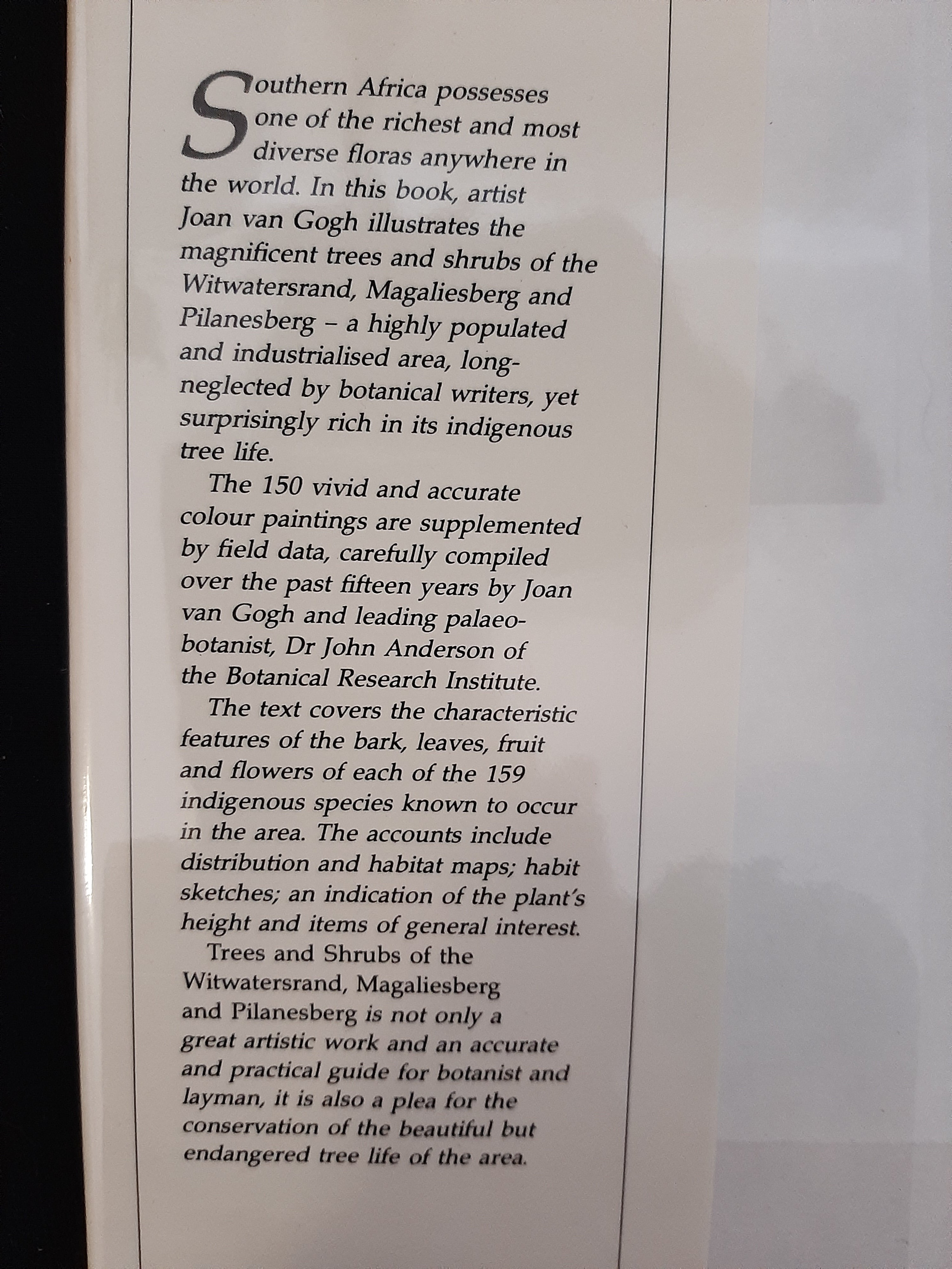 Trees & Shrubs of the Witwatersrand, Magaliesberg & Pilanesberg by Joan van Gogh & John Anderson is not only an artistic work but also a an accurate and practical guide for botanist and layman. It contains 150 vivid colour paintings of trees and shrubs supplemented by field data. It covers the characteristic features of the bark, leaves , fruit and flowers of each of the 159 indigenous species known to occur in the area.