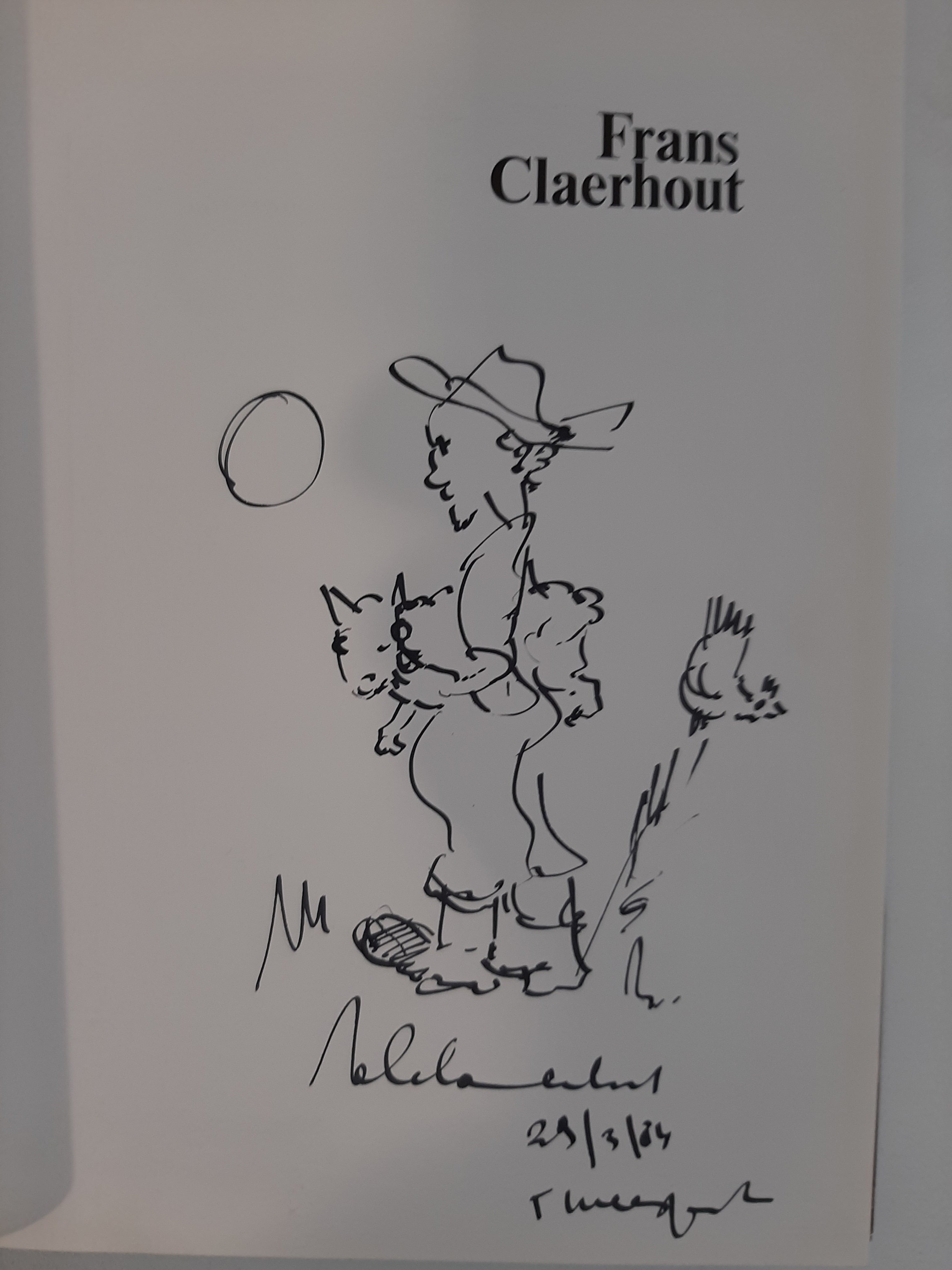Highly Collectible-Autographed by Frans Claerhout and dated 23/3/84 with an original sketch of presumably a farmer with an animal in his arms and a Chicken behind him.