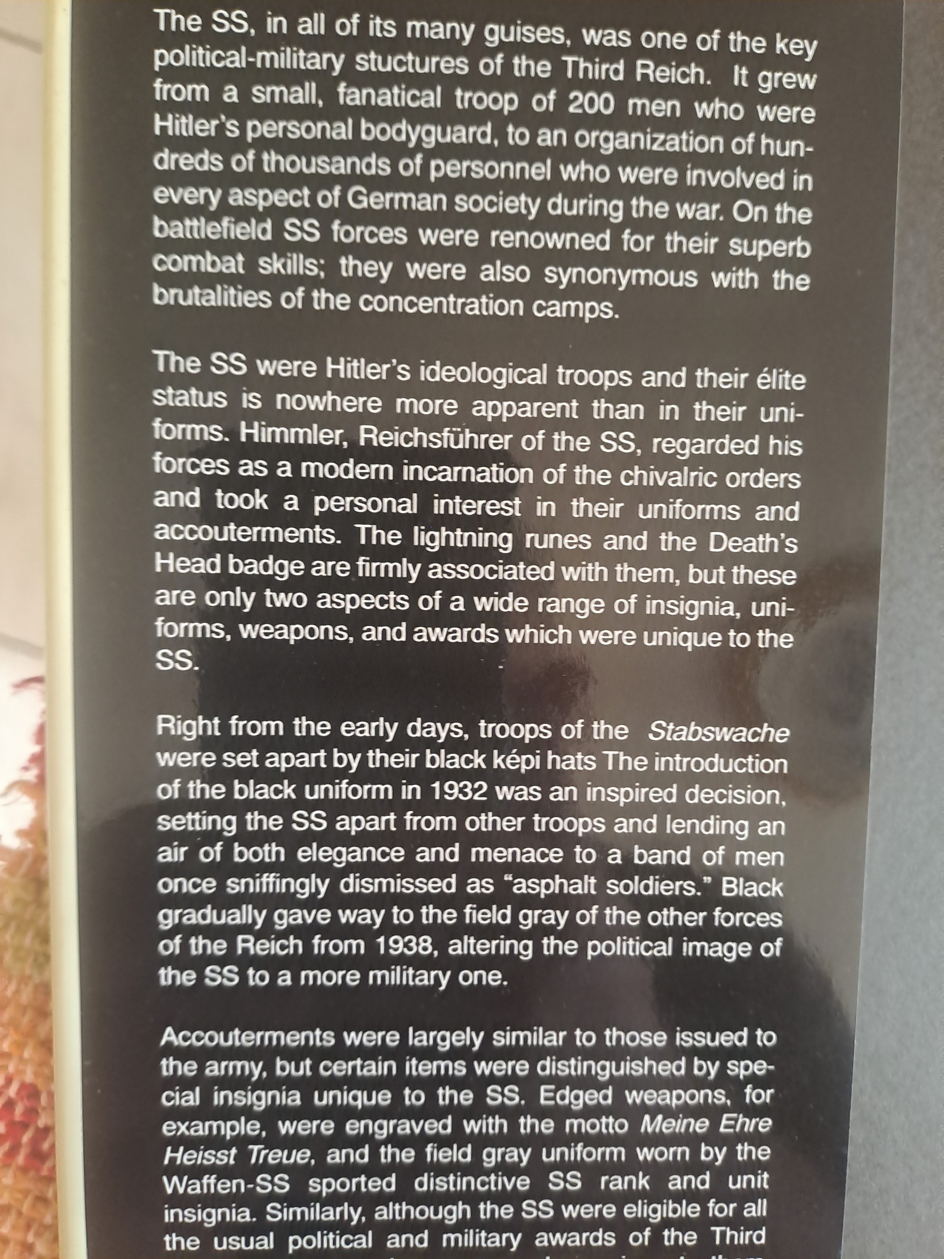 "The SS, in all of its many guises, was one of the key political-military structures of the Third Reich. It grew from a small, fanatical troop of 200 men who were Hitler's personal bodyguard, to an organization of hundreds of thousands of personnel who were involved in every aspect of German society during the war. On the battlefield SS forces were renowned for their superb combat skills; they were also synonymous with the brutalities of the concentration camps.