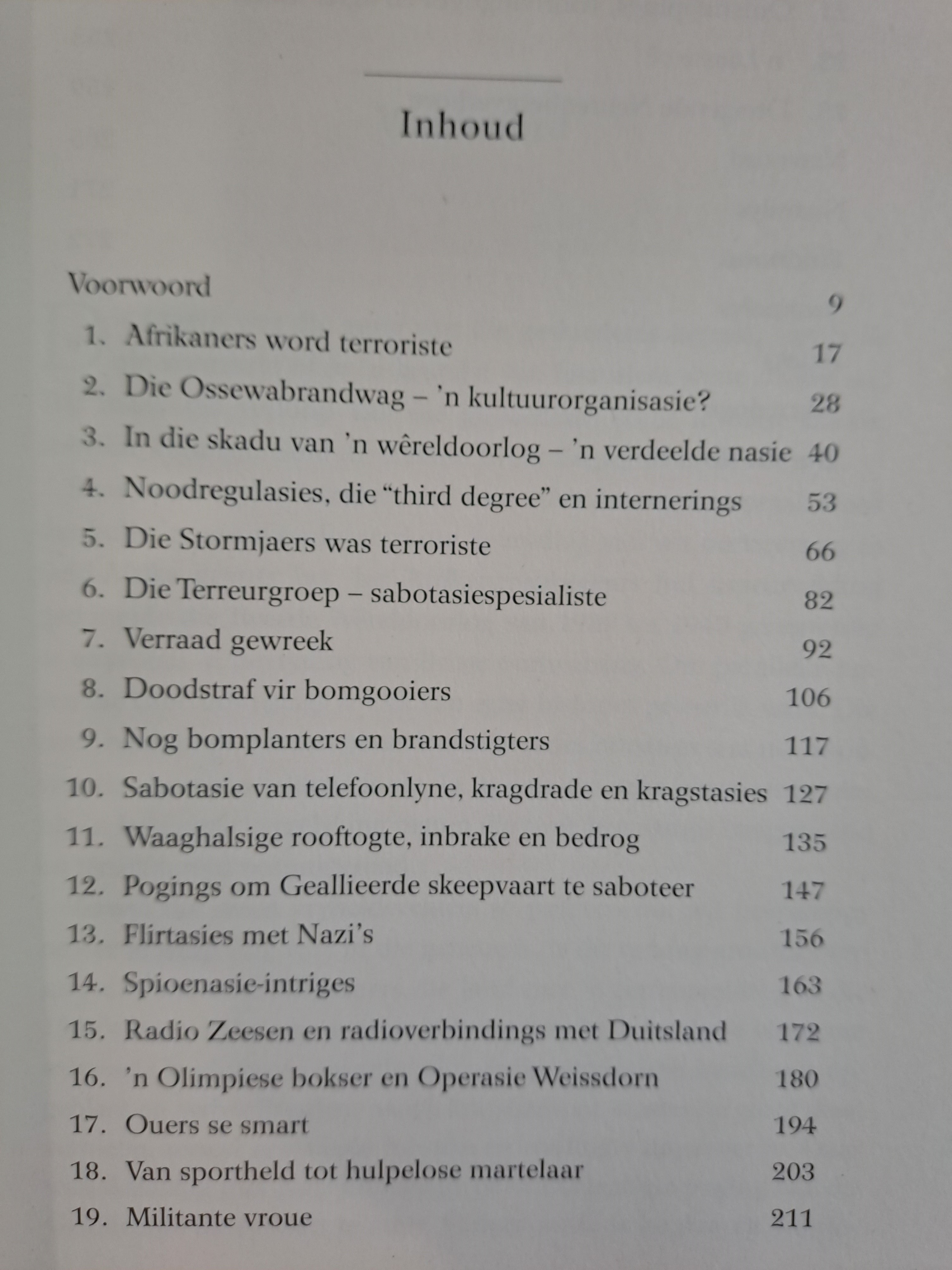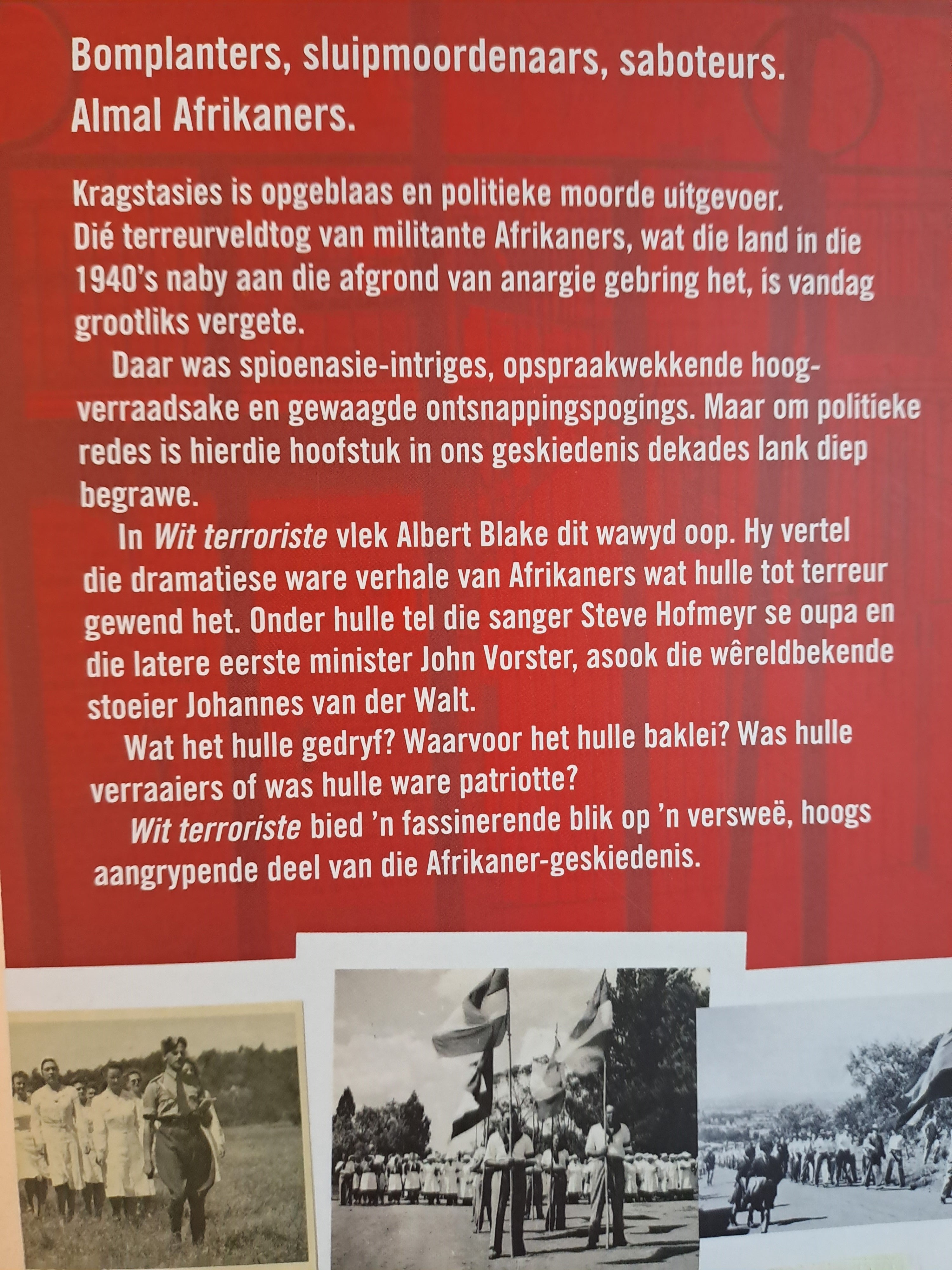 Dié deel van die Afrikaner-geskiedenis is doelbewus diep begrawe: Wit terroriste ― militante Afrikaners ― het gedurende die Ossewabrandwagjare bomme geplant, kragstasies opgeblaas en sluipmoorde uitgevoer. Dié terreurveldtog het Suid-Afrika in die 1940's bitter naby aan 'n afgrond van anargie gebring.
