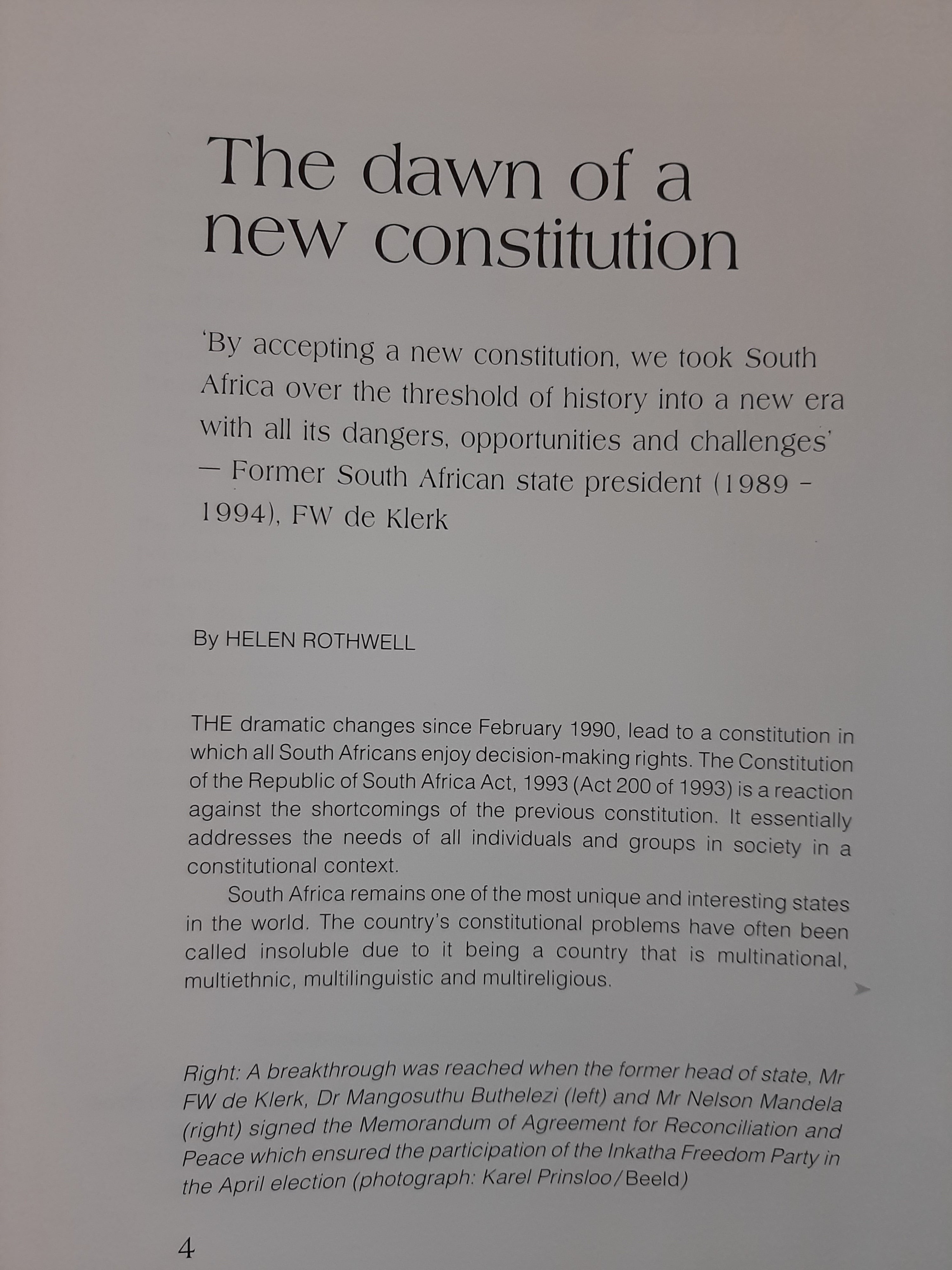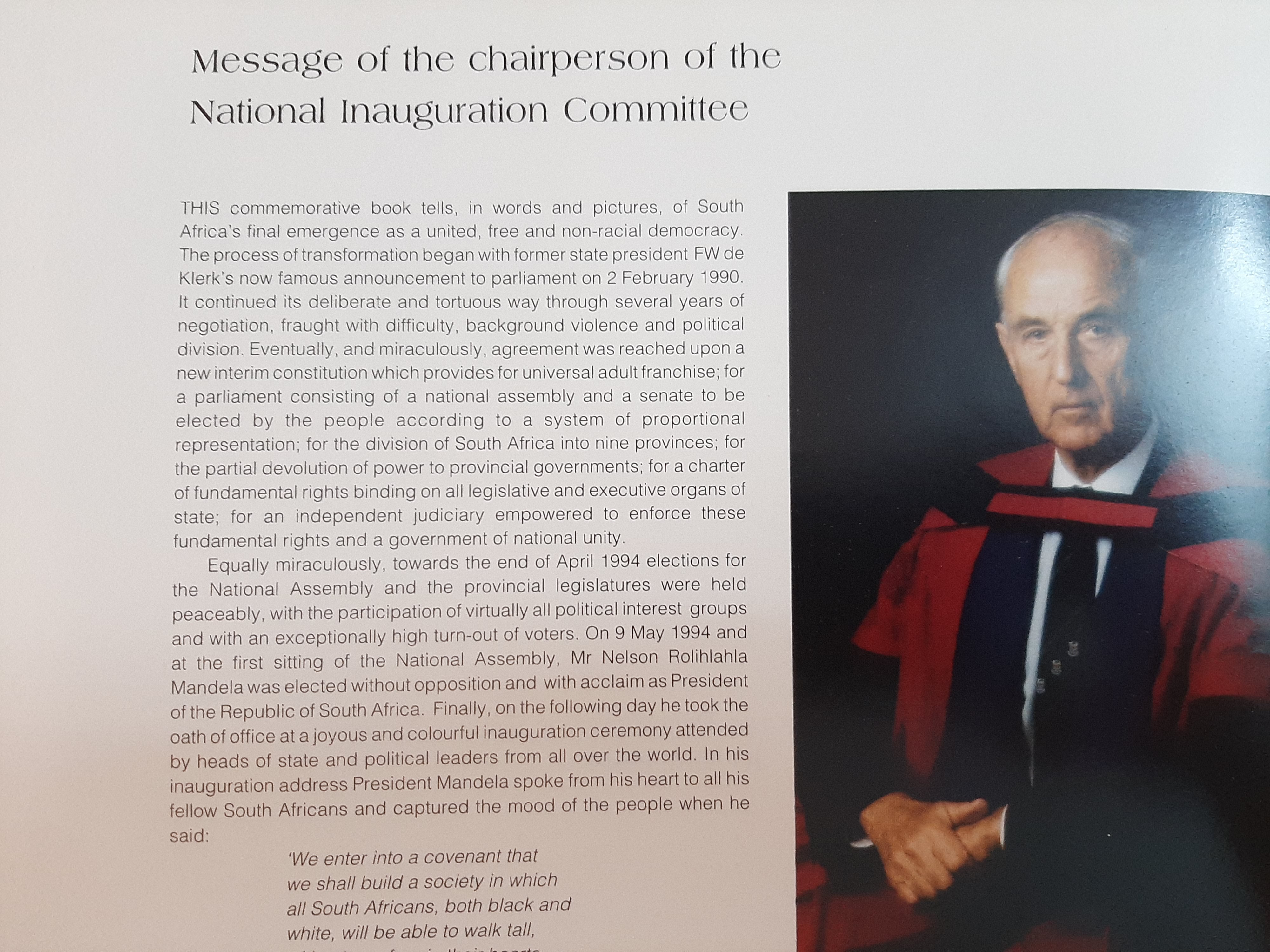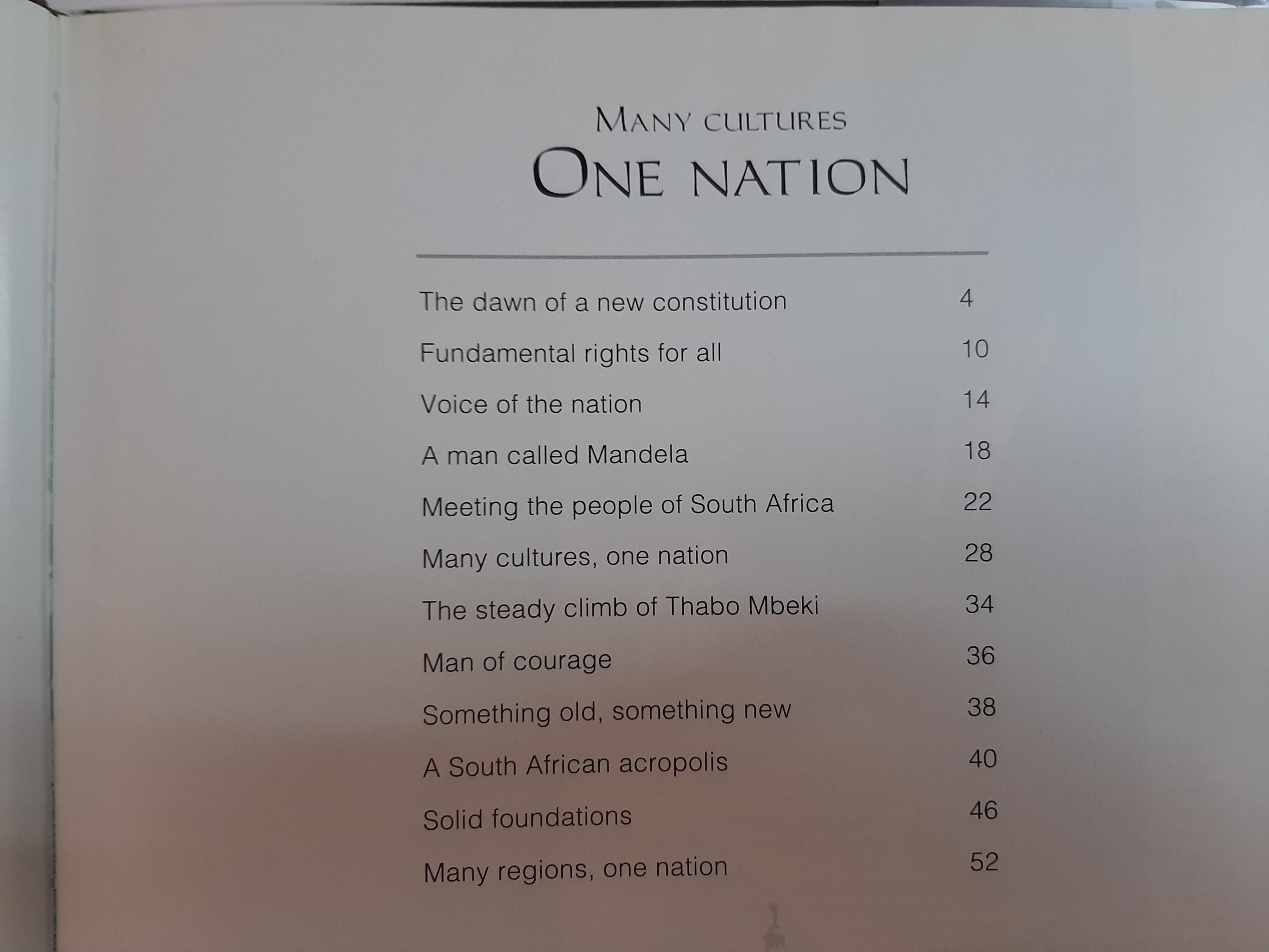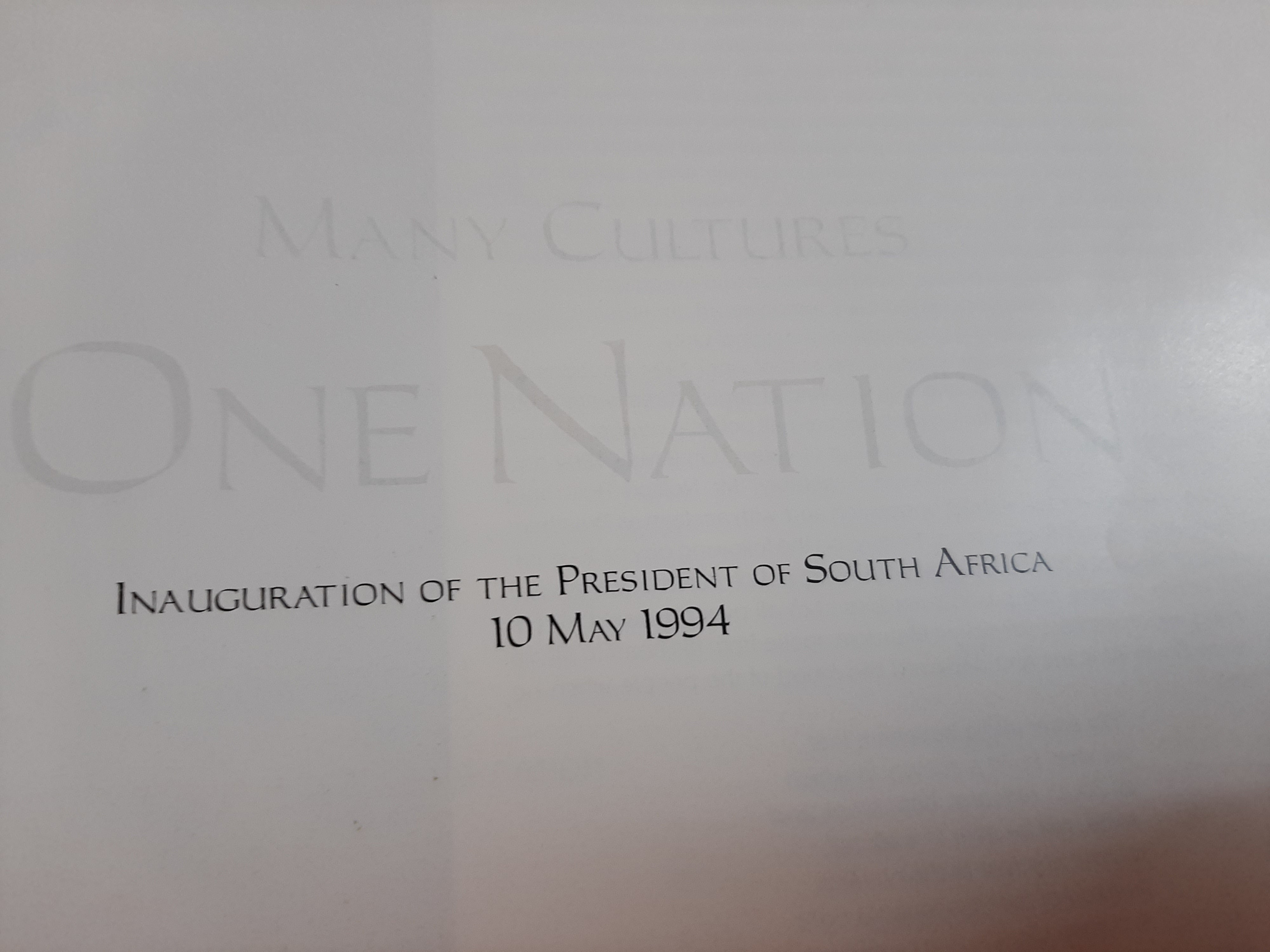 The commemorative volume published in real time by the South African Government highlighting President Nelson Mandela's inauguration. Filled with many exclusive unpublished photographs of the inauguration day. This is the English version of "Vele Kulture, Een Nasie" that was published simultaneously.
