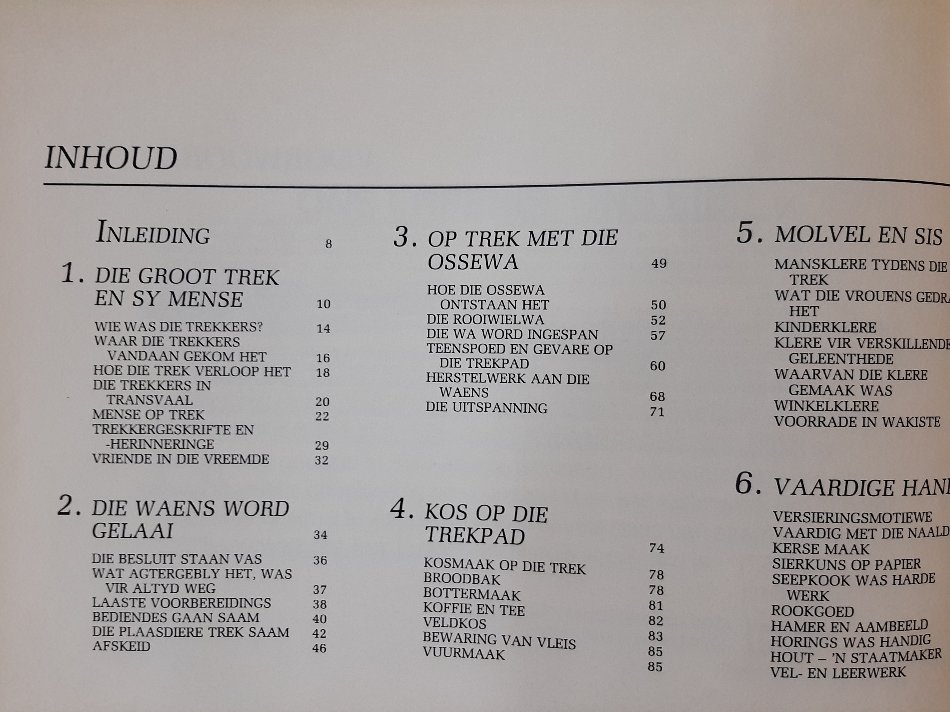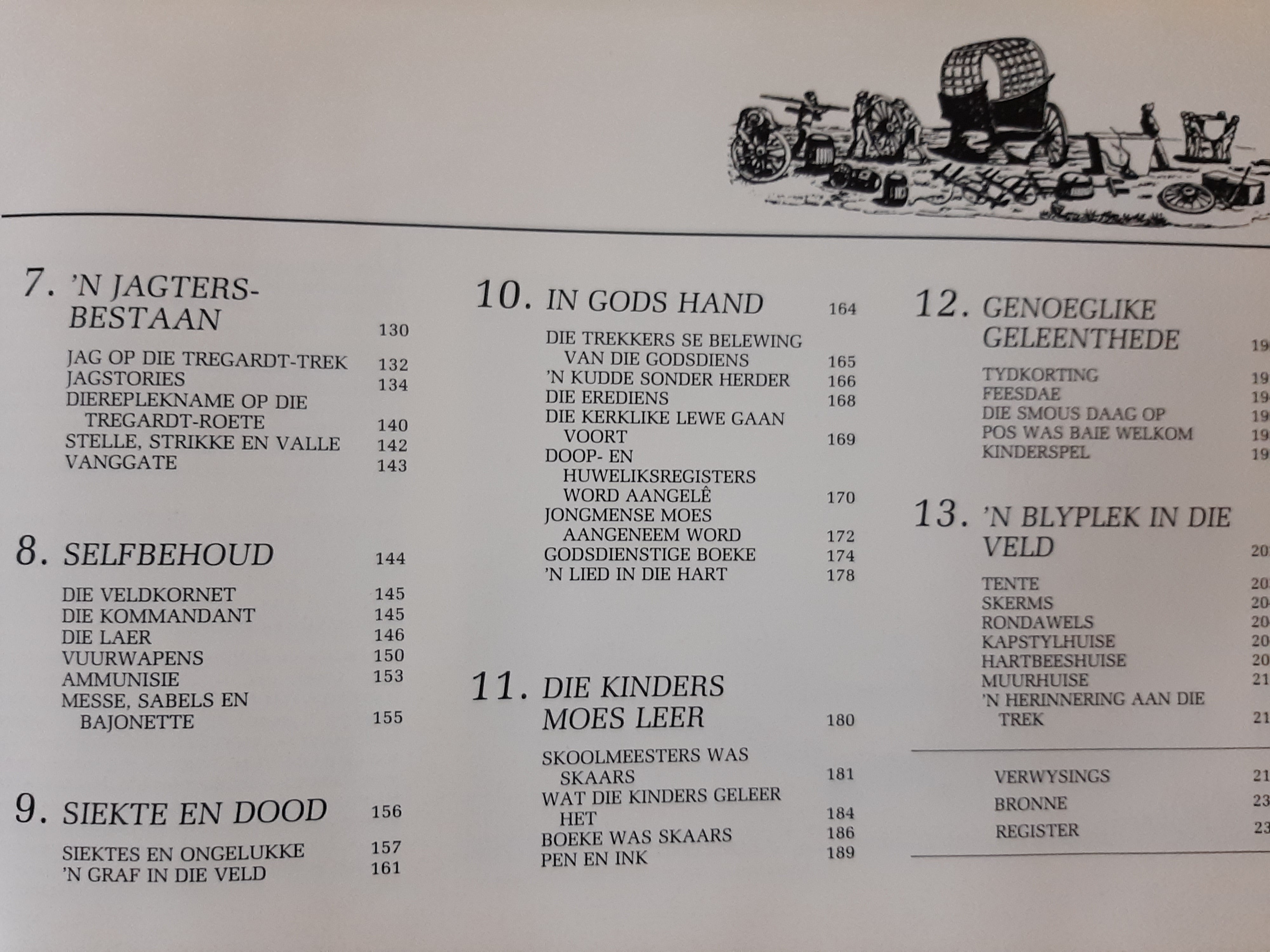 Book in Afrikaans. A well researched book covering all aspects of the daily life of the "Trekkers", from the people, the waggon, clothing, food Rifles, hand guns, etc. Very well illustrated with many full colour pictures.