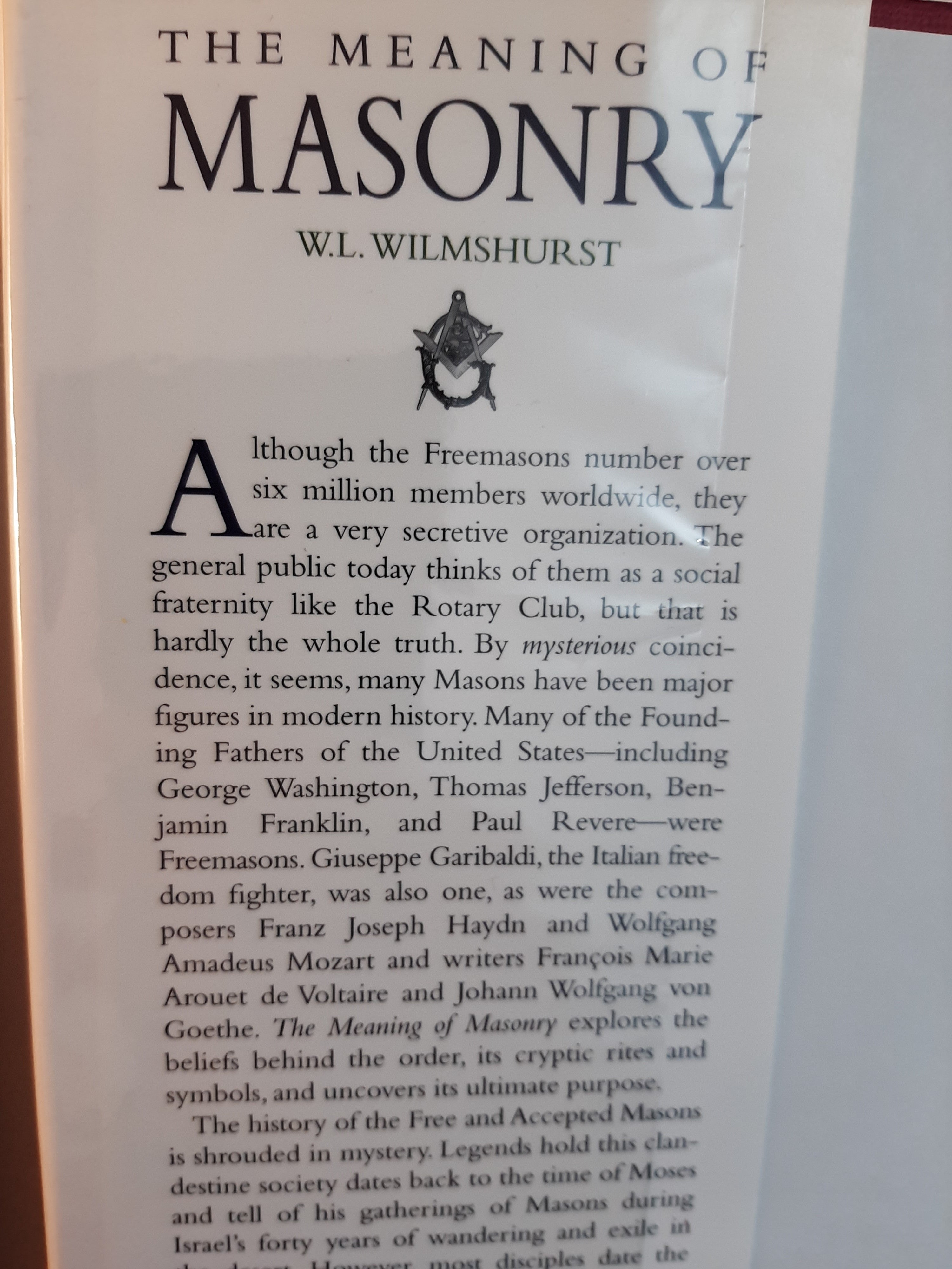 Although the Freemasons number over six million members worldwide, they are a very secretive organization. the general public today thinks of them as a social fraternity like the Rotary Club, but that is hardly the whole truth. By mysterious coincidence, it seems, many Masons have been major figures in modern history. many of the Founding Fathers of the United States including George Washington, Thomas Jefferson, Benjamin Franklin, and Paul Revere were Freemasons. Giuseppe Garibaldi, the Italian freedom fighter, was also one, as were the composers Franz Joseph Haydn and Wolfgang Amadeus Mozart and writers François Marie Arouet de Voltaire and Johann Wolfgang von Goethe. The Meaning of Masonry explores the beliefs behind the order, its cryptic rites and symbols, and uncovers its ultimate purpose.