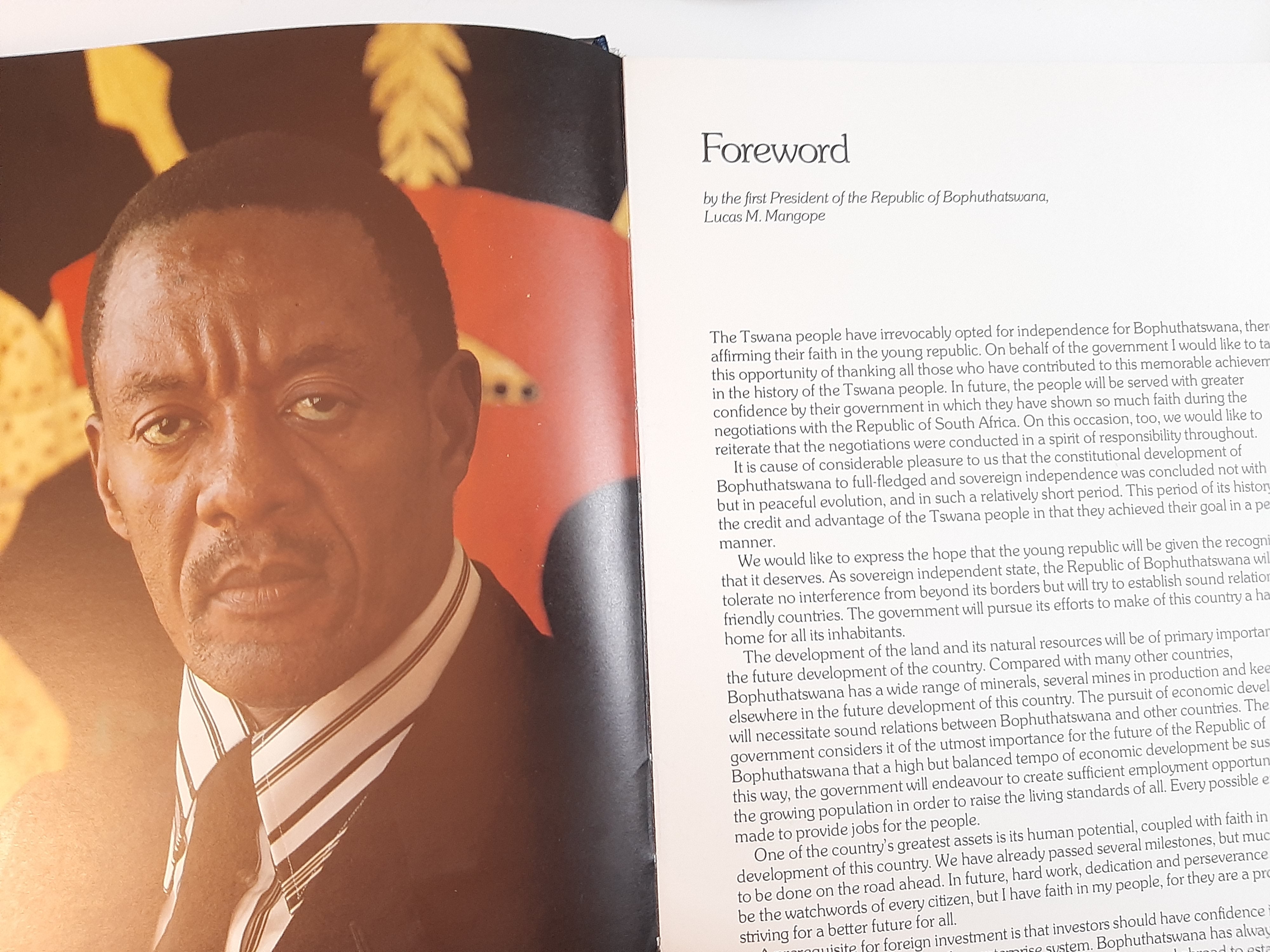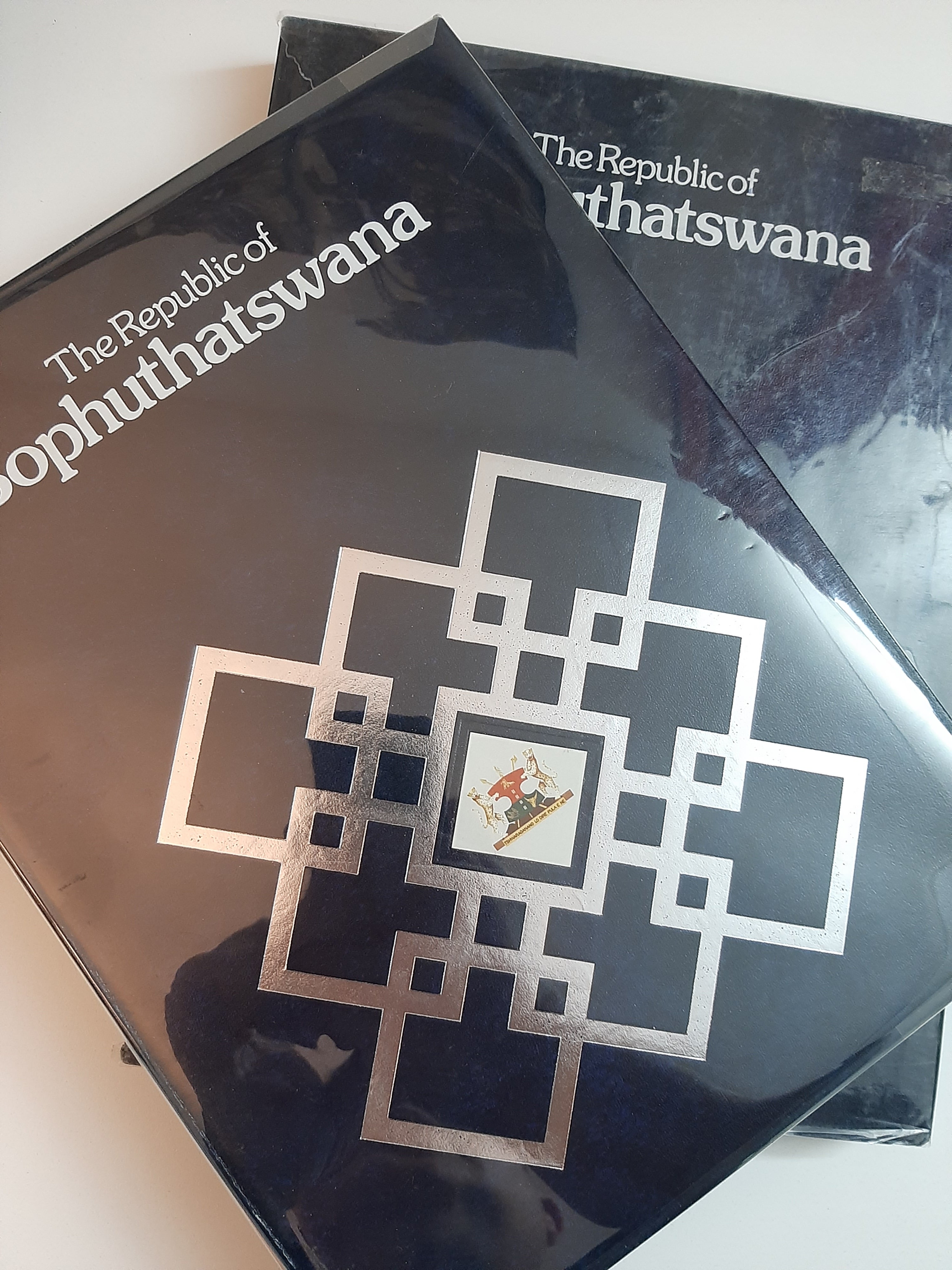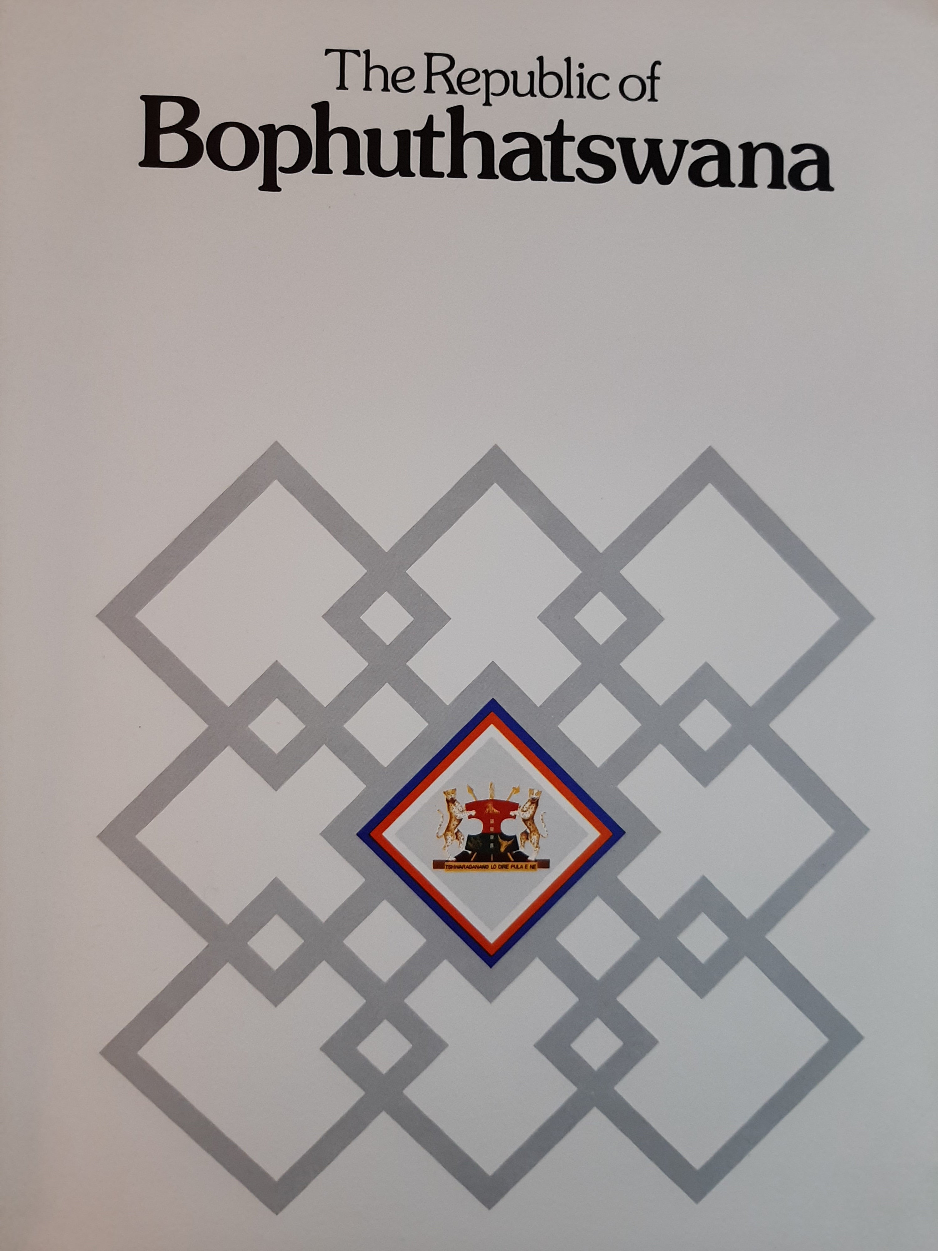 First Edition. Blu rexine covered boards with silver decoration. 216 pages of text, photographs and data. Spine titling bright and clean. Front cover bright and clean with heraldic crest to centre surrounded by tiled design in silver. Internally clean and tightly bound, with no inscriptions. Bophuthatswana was one of the "Independent states" created by the South African Government during the apartheid years.