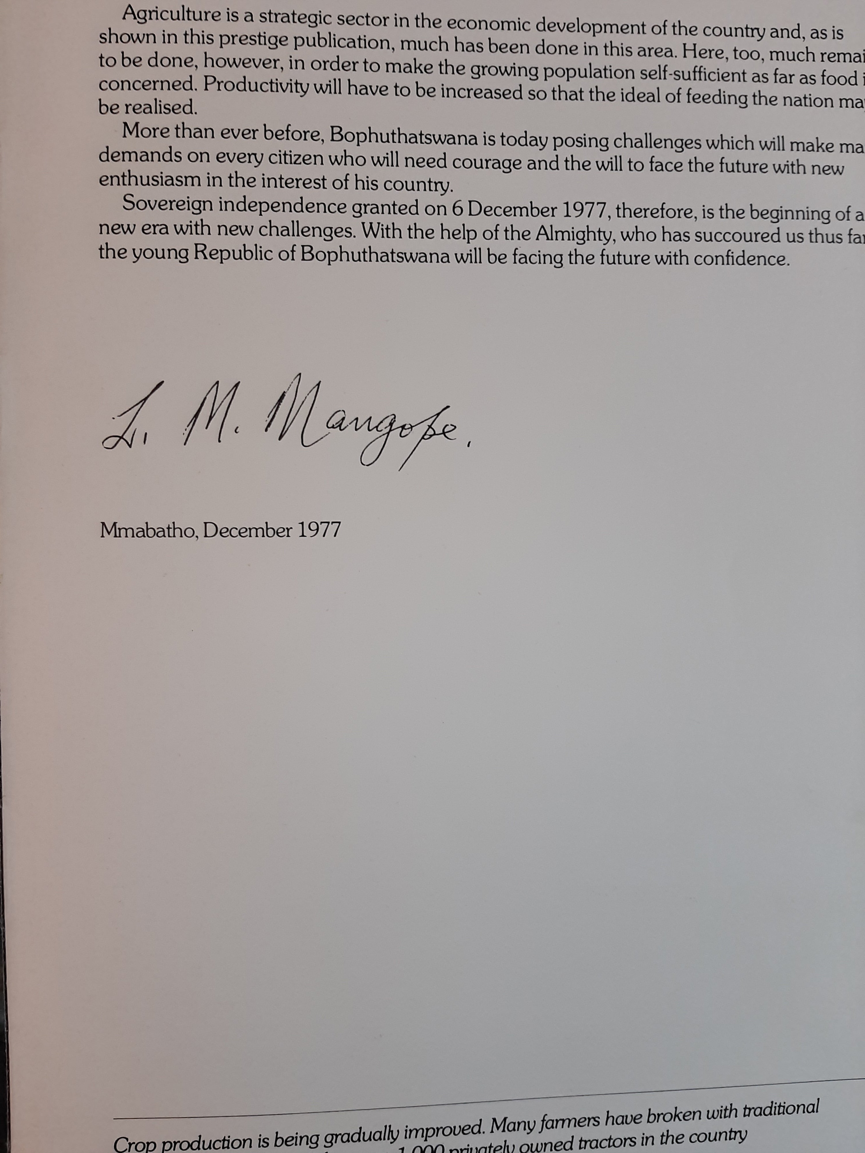 This lovely First Edition hardcover comes with its own slipcover. The book covers many aspects about the Republic of Bophuthatswana including the country, the People, the education and Vocational Trainng, Health and Human services, Justice, Agriculture, the national Economy Mining, Nature preservation and Tourism, Political Evolution and the sytem of Government as it was in 1977 when independent Bophuthatswana was first established.