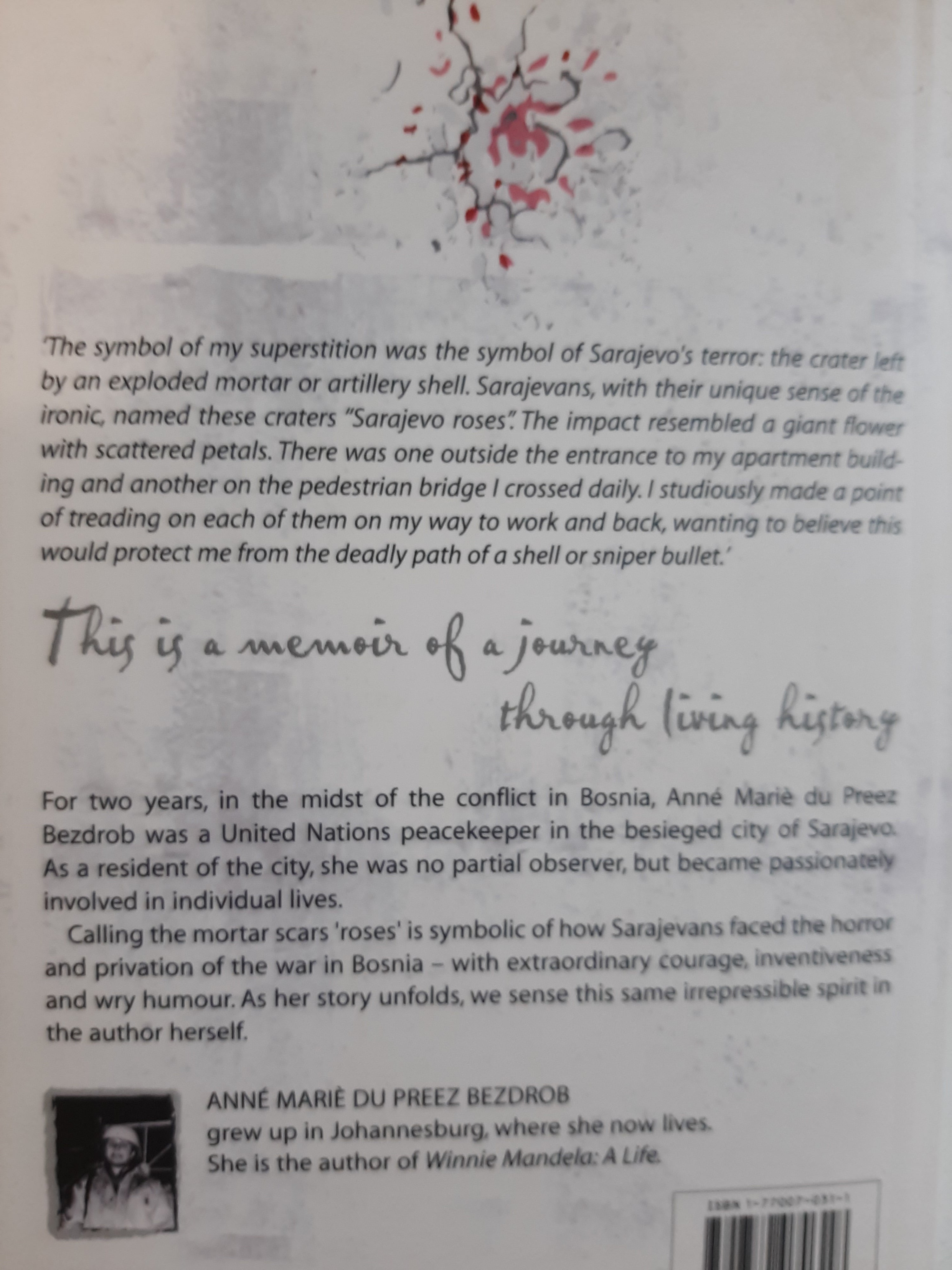 The symbol of my superstition was the symbol of Sarajevo's terror: the crater left by an exploded mortar or artillery shell. Sarajevans, with their unique sense of the ironic, named these 'Sarajevo roses'. There was one outside the entrance to my apartment building and another on the pedestrian bridge I crossed daily. I meticulously made a point of treading on each of them on my way to work and back, wanting to believe this would protect me from the deadly path of a shell or sniper bullet. For two years, in the midst of the conflict in Bosnia, Ann Mari du Preez Bezdrob was a United Nations peacekeeper in the besieged city of Sarajevo. As a resident of the city, she was no partial observer, but became passionately involved in individual lives, sharing the Sarajevans' terrors and hard-won joys. Calling the mortar scars 'roses' is symbolic of how Sarajevans faced the horror and privation of the war in Bosnia - with extraordinary courage, inventiveness and wry humor. As her story unfolds, we sense this same irrepressible spirit in the author herself.