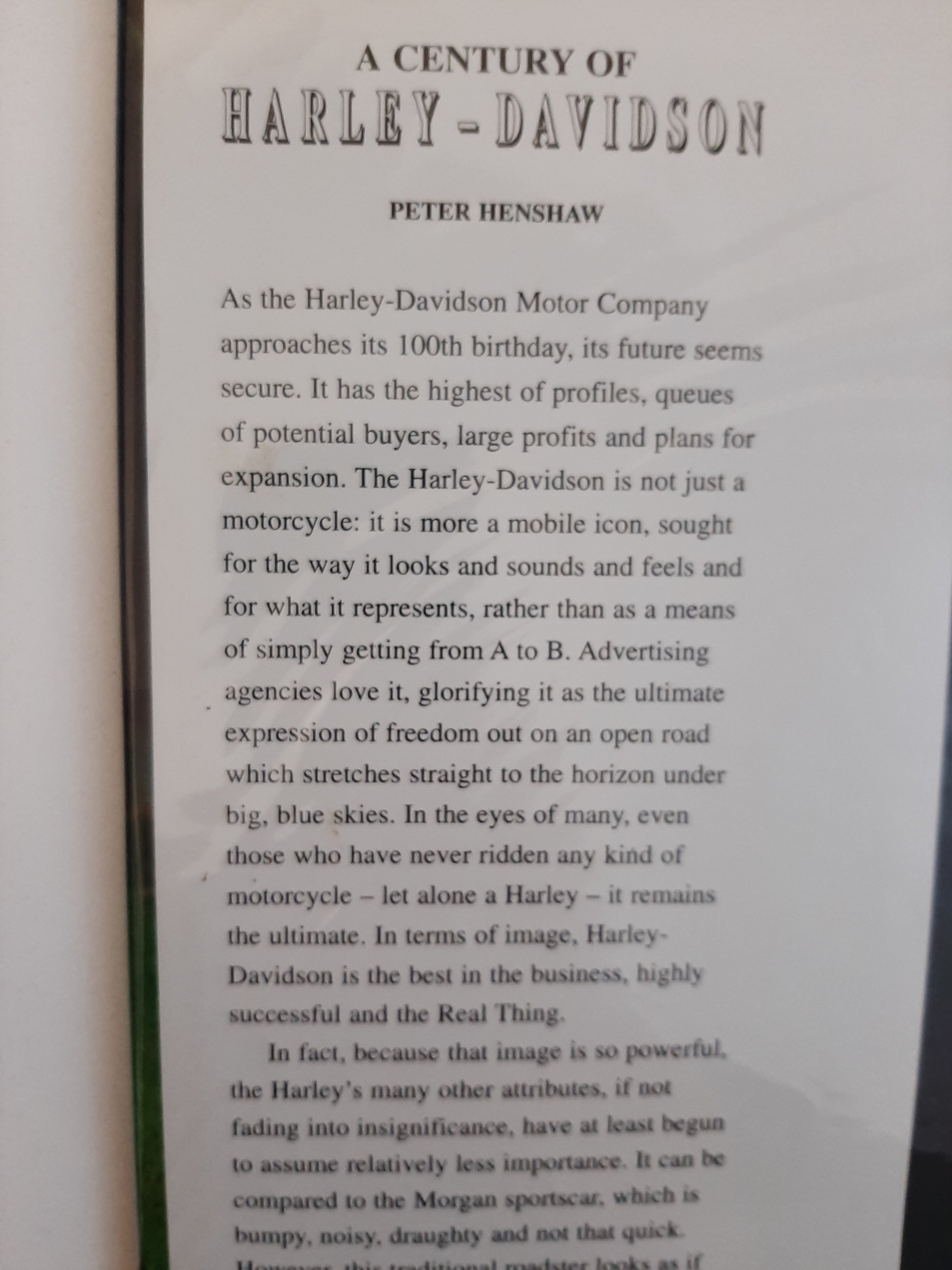 As the Harley-Davidson Motor Company approaches its 100th birthday, its future seems secure. It has the highest of profiles, queues of potential buyers, large profits and plans for expansion. The Harley-Davidson is not just a motorcycle; it is more a mobile icon, sought for the way it looks and sounds and for what it represents, rather than as a means of simply getting from A to B.