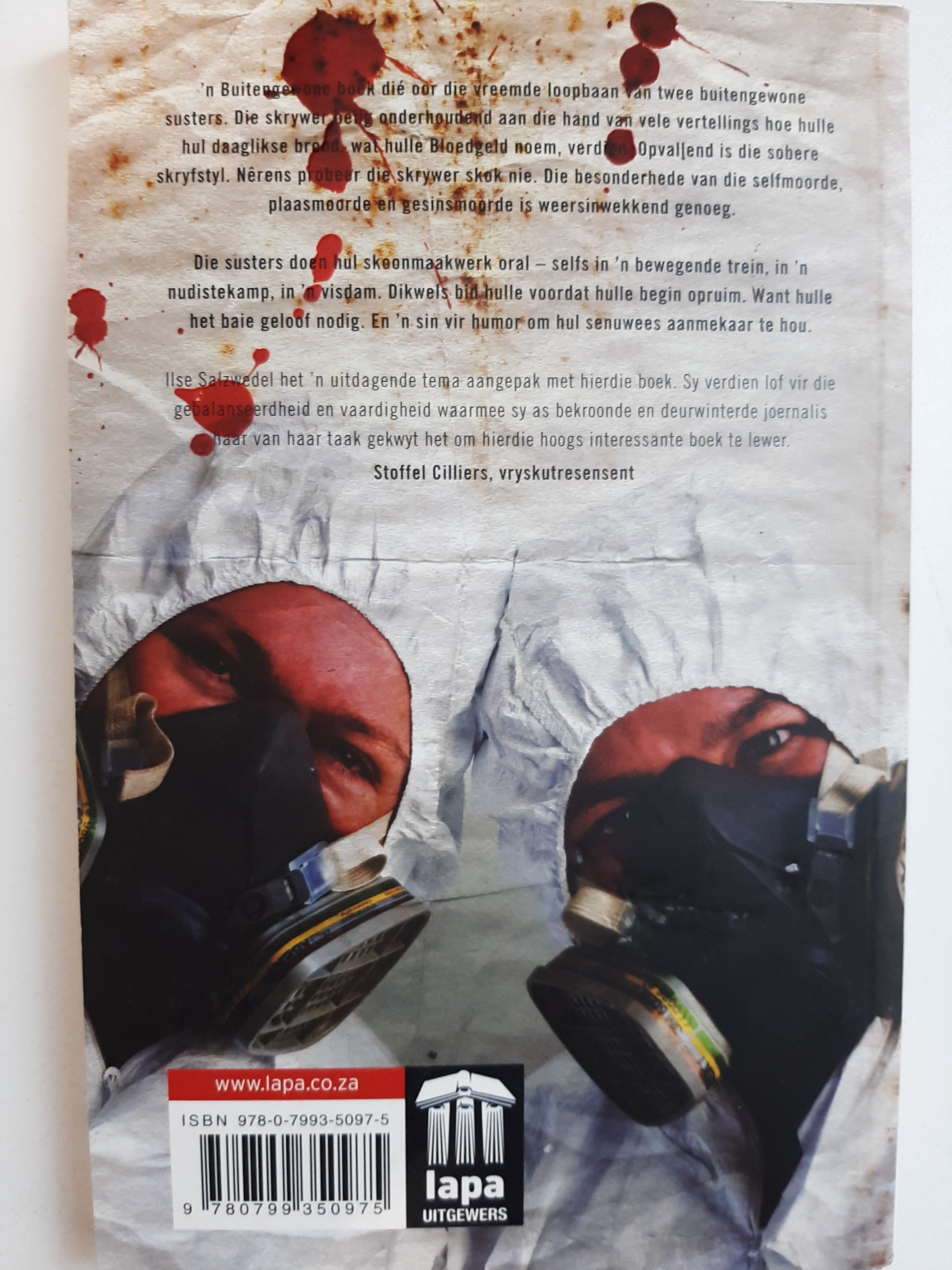 'n Buitengewone boek oor die vreemde loopbaan van twee buitengewone susters. Die skrywer belig onderhoudend aan die hand van vele vertellings hoe hulle hul daaglikse brood, wat hulle Bloedgeld noem, verdien. Die besonderhede van die selfmoorde, plaasmoorde en gesinsmoorde is weersinwekkend genoeg. Die susters doen hulle skoonmaakwerk oral - selgs in 'n bewegende trein, in 'n nudistekamp, in 'n visdam. Dikwels bid hulle voordat hulle begin opruim. Want hulle het baie geloof nodig. En 'n sin vir humor om hul senuwees aanmekaar te hou.