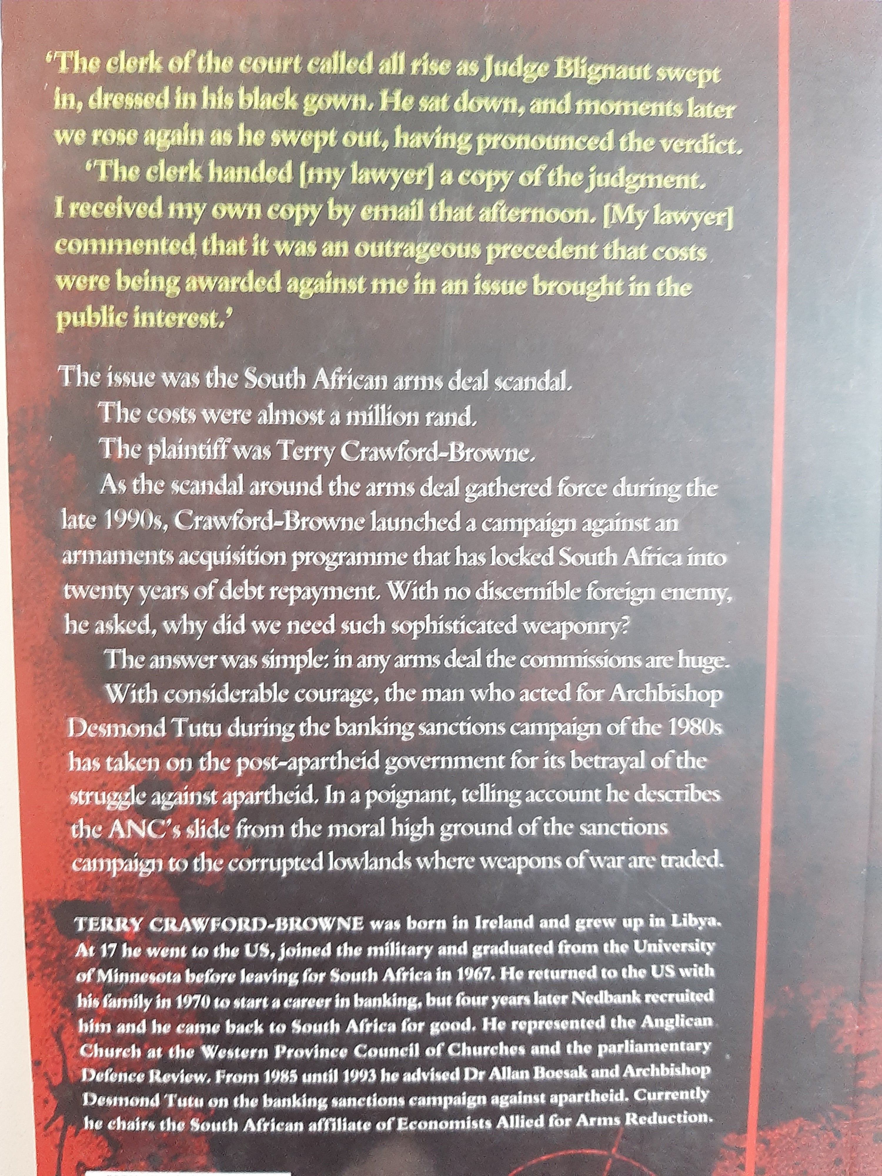 'The clerk of the court called all rise as Judge Blignaut swept in, dressed in his black gown. He sat down, and moments later we rose again as he swept out, having pronounced the verdict. 'The clerk handed [my lawyer ] a copy of the judgement. I received my own copy by email that afternoon. [My lawyer] commented that it was an outrageous precedent that costs were being awarded against me in an issue brought in the public interest.' The issue was the South African arms deal scandal. The costs were almost a million rand. The plaintiff was Terry Crawford-Browne. As the scandal around the arms deal gathered force during the late 1990s, Crawford-Browne launched a campaign against an armaments acquisition programme that has locked South Africa into twenty years of debt repayment. With no discernible foreign enemy, he asked, why did we need such sophisticated weaponry? The answer was simple: in any arms deal the commissions are huge. With considerable courage, the man who acted for Archbishop Desmond Tutu during the banking sanctions campaign of the 1980s has taken on the post-apartheid government for its betrayal of the struggle against apartheid. In a poignant, telling account he describes the ANC's slide from the moral high ground of the sanctions campaign to the corrupted lowlands where weapons of war are traded.