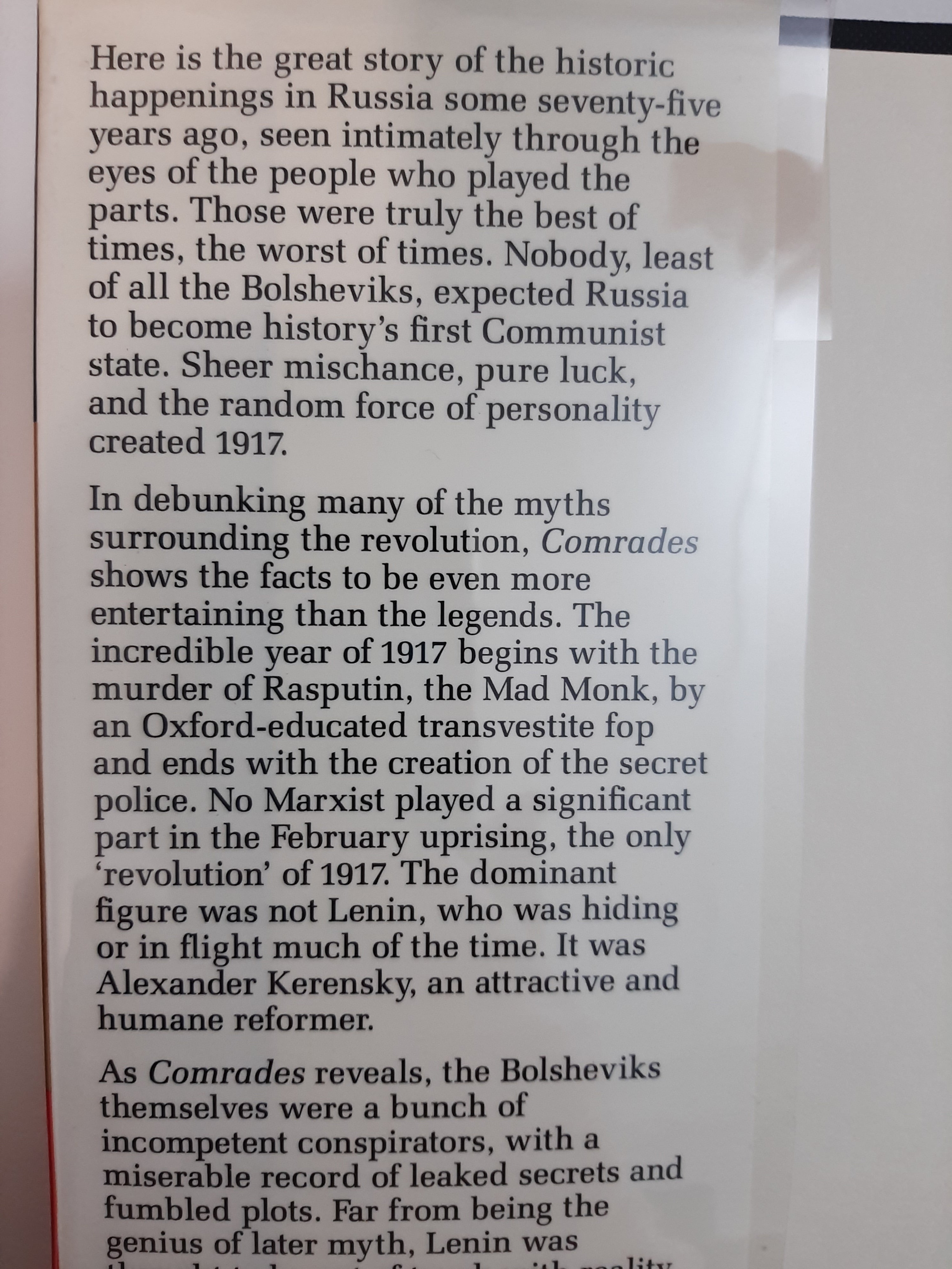 "Few things in 1917 were as curious, on the face of it, as the inability of other socialists to realize the fate the Bolsheviks had in store for them. Their reluctance to condemn the Leninists was partly a matter of gross ignorance. Few had read the works in which Lenin made clear that he saw terrorism and dictatorship as essential parts of revolution. His works had been banned before the revolution. After it, events moved too fast for people to have time to work through the back list of his works. All had had access to Pravda, however, from which it was obvious that he regarded socialist as much as capitalist rivals to be candidates for liquidation.